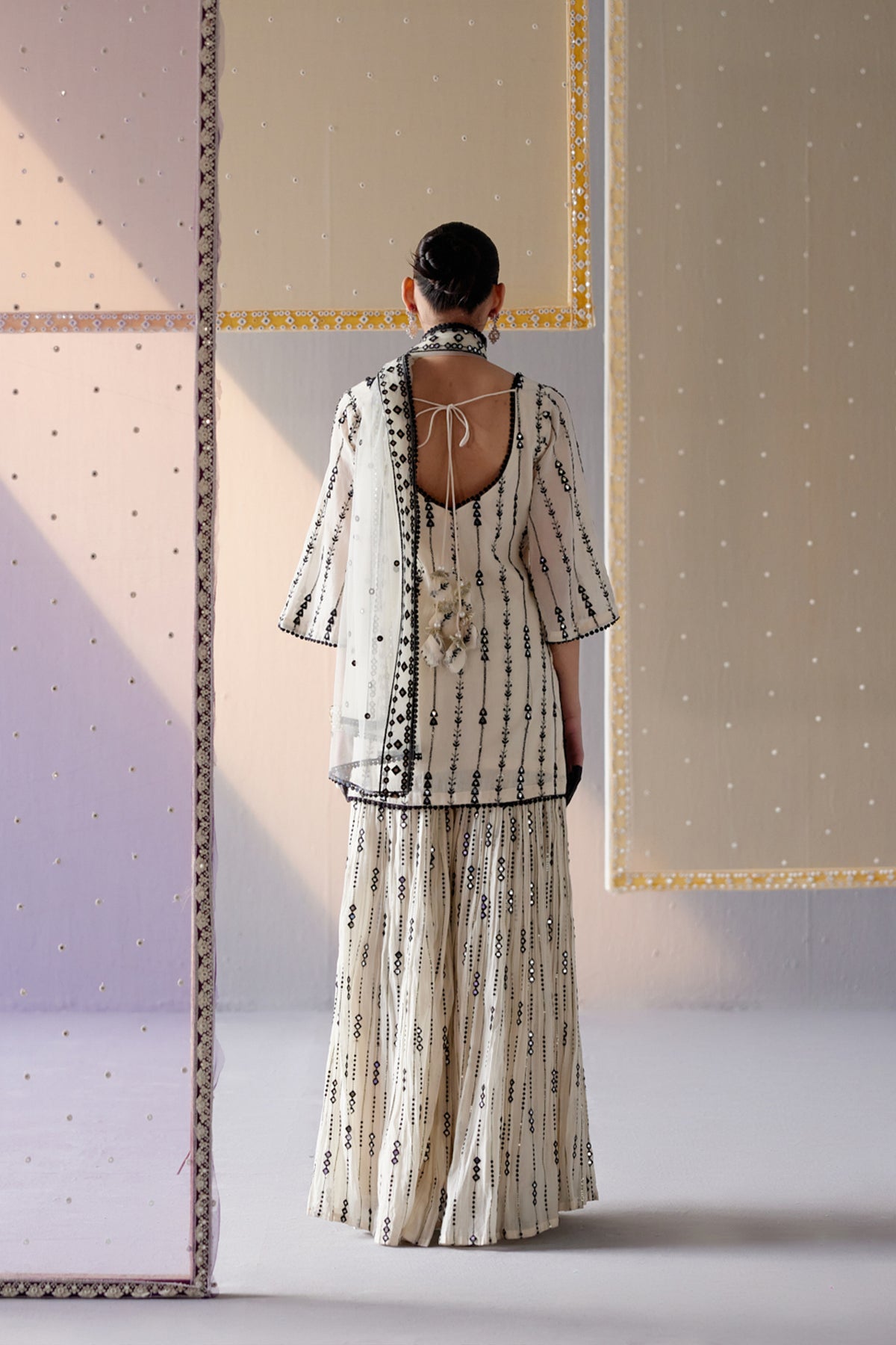 Black white 2d 3d bail straight sharara with dupatta