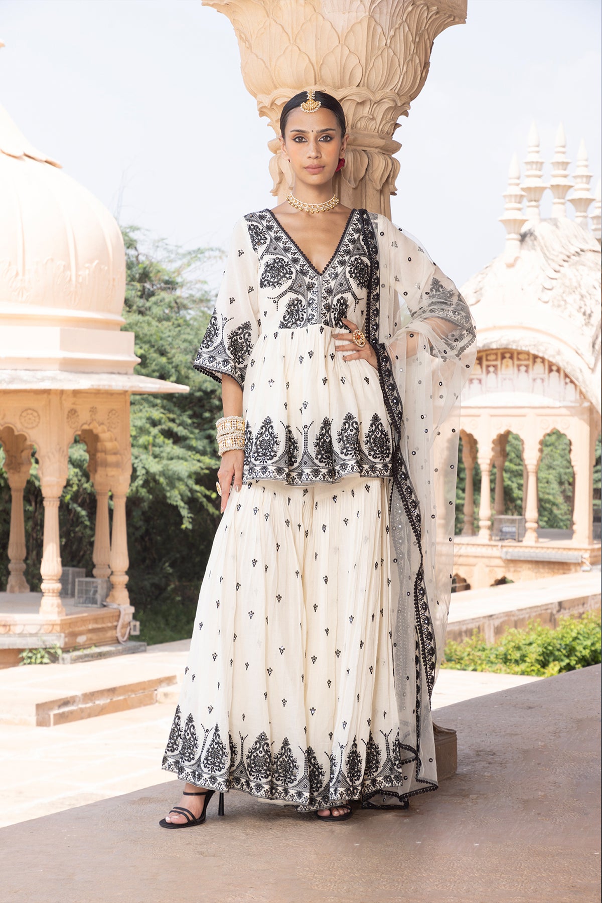 Black White All Over Embroidered Tower Peplum Sharara With Dupatta