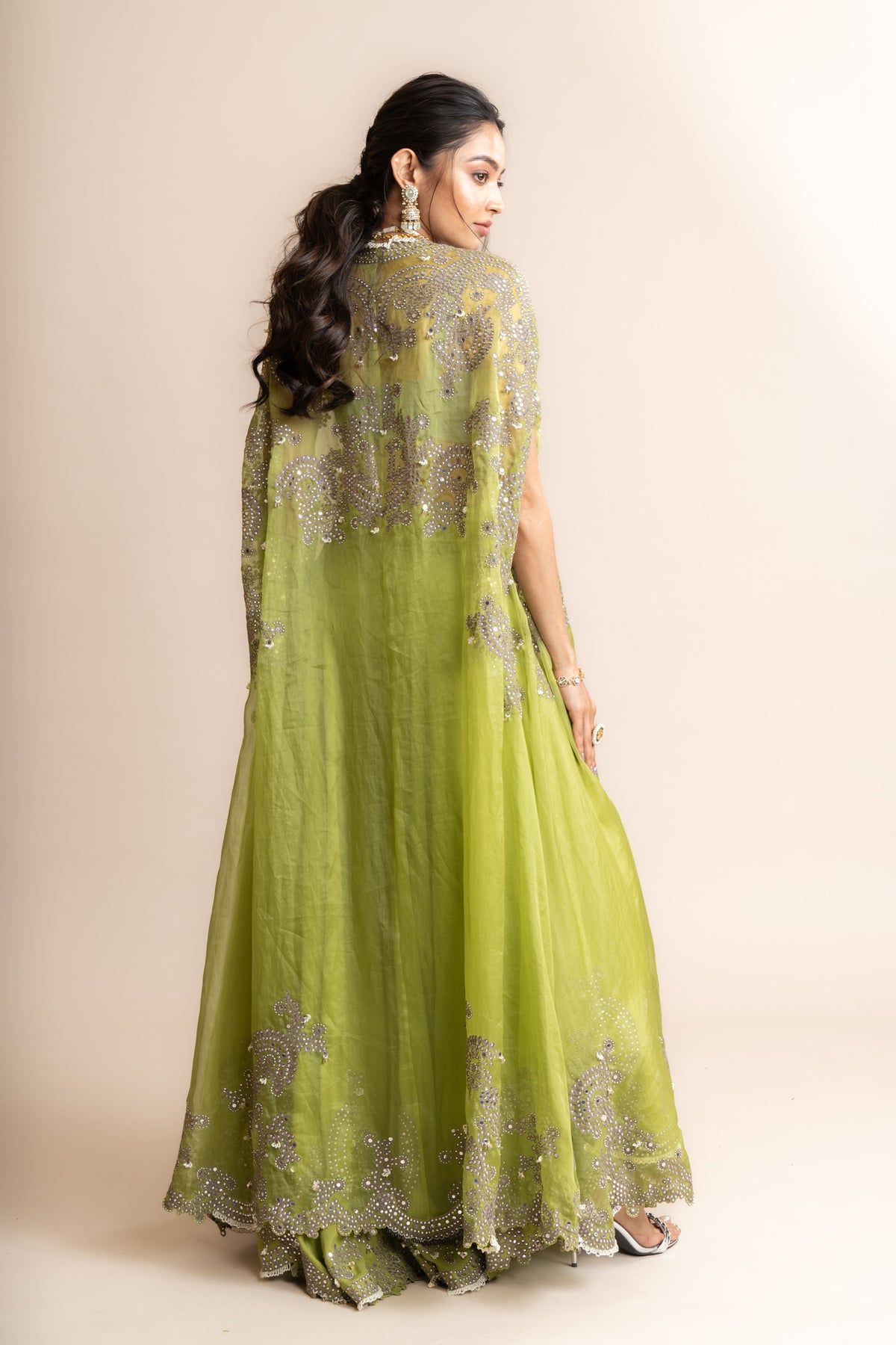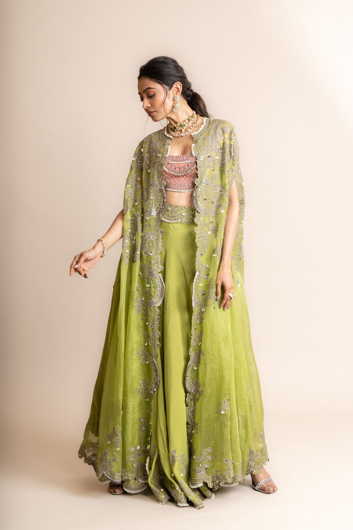 Pista hand embroidered circular pants and old-rose yoke blouse with pista shoulder gather cape
