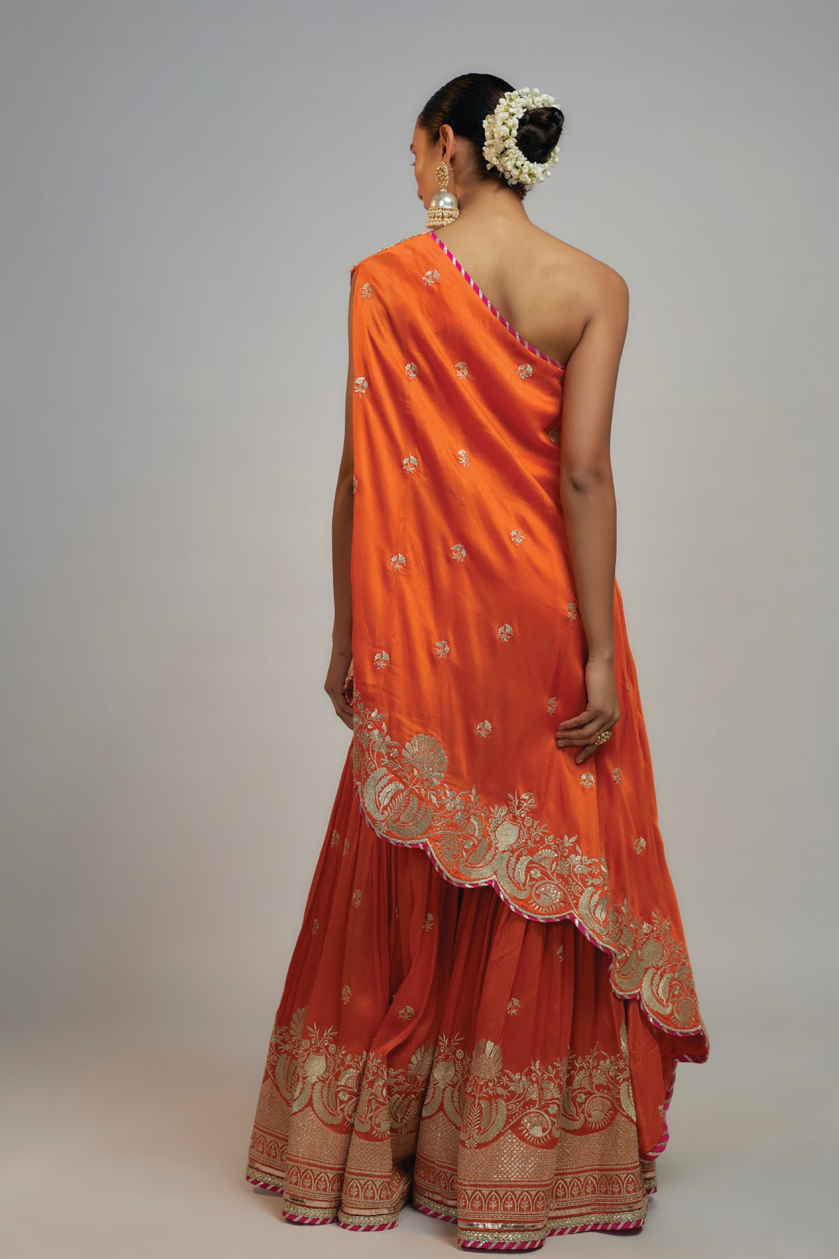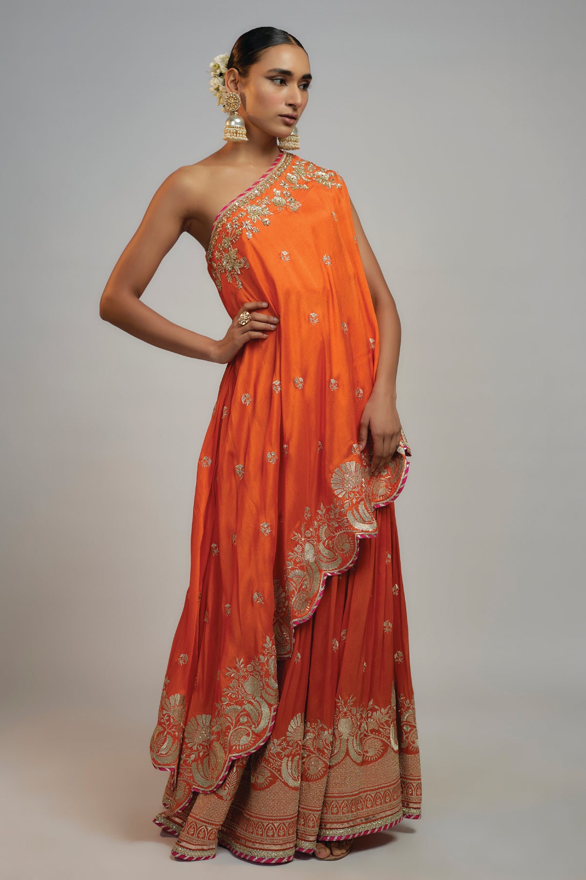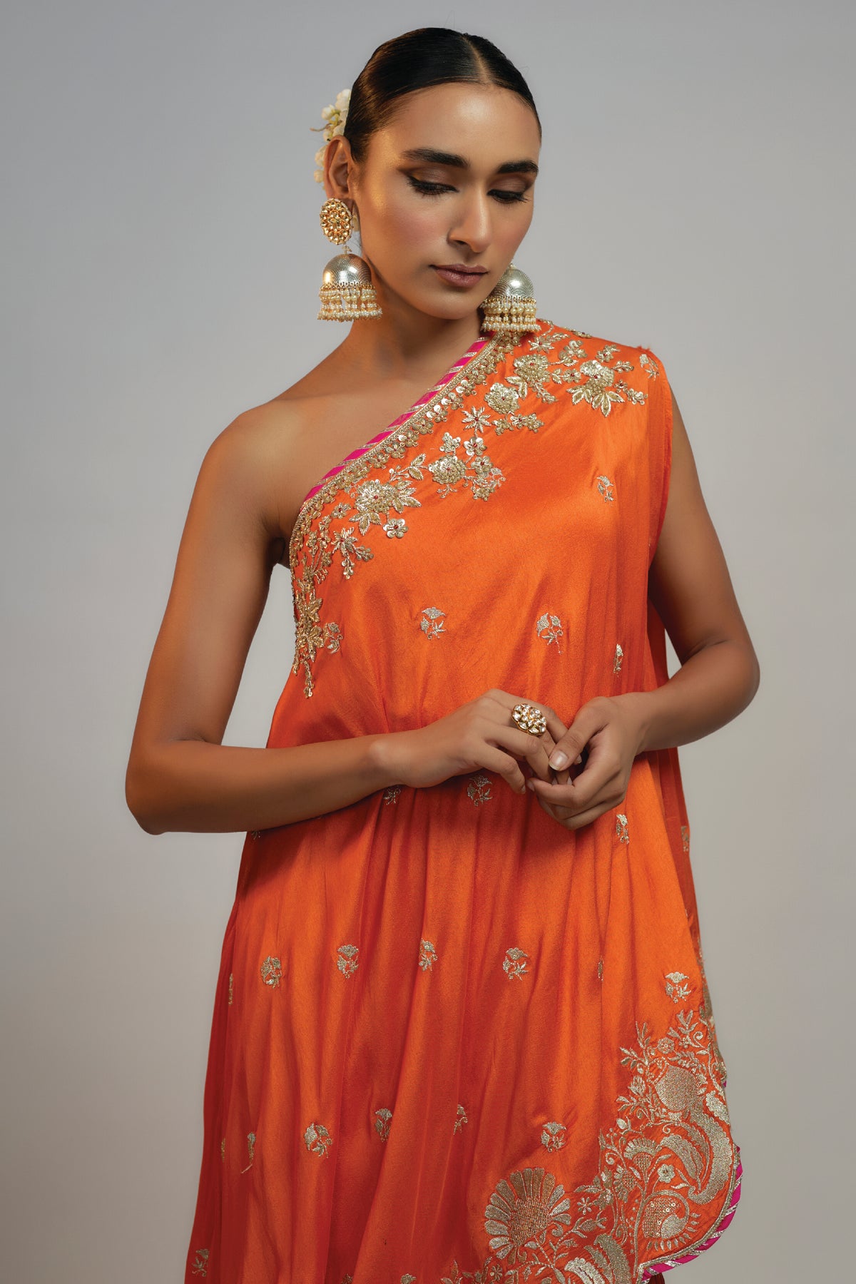 This stylish Indo-Western set blends bold femininity with a smart, one-shoulder top paired with sharara featuring delicate gold embroidery. Tailored for events, providing the versatility to flow seamlessly with your movements and leave a lasting impression.