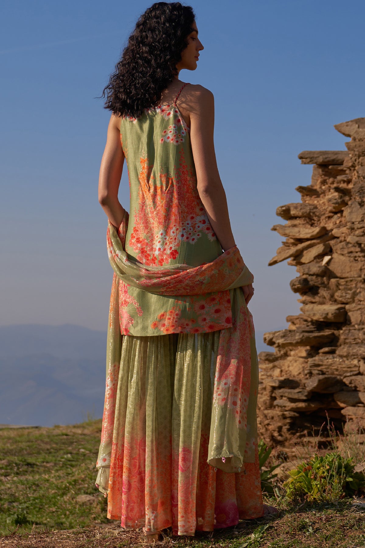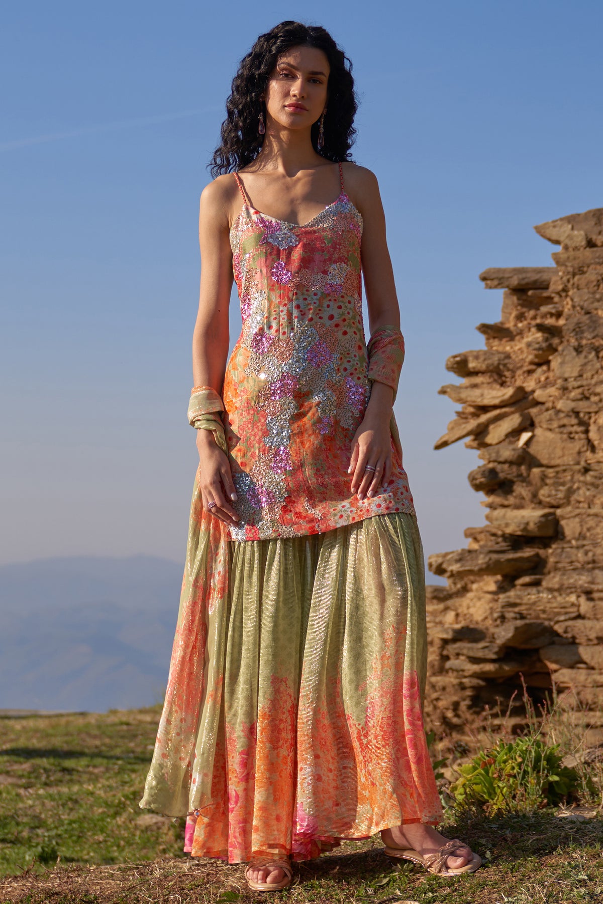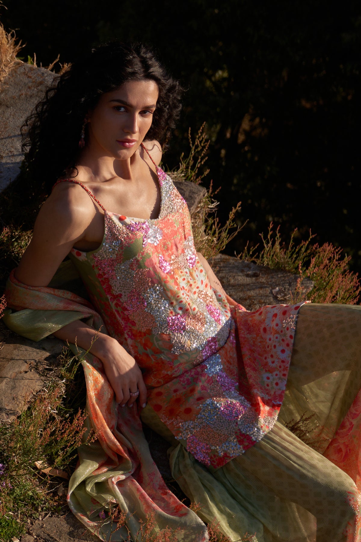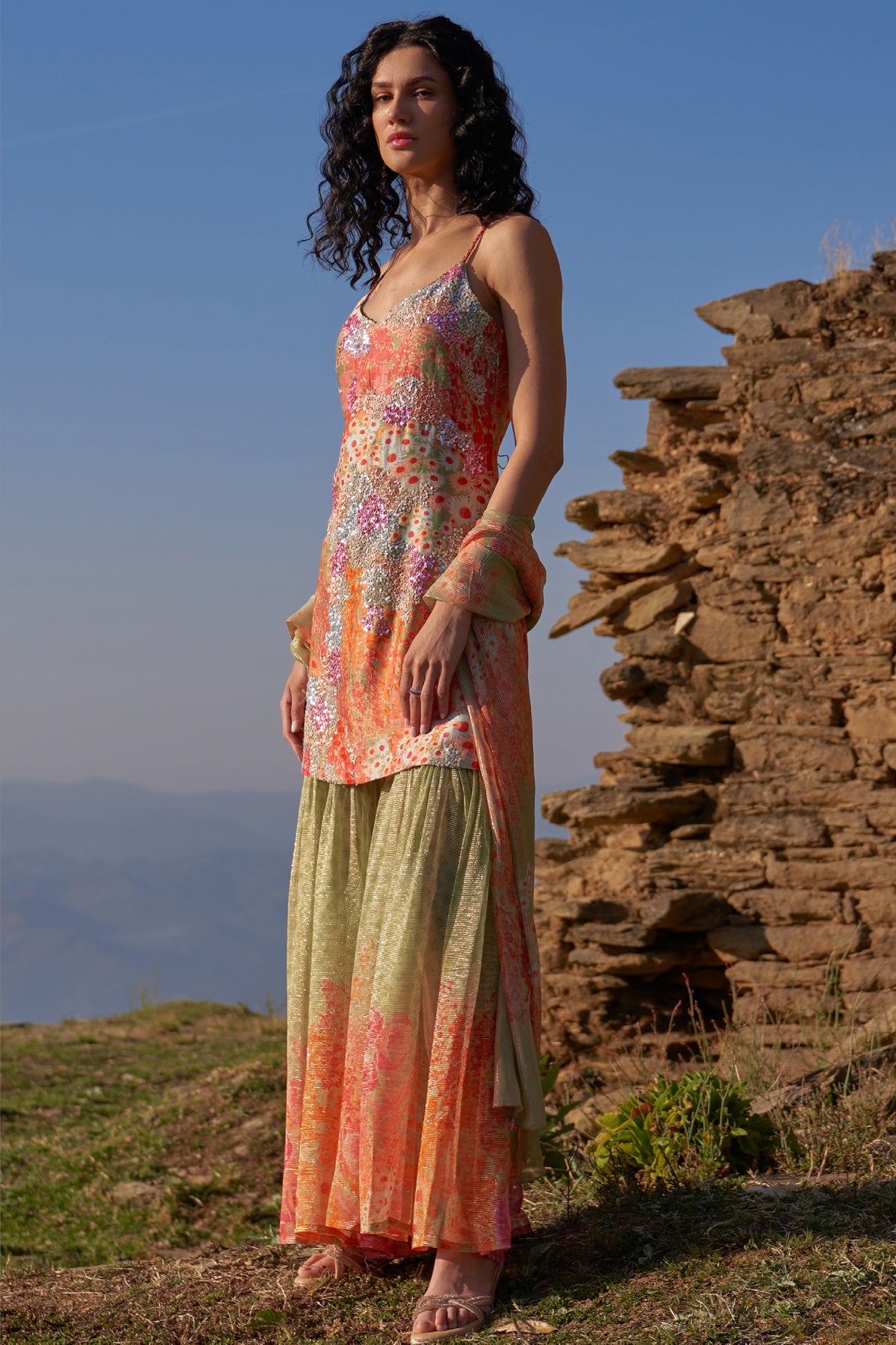The chicory sharara set is our modern take on the traditionally sharara's the top is made of digitally printed natural bemberg silk styled with delicate shoulder straps and paired with georgette shimmer printed sharara pants and dupatta