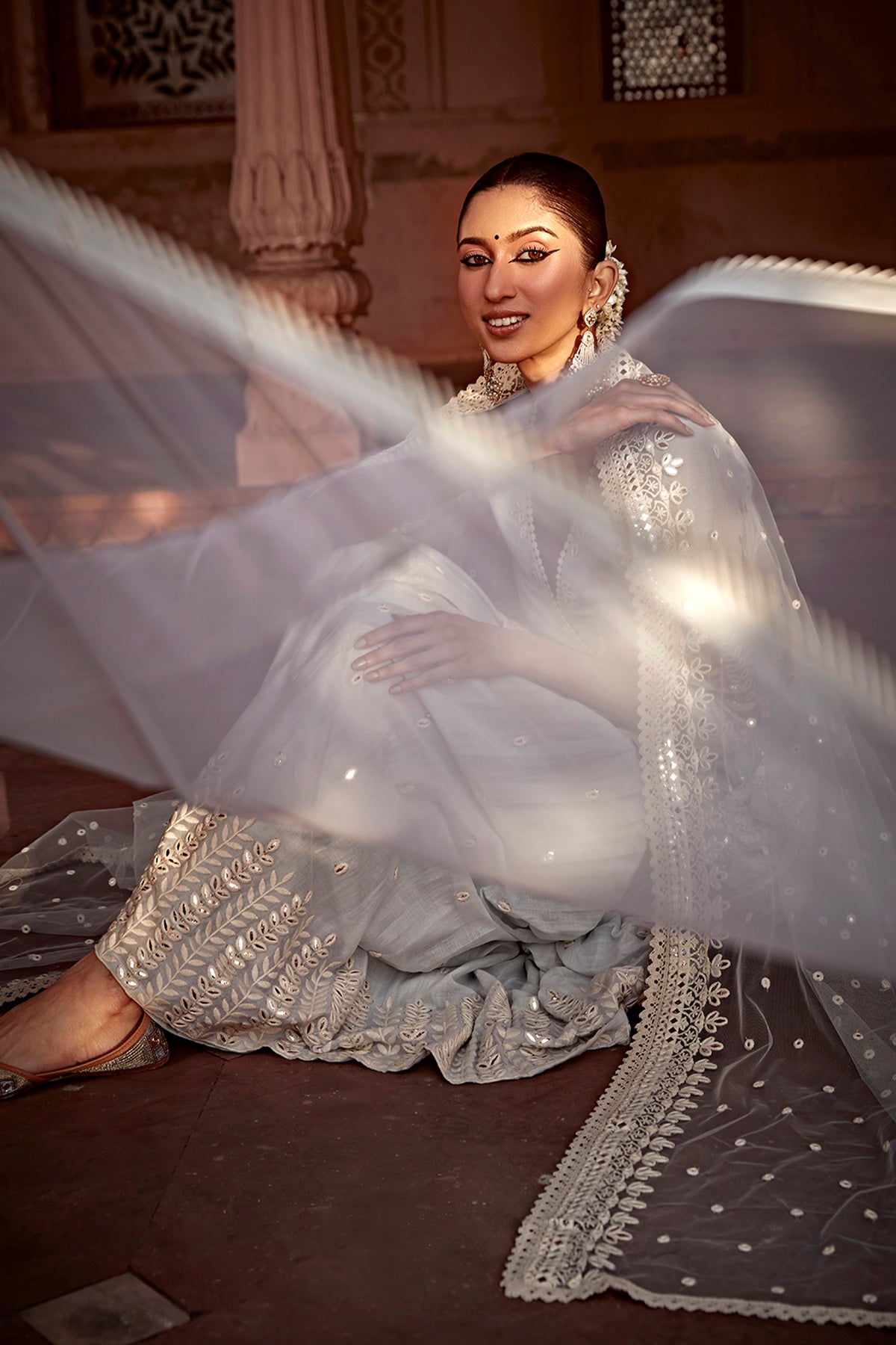 Preevin Ice Blue Leaf Peplum Sharara indian designer wear online shopping melange singapore
