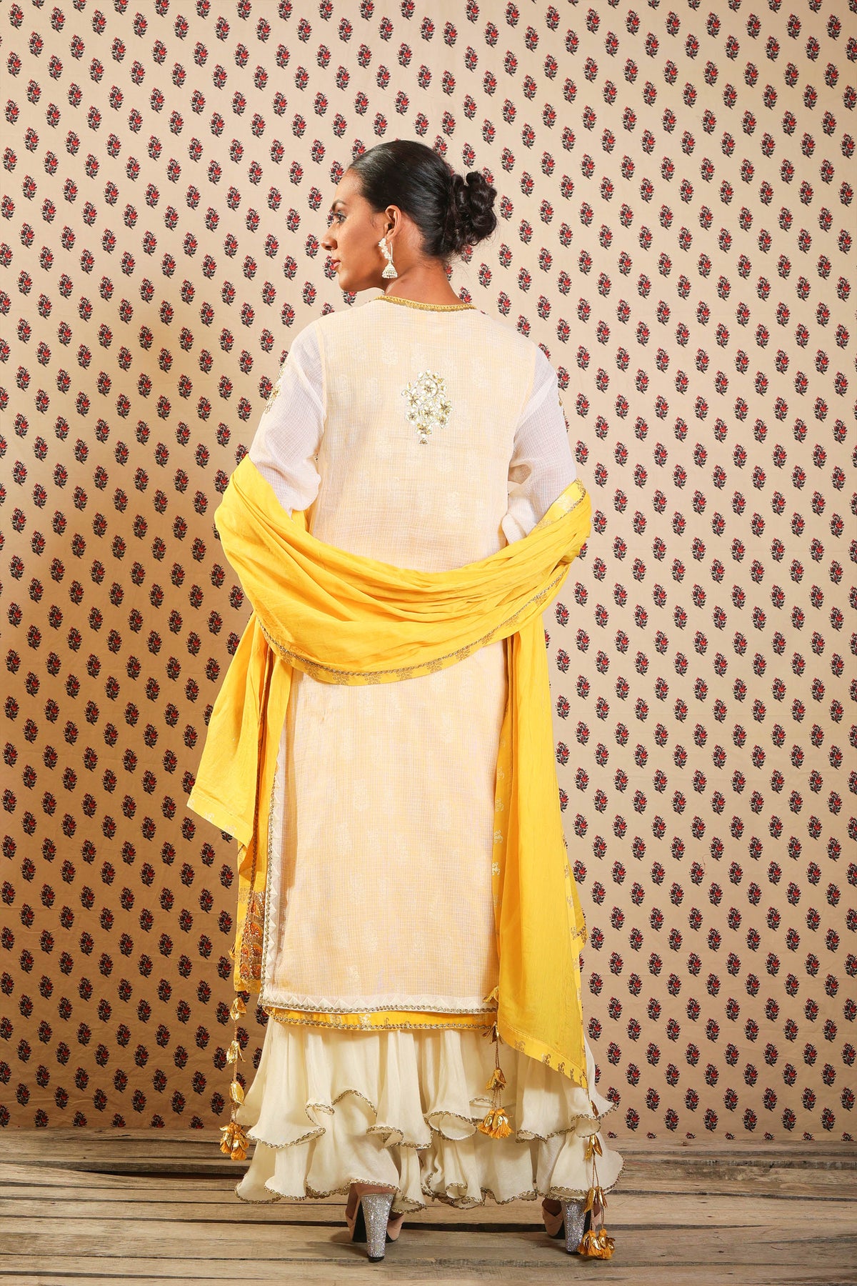 Ivory hand woven jamdani murshidabad cotton kurta with fully hand embroidered motifs. Each motifs are hand embroidered in antique gold, dabka and zardosi and neckline with antique coin hand embroidery paired with soft gauze cotton skirt with antique gota border and hand woven kota doria dupatta with scallop hand embroidery finished with hand crafted gota flower tassel