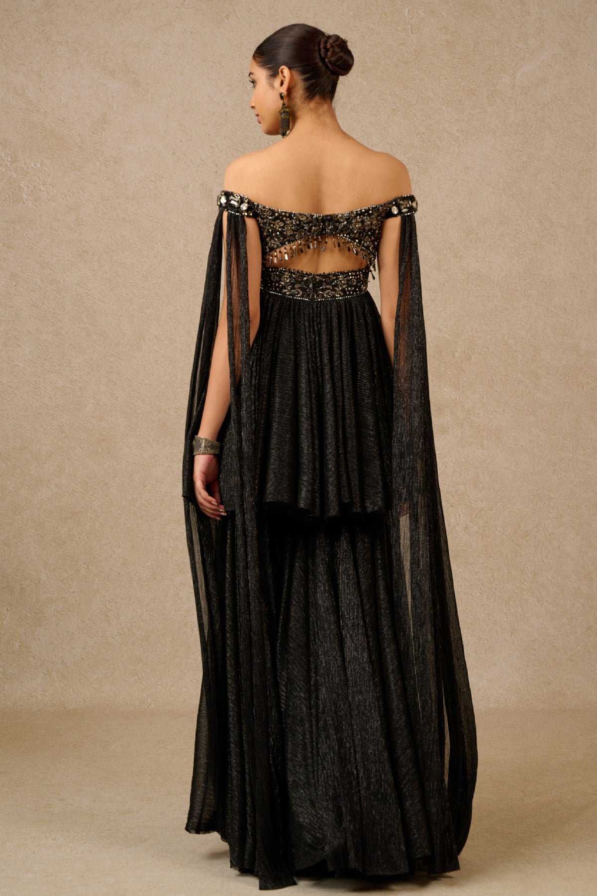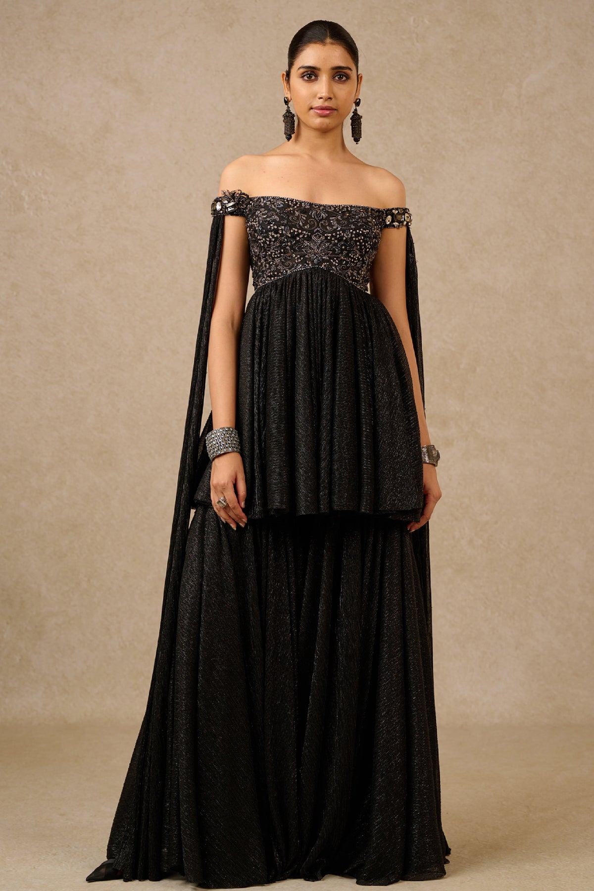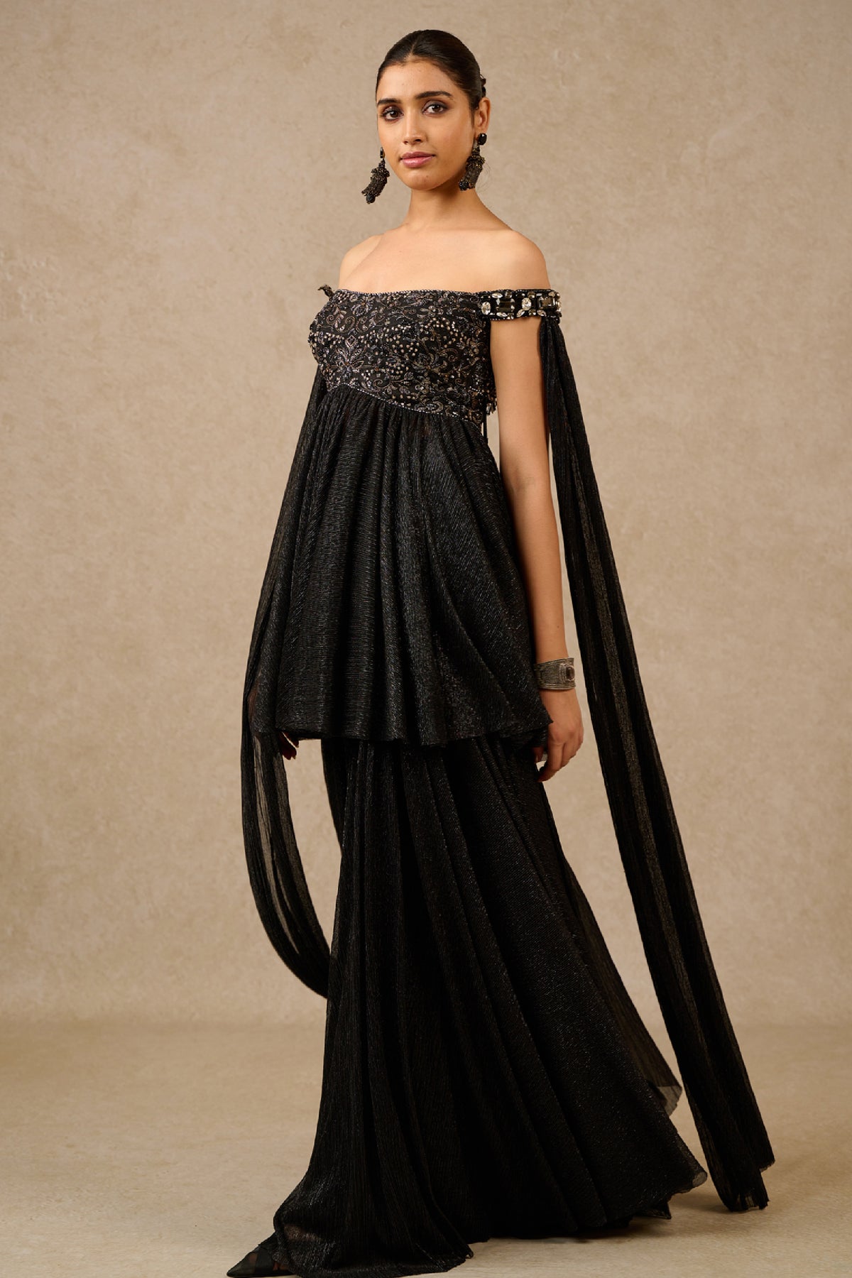 Our crinkle sharara is paired with a matching crinkle kurti which is highlighted with sequin embroidery on the bodice. The kurti is detailed with latkan and comes attached with jeweled wings.