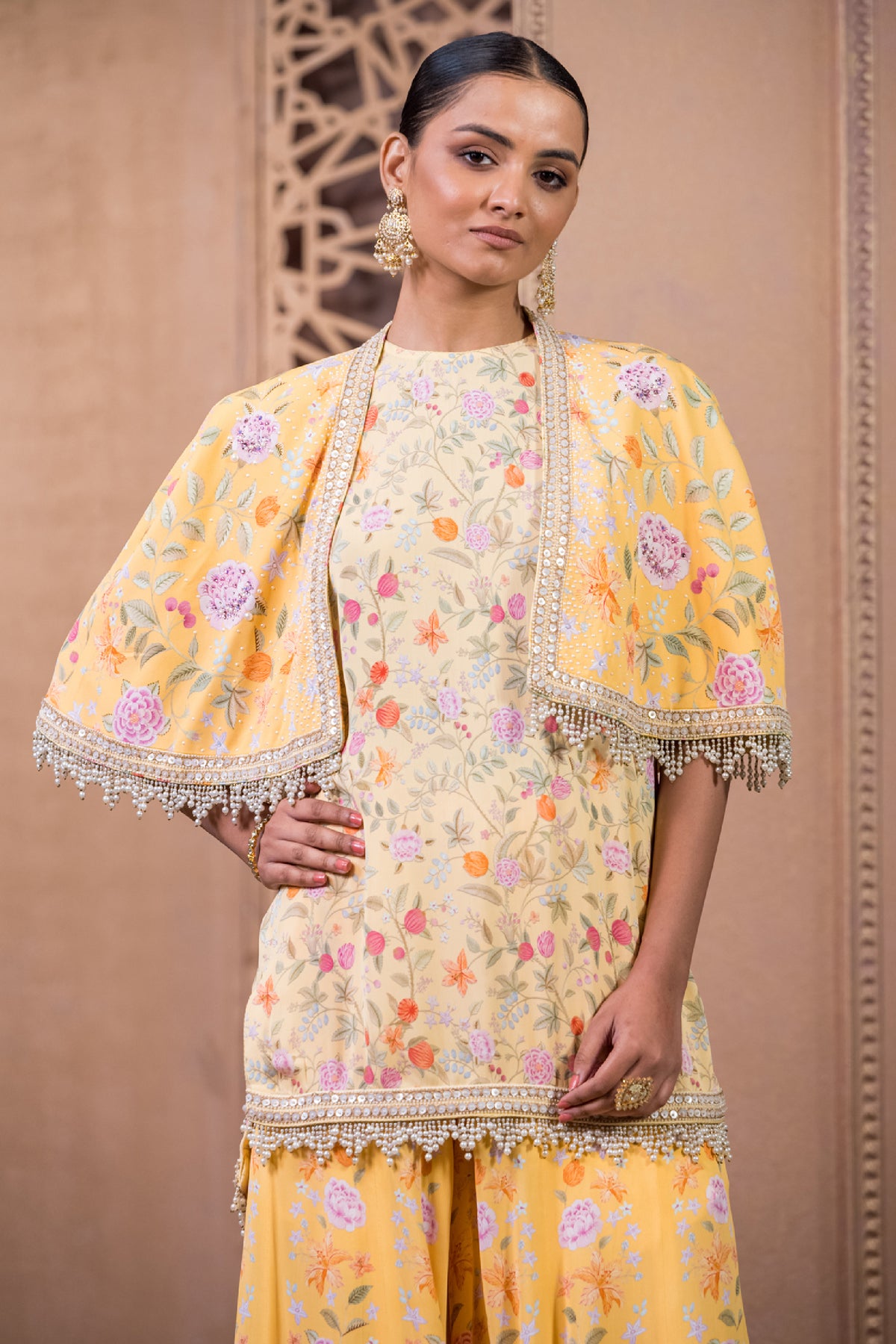 This is our print-on-print kurti and sharara set with a contrast floral print. The kurti is made in modal satin and is paired with a georgette cape and both are uplifted with delicate borders and crystal fringes