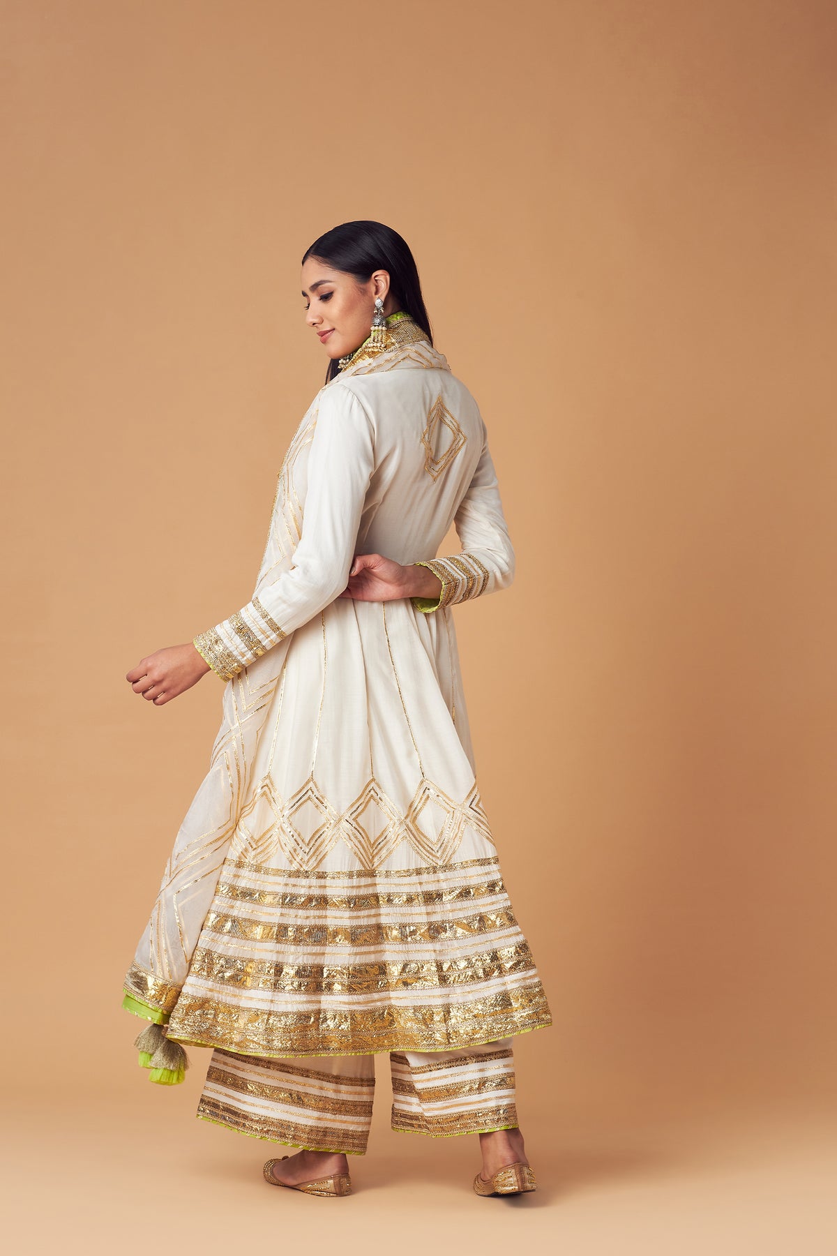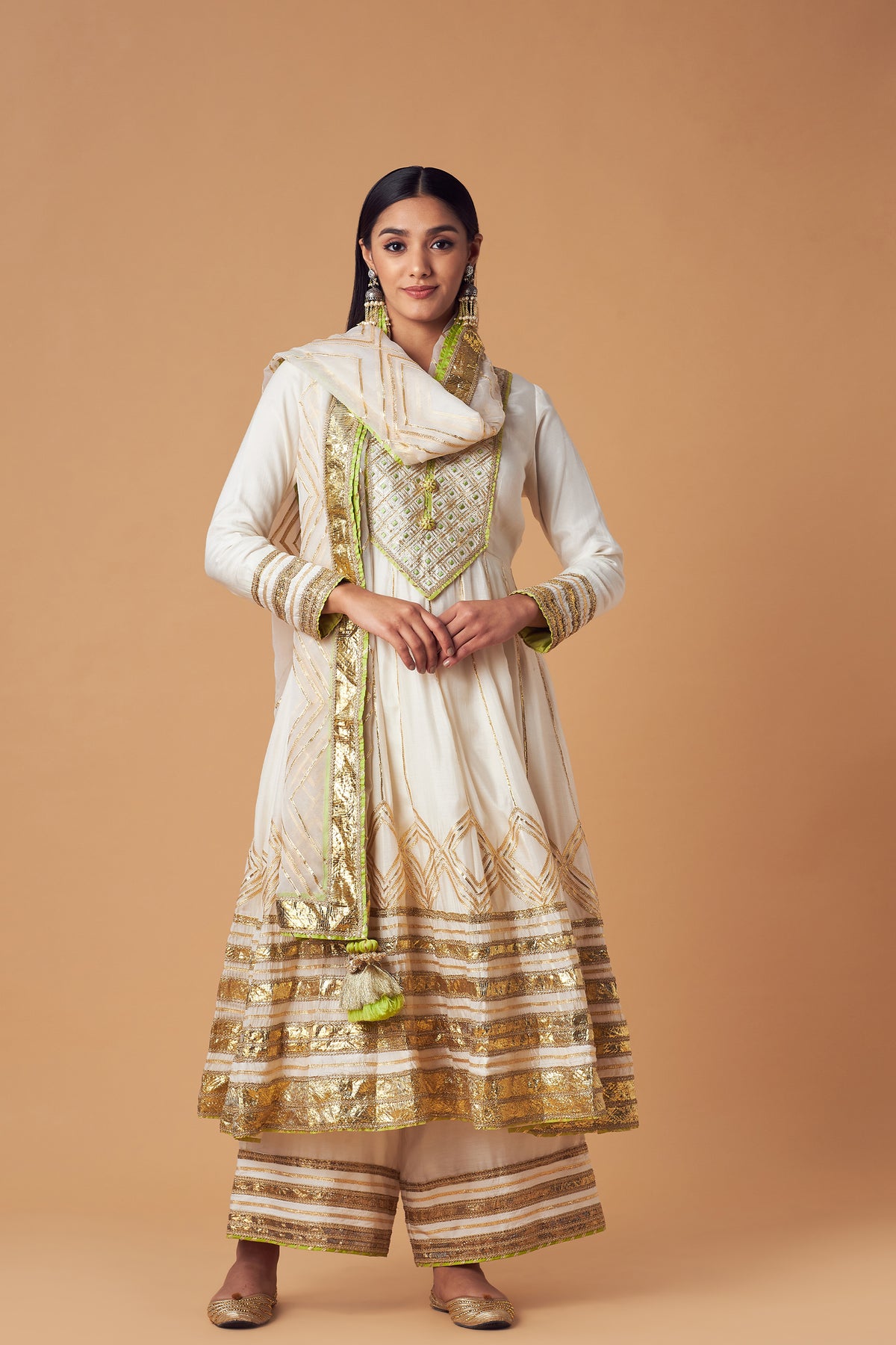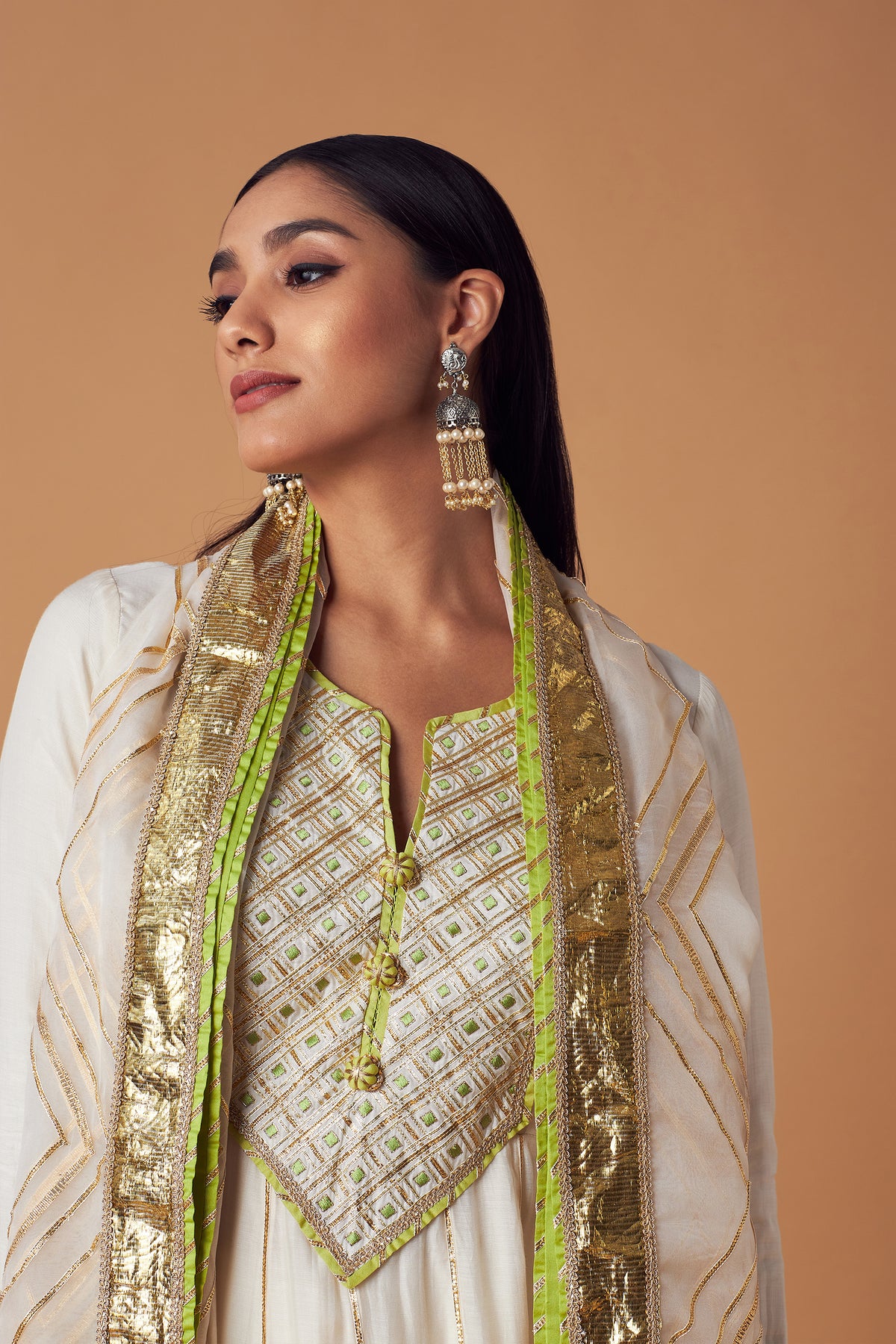 Gota embroidered and thread highlighted kurta is paired with a cotton silk vintage gota sharara and an organza gota dupatta