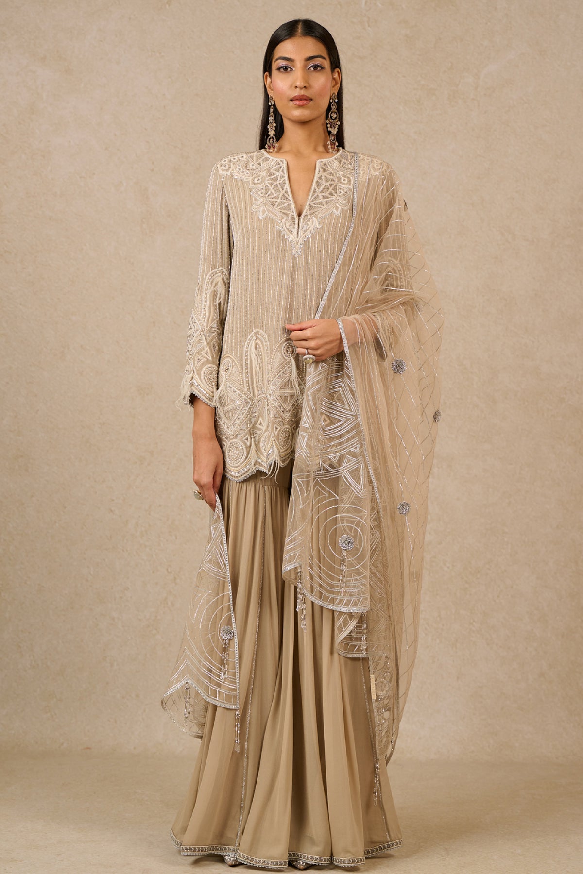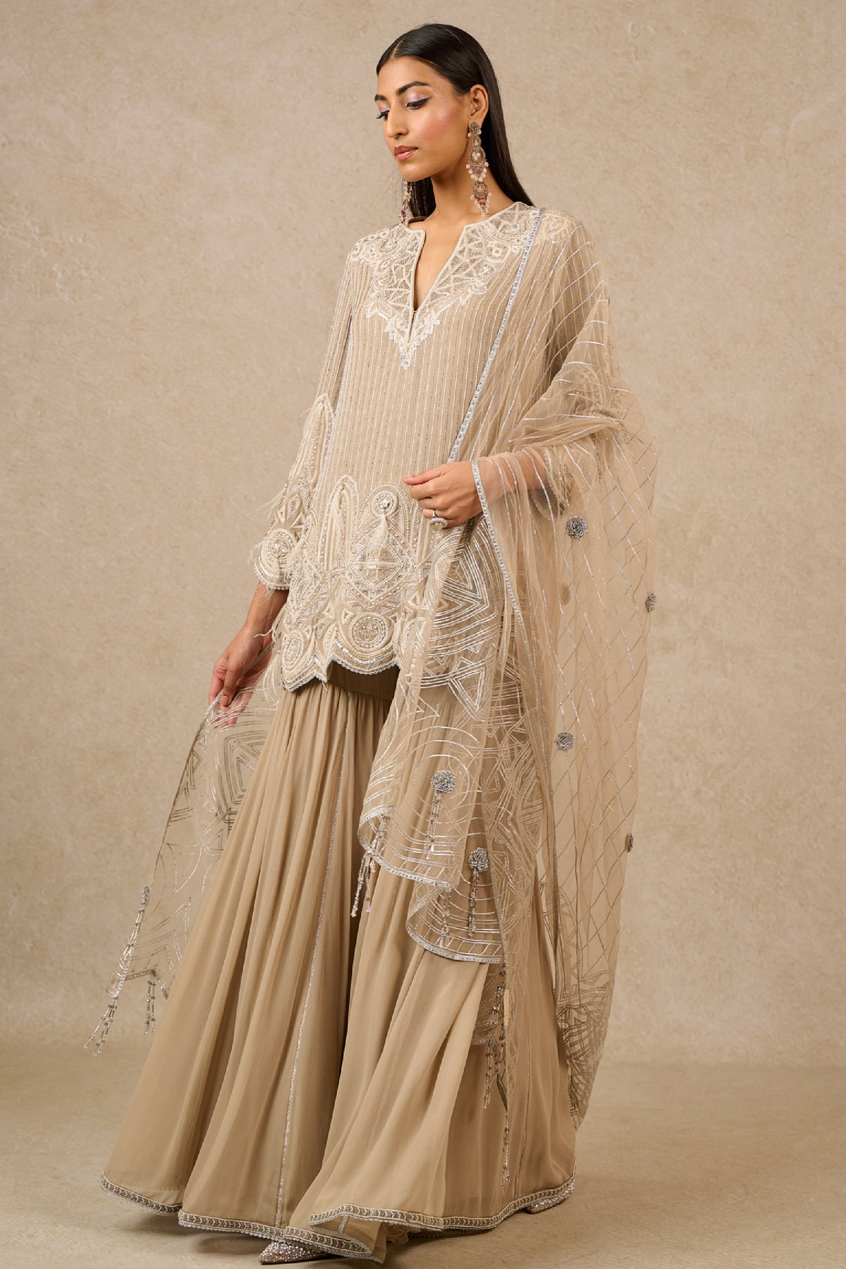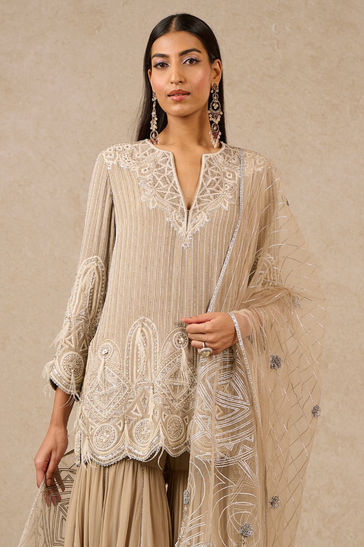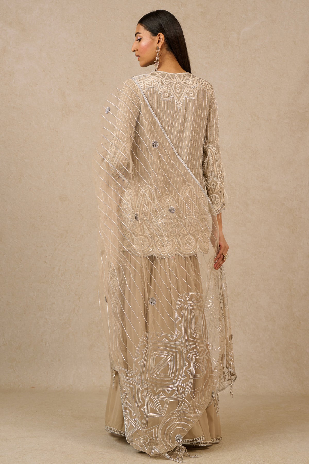 Our georgette sharara is laced with a minimal border and comes with a hand-embroidered georgette kurti with feather detailing. The set is completed with a textured tulle dupatta highlighted with crystals, and further embroidered with 3D flowers.