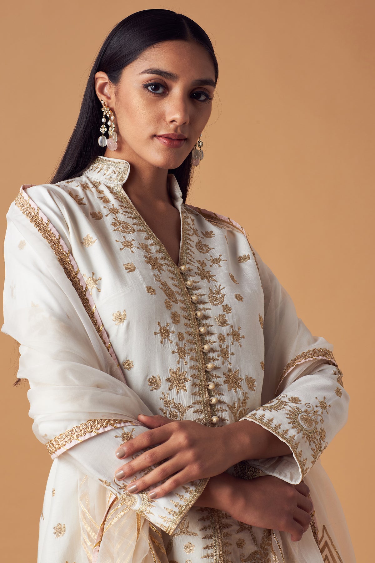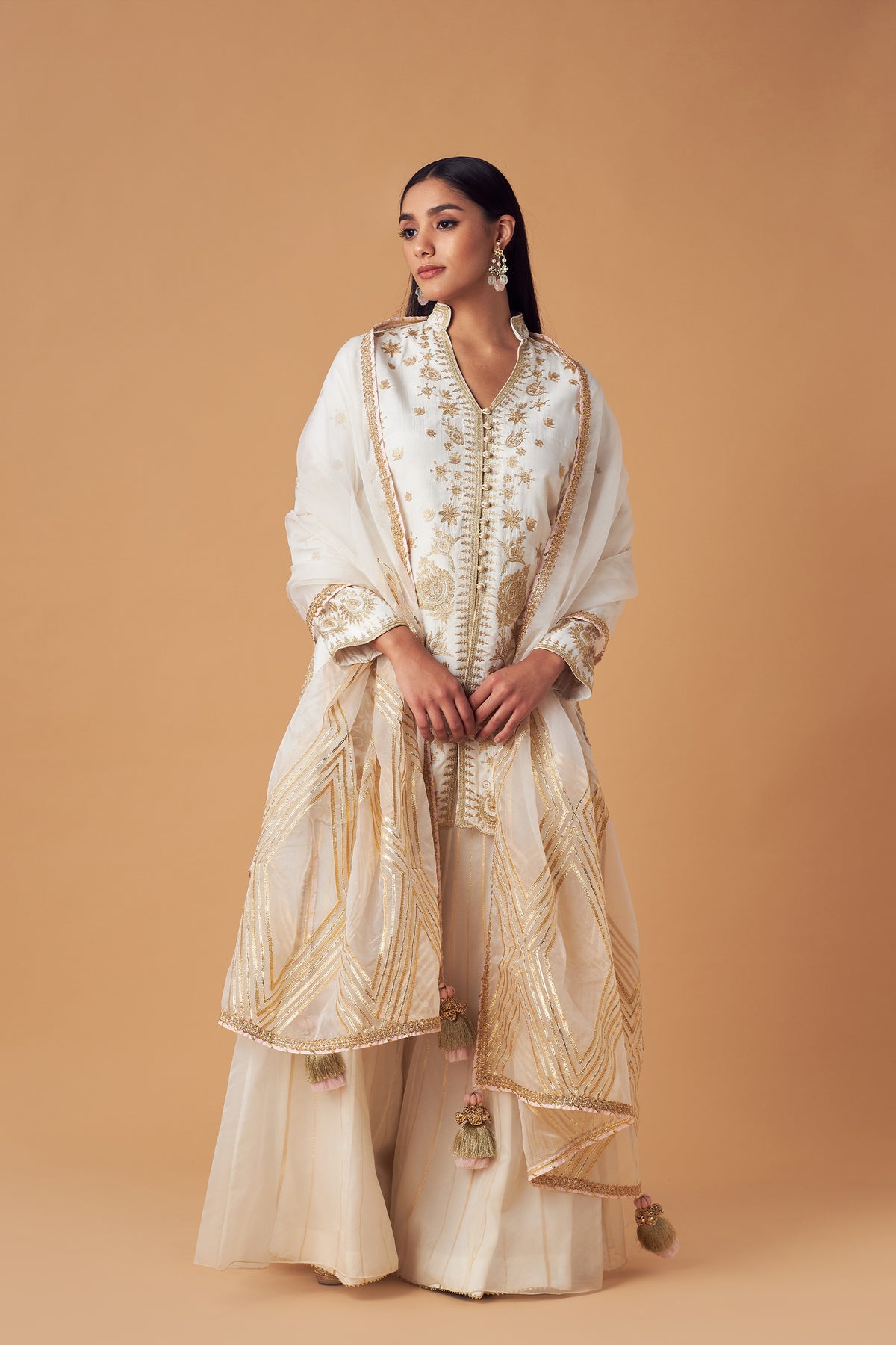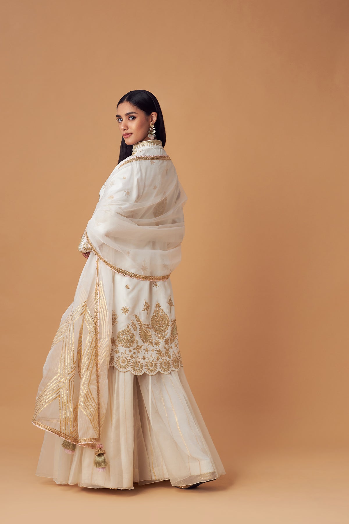 Aari and dori embroidered front open jacket is paired with a delicate organza sharara with subdued gota highlights and an gota organza dupatta