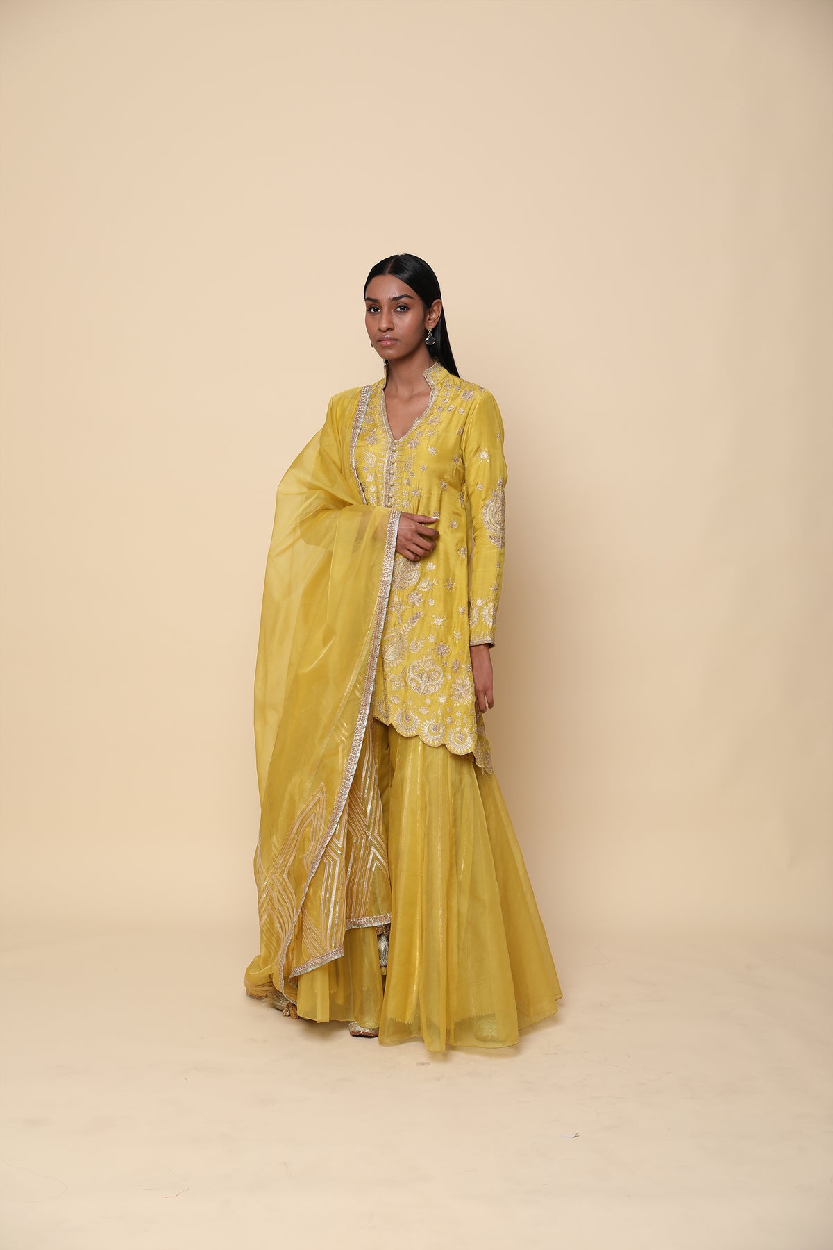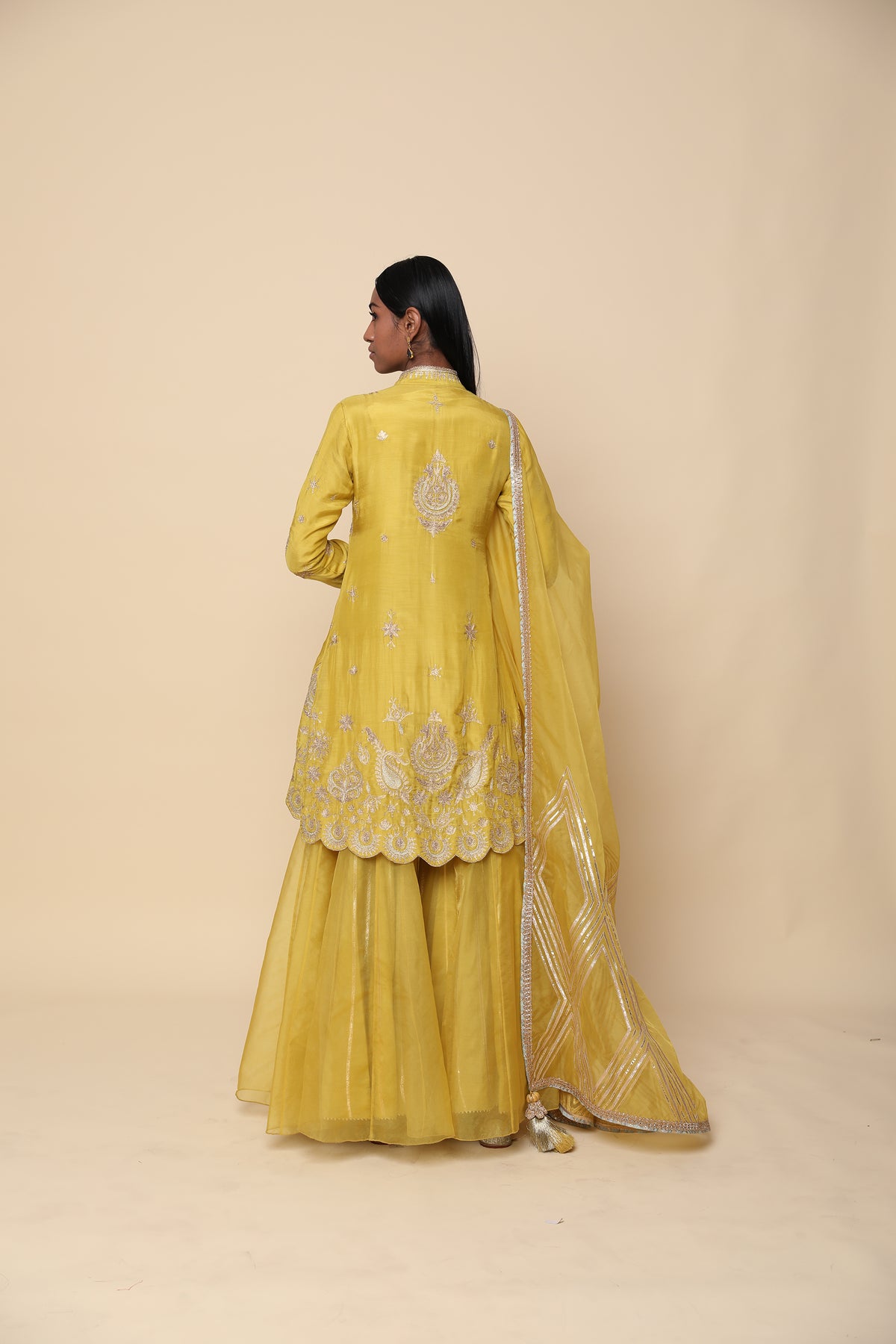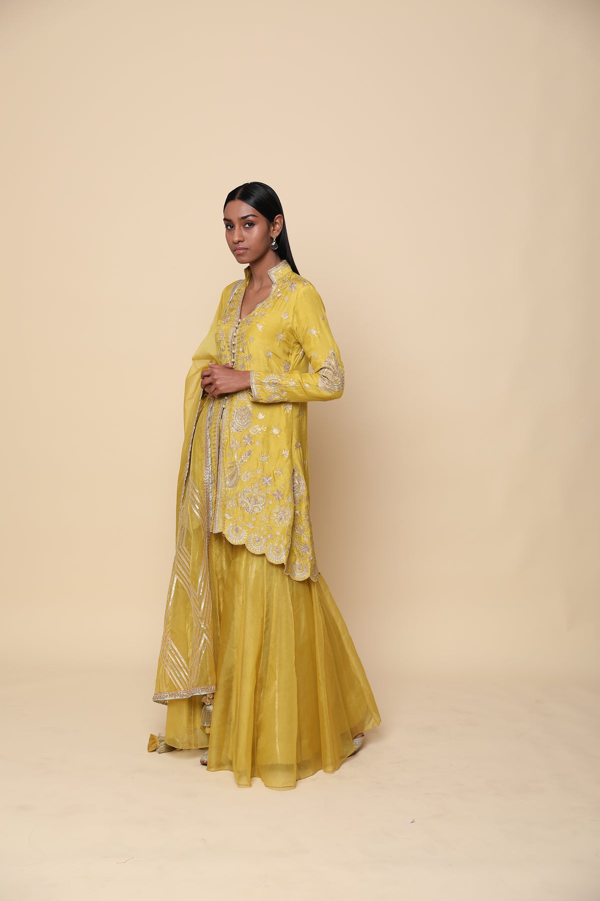 Aari and dori embroidered front open jacket is paired with a delicate organza sharara with subdued gota highlights and an gota organza dupatta