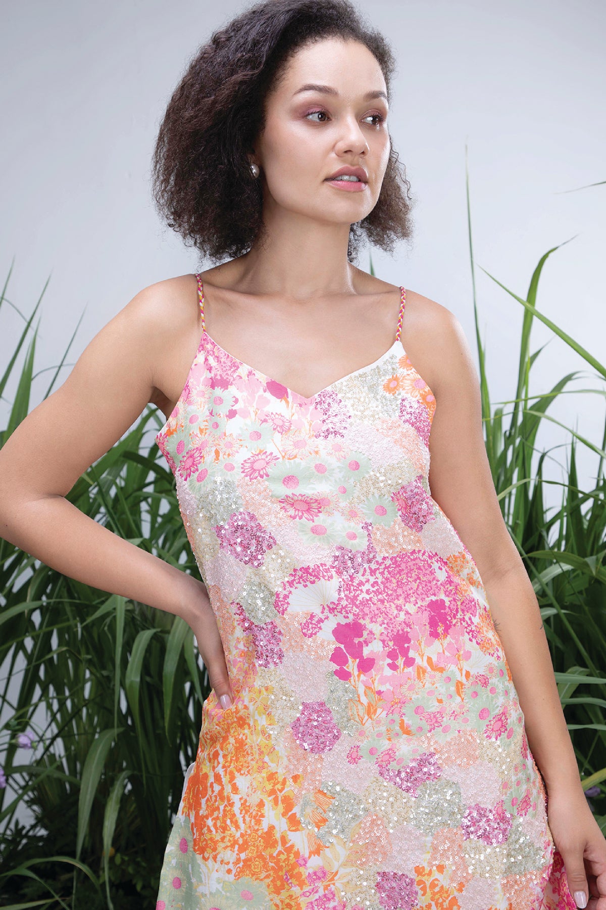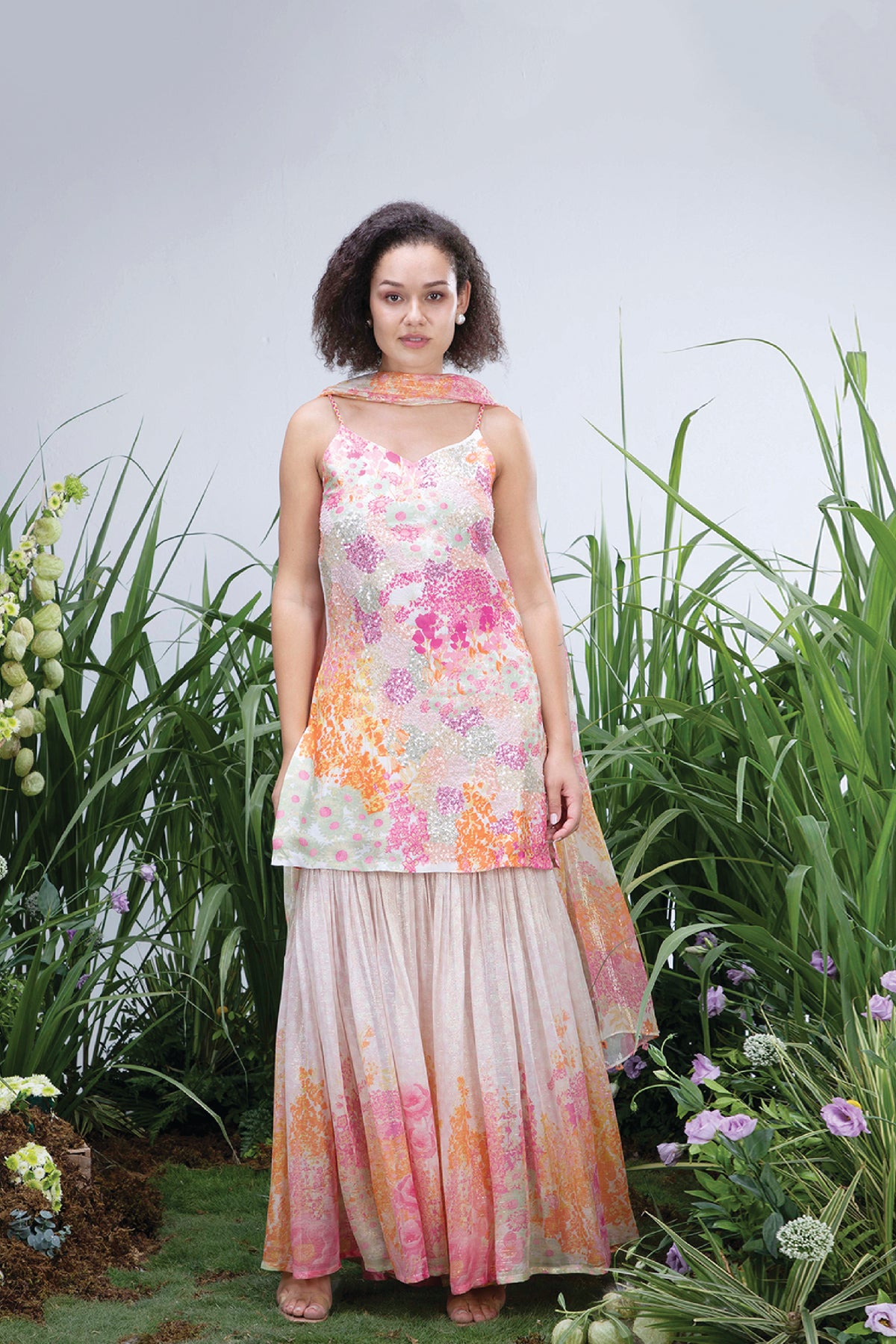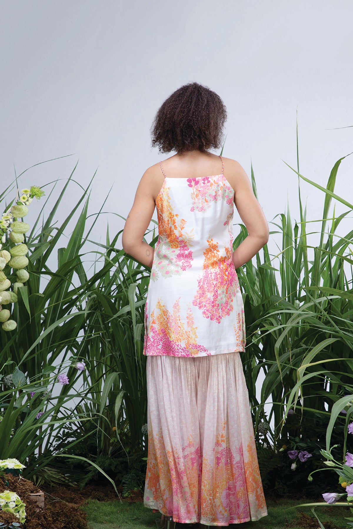 The chicory sharara set is our modern take on the traditionally sharara's the top is made of digitally printed natural bemberg silk styled with delicate shoulder straps and paired with georgette shimmer printed sharara pants and dupatta