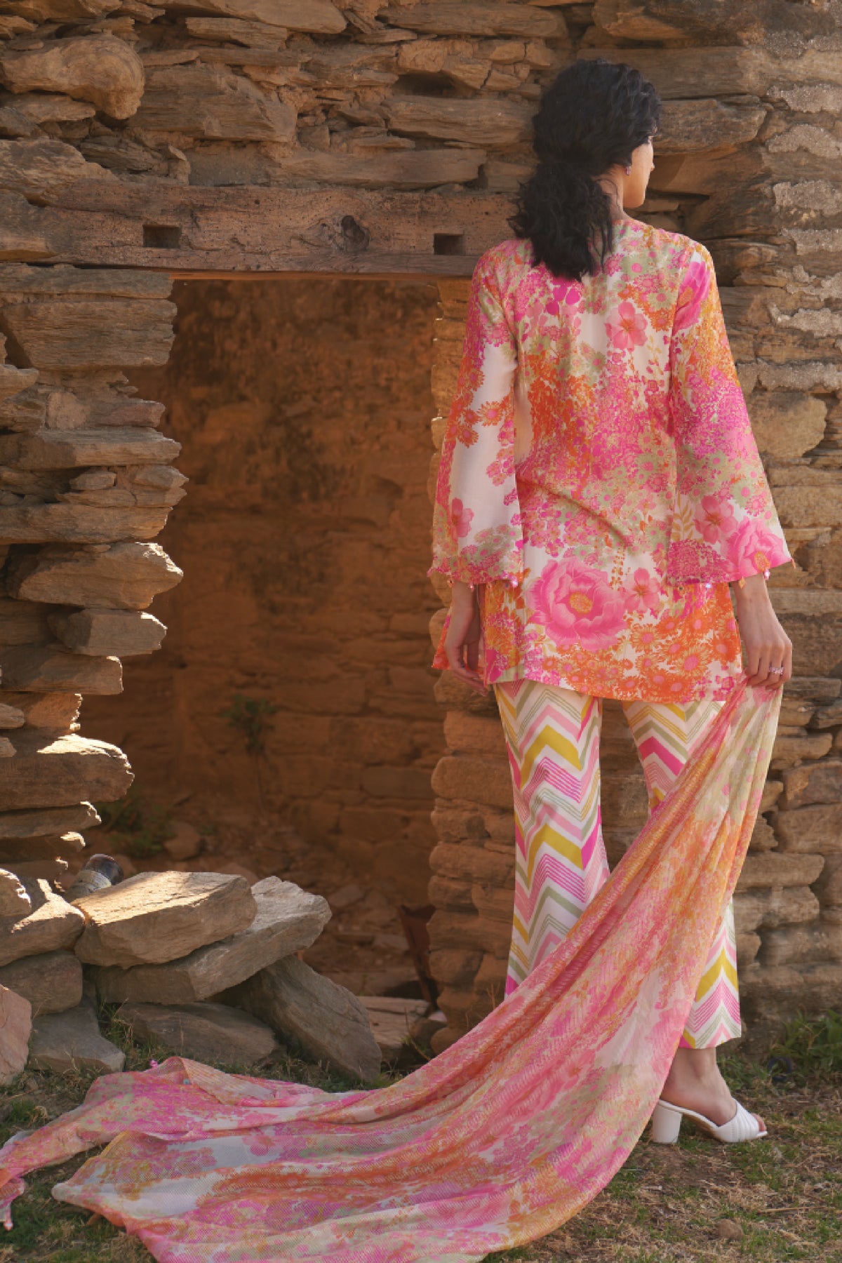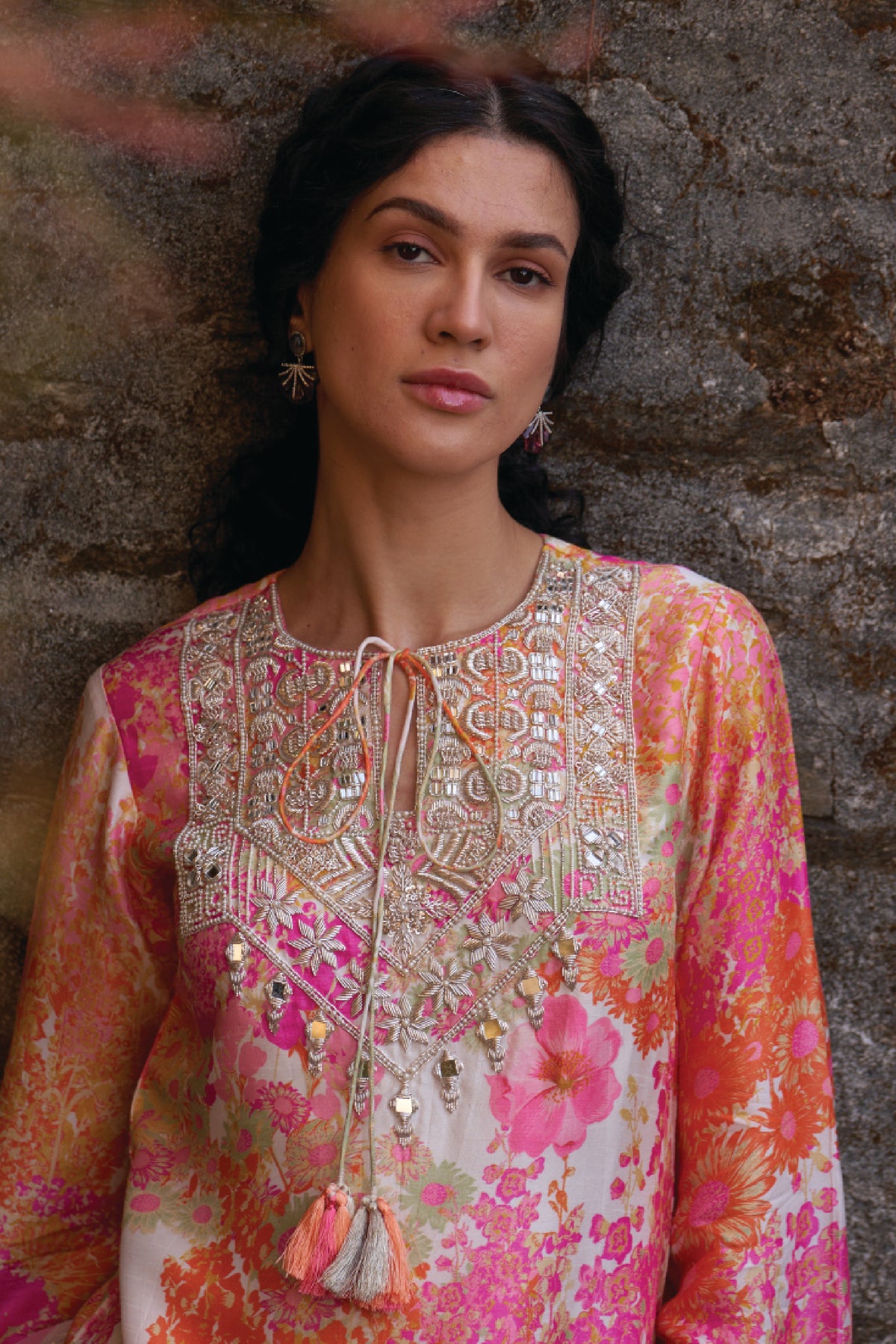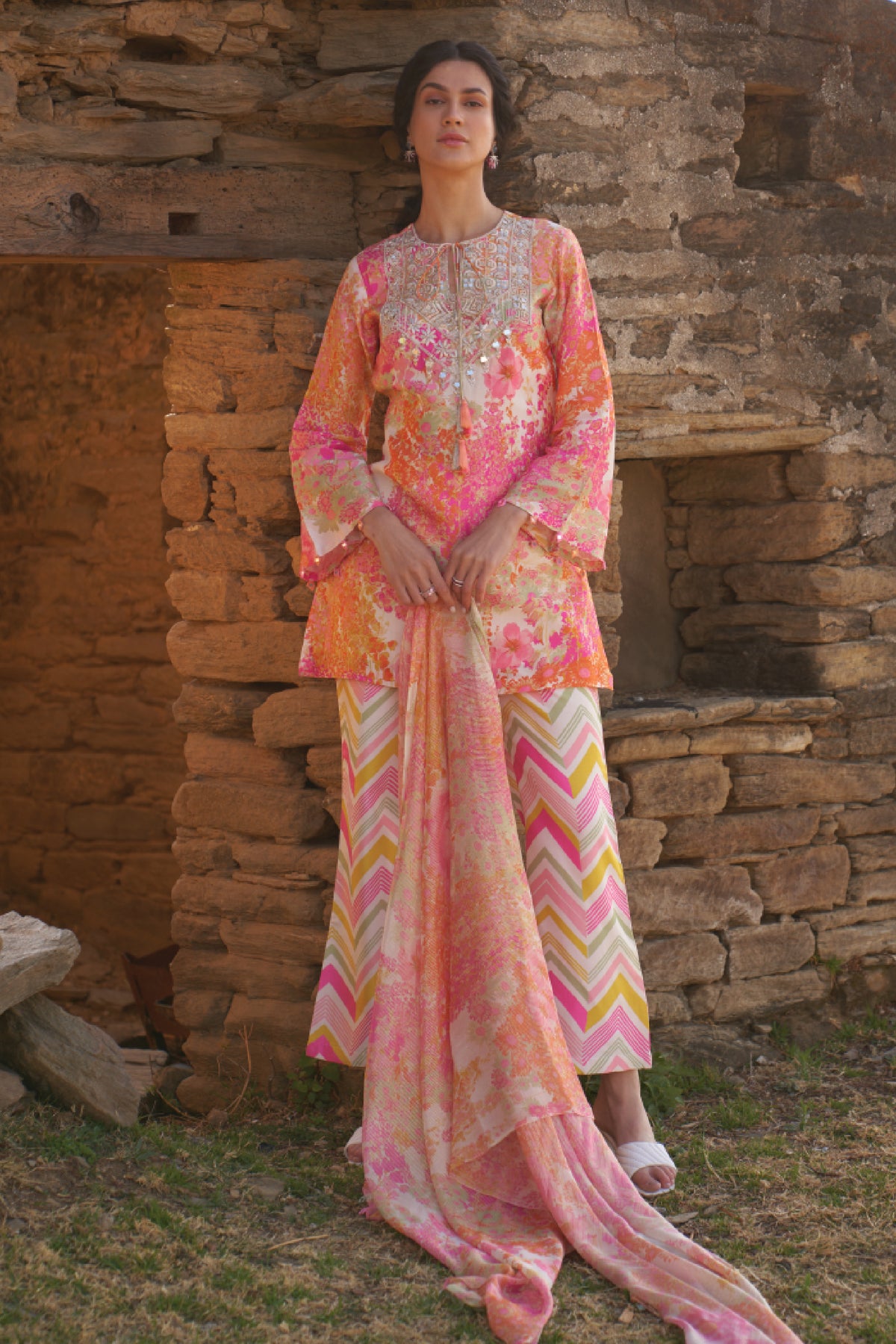 The top is made of digitally printed natural bemberg silk styled with intricate zardozi and mirror hand embroidery on the neck yoke and paired with bemberg printed sharara pants and  shimmer dupatta