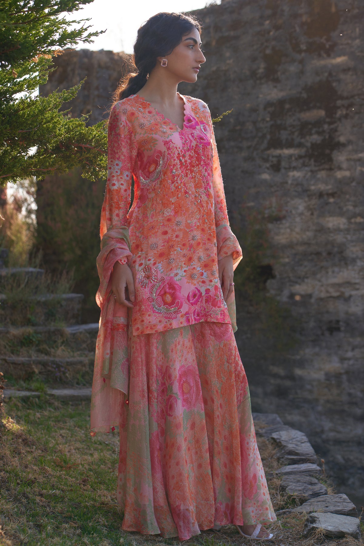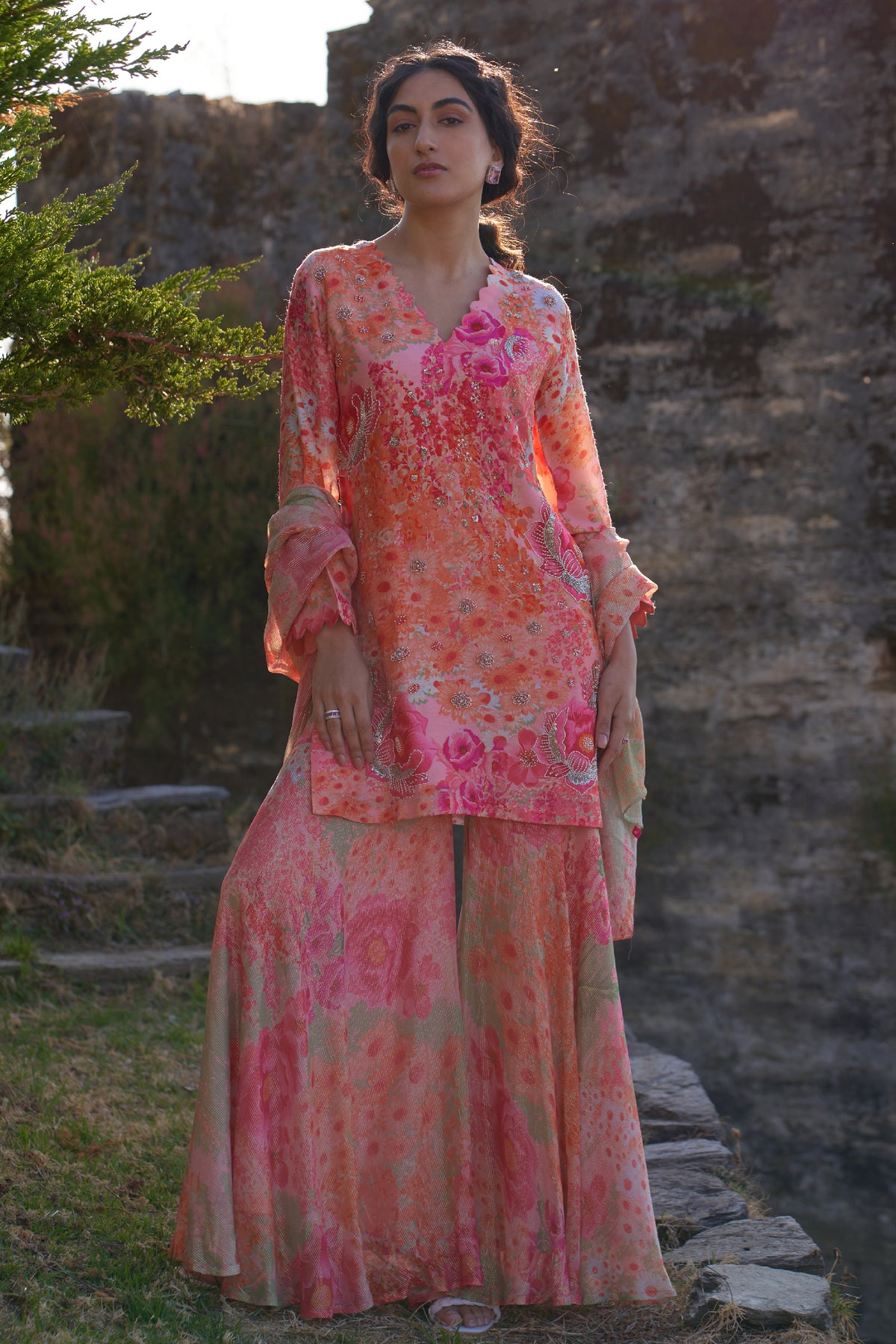 The top is made of digitally printed natural bemberg silk styled with delicate scallops on the neck line and sleeve cuff with intricate hand embroidery and paired with georgette shimmer printed sharara pants and dupatta