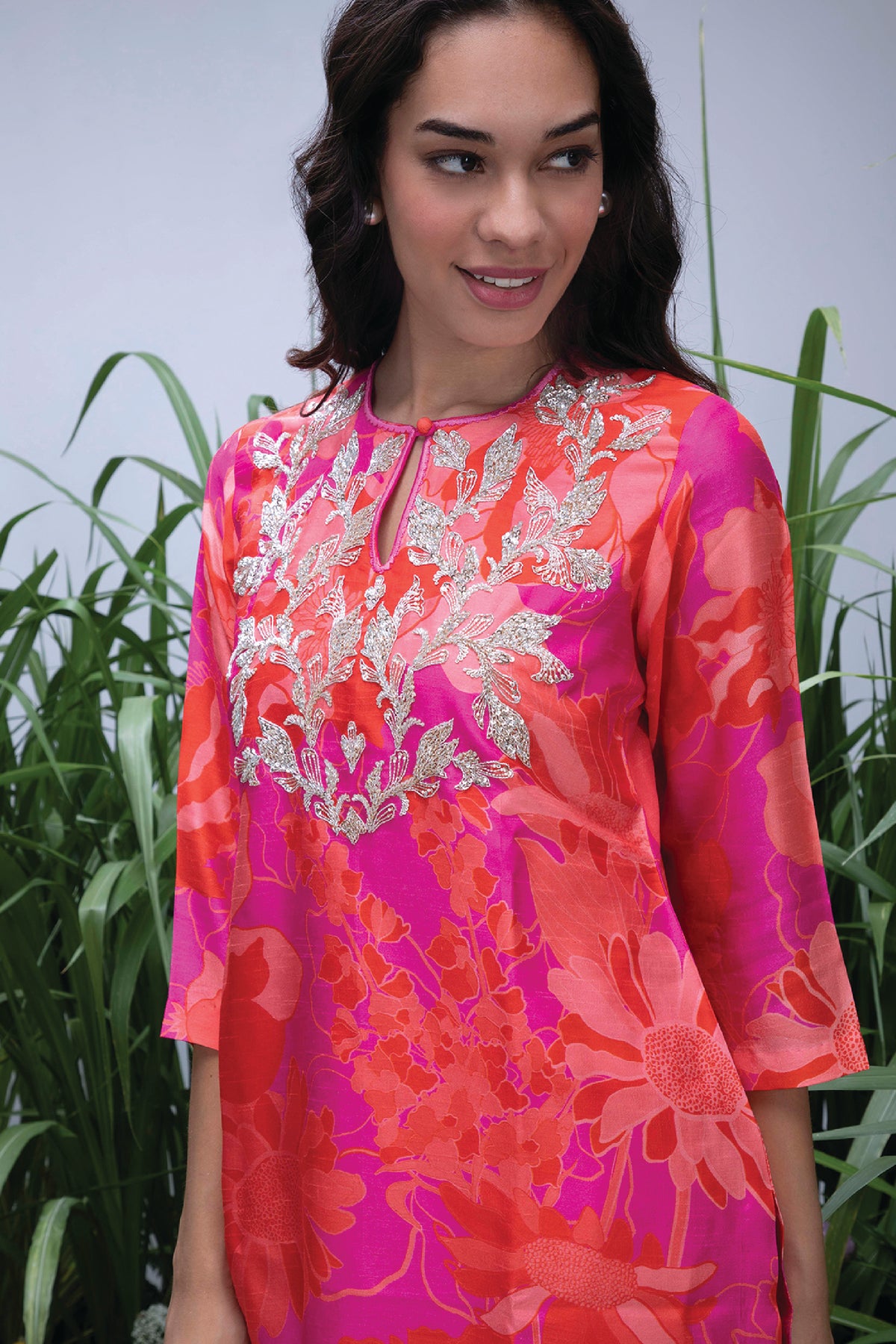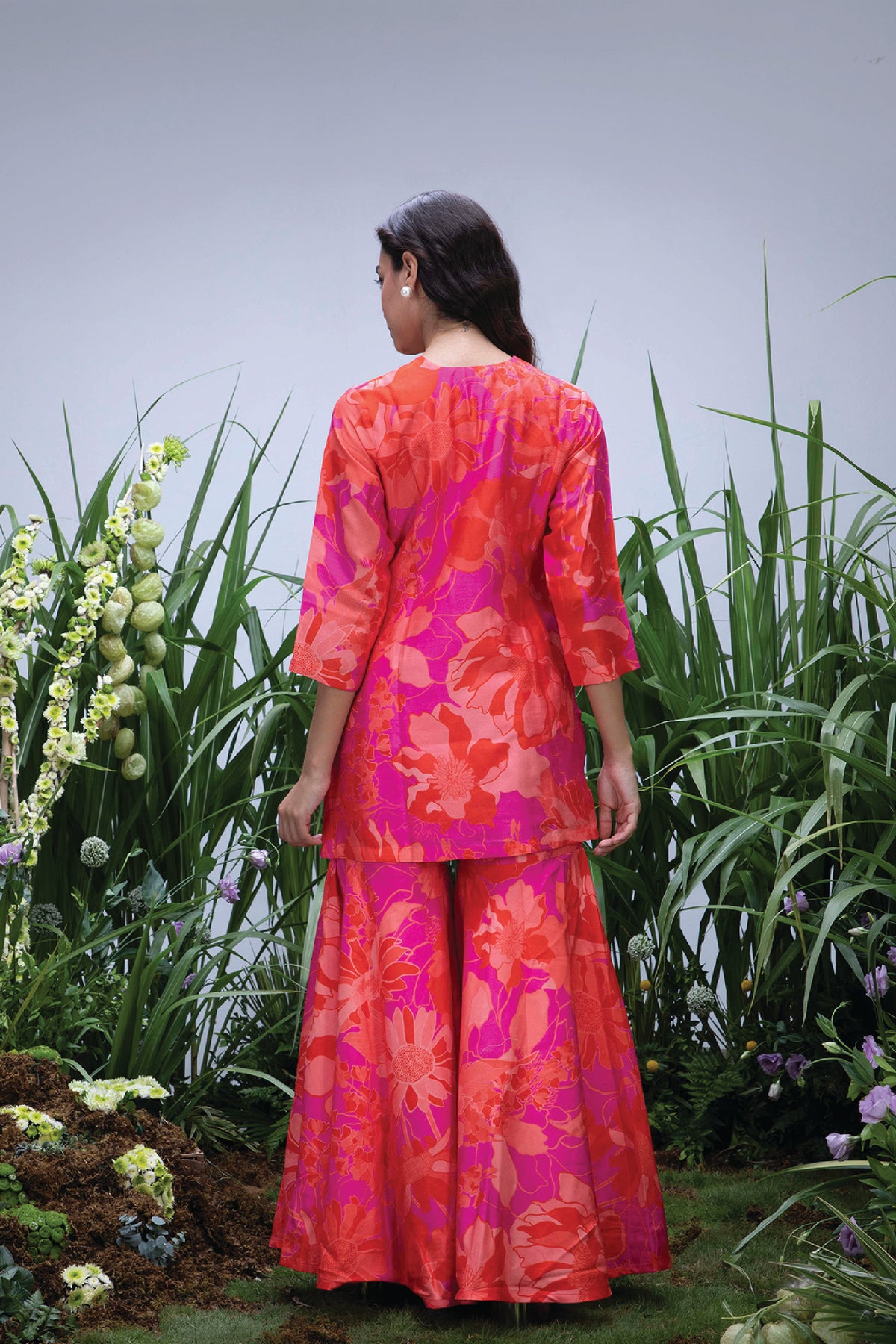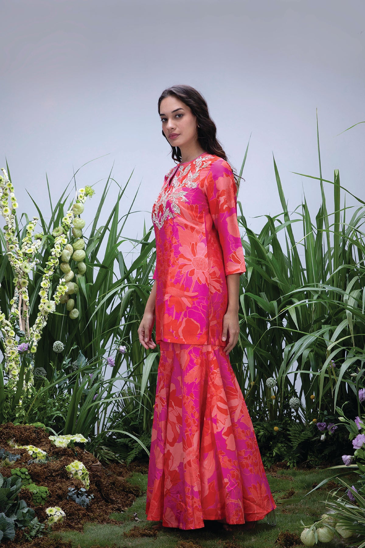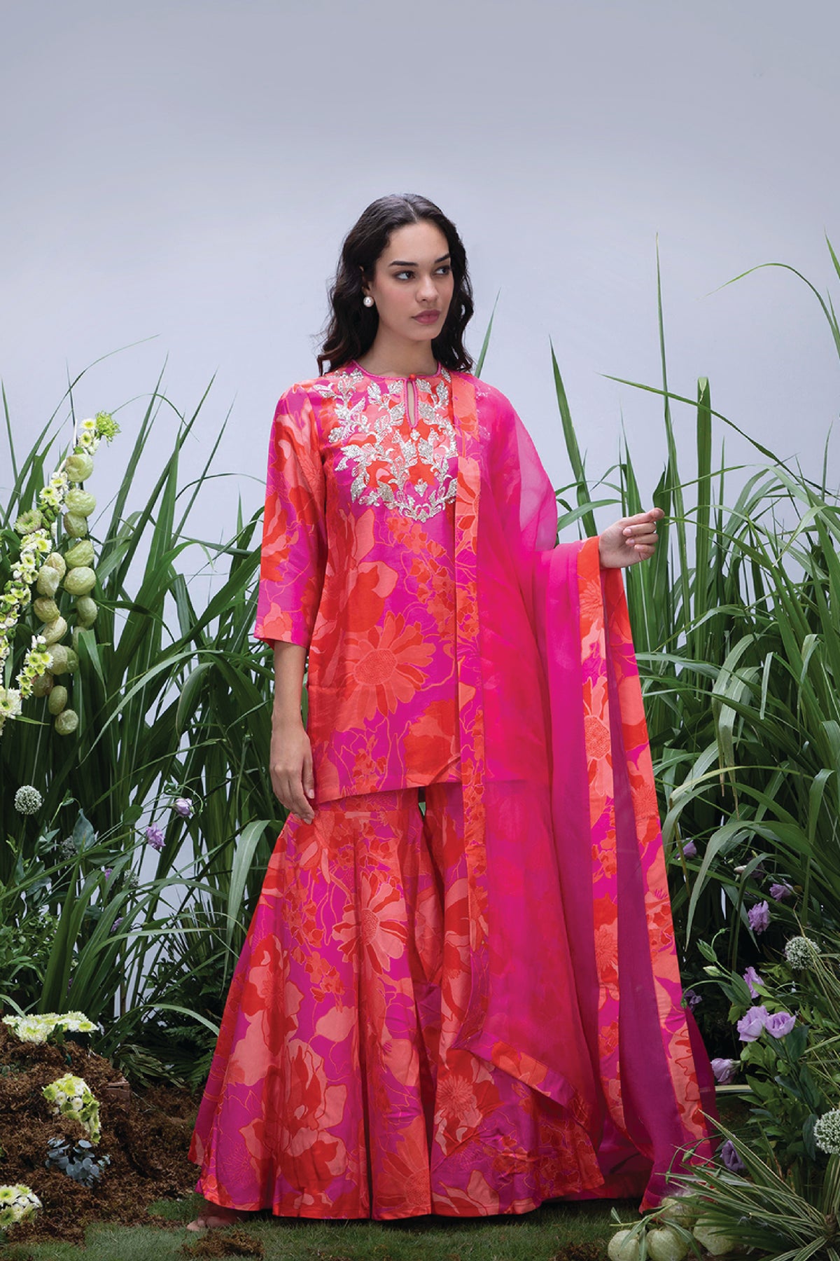 The top is made of digitally printed natural bemberg silk styled with intricate zardozi and mirror hand embroidery on the neck yoke and paired with bemberg printed flared pants and shimmer dupatta