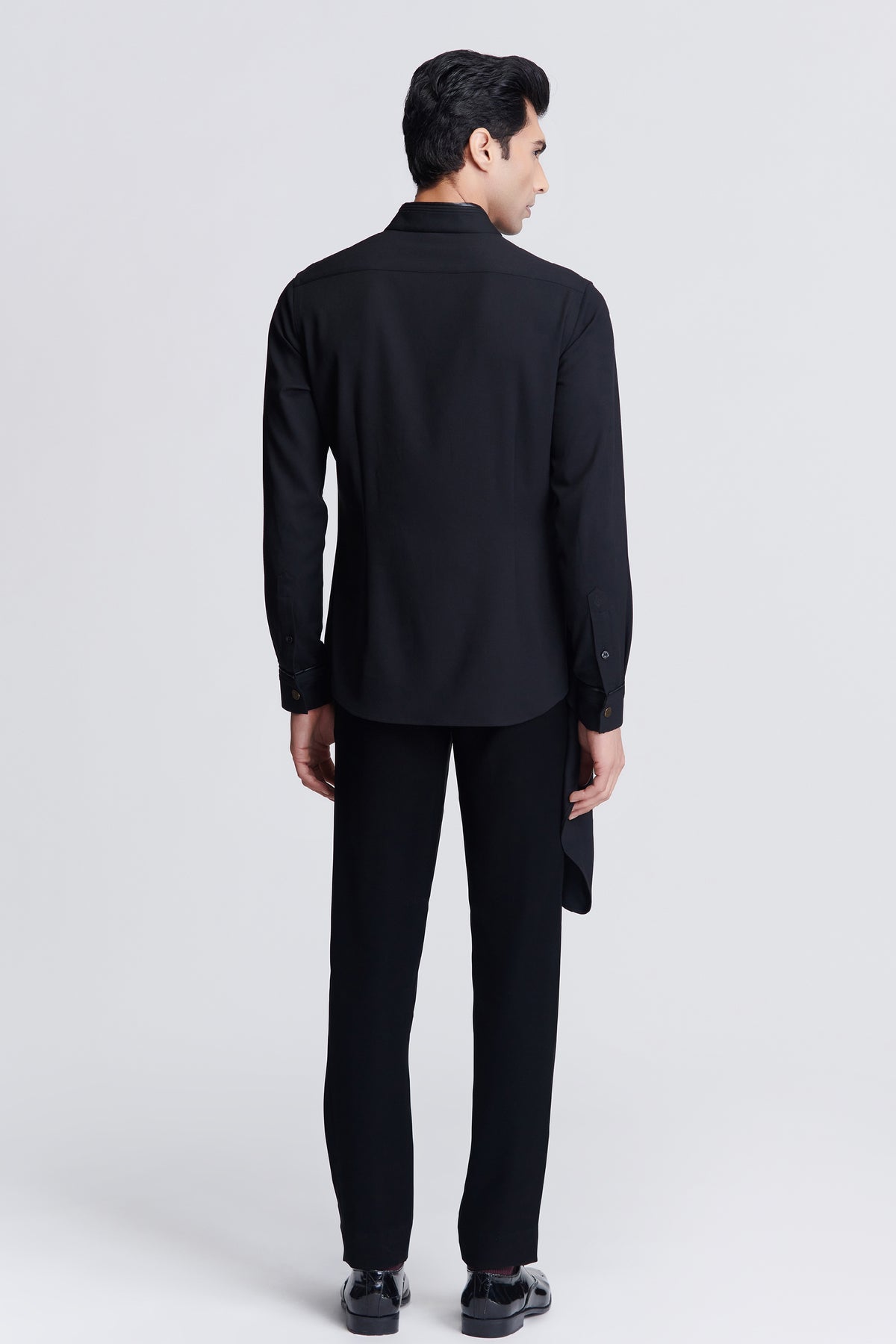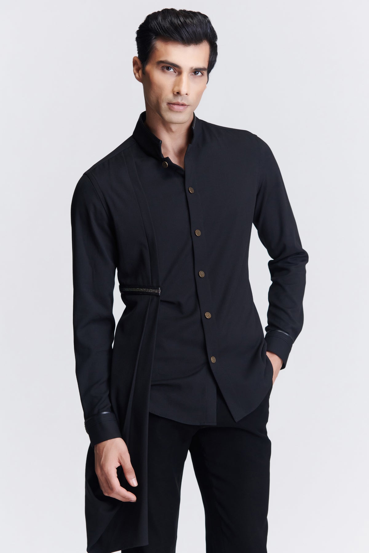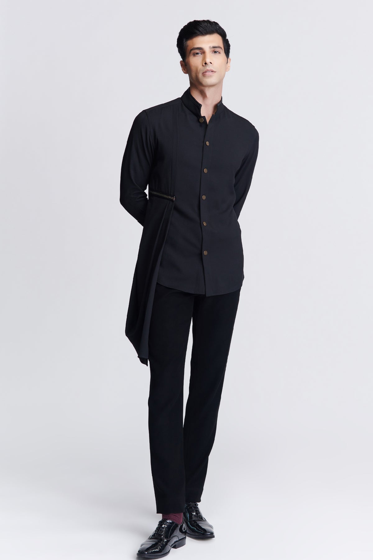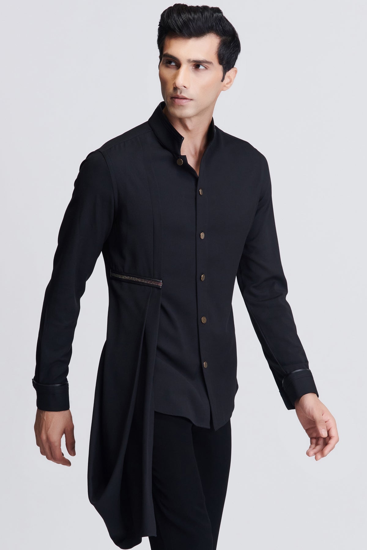 An unconventional interplay of Indian heritage and modern spunk, this sartorial piece exudes a fluid energy with its anti-trend drape. Design elements like faux leather patch work detailing gives an edgy touch to the ensemble. Accessories such brooch, pocket square etc are used for styling purpose only.