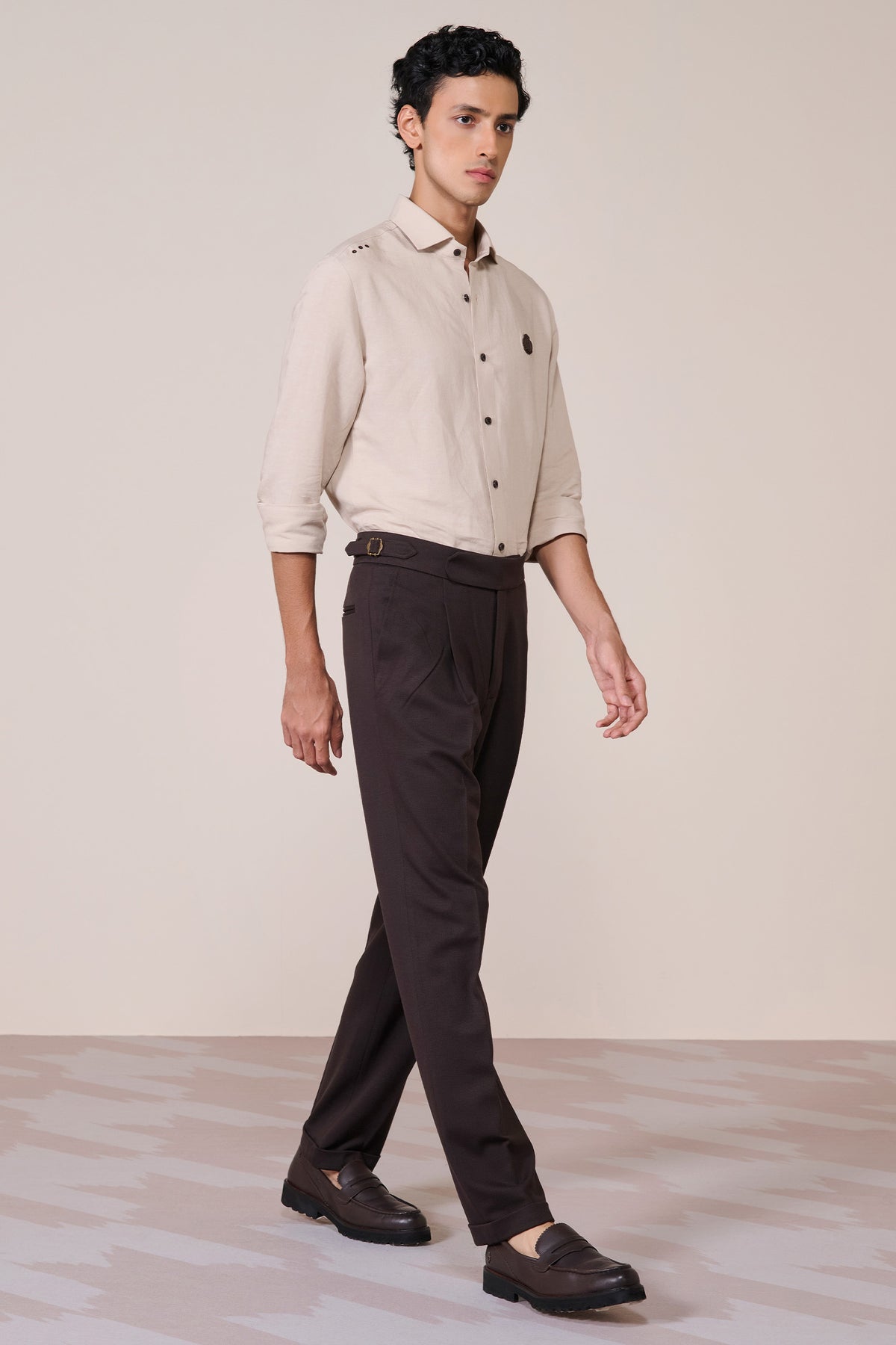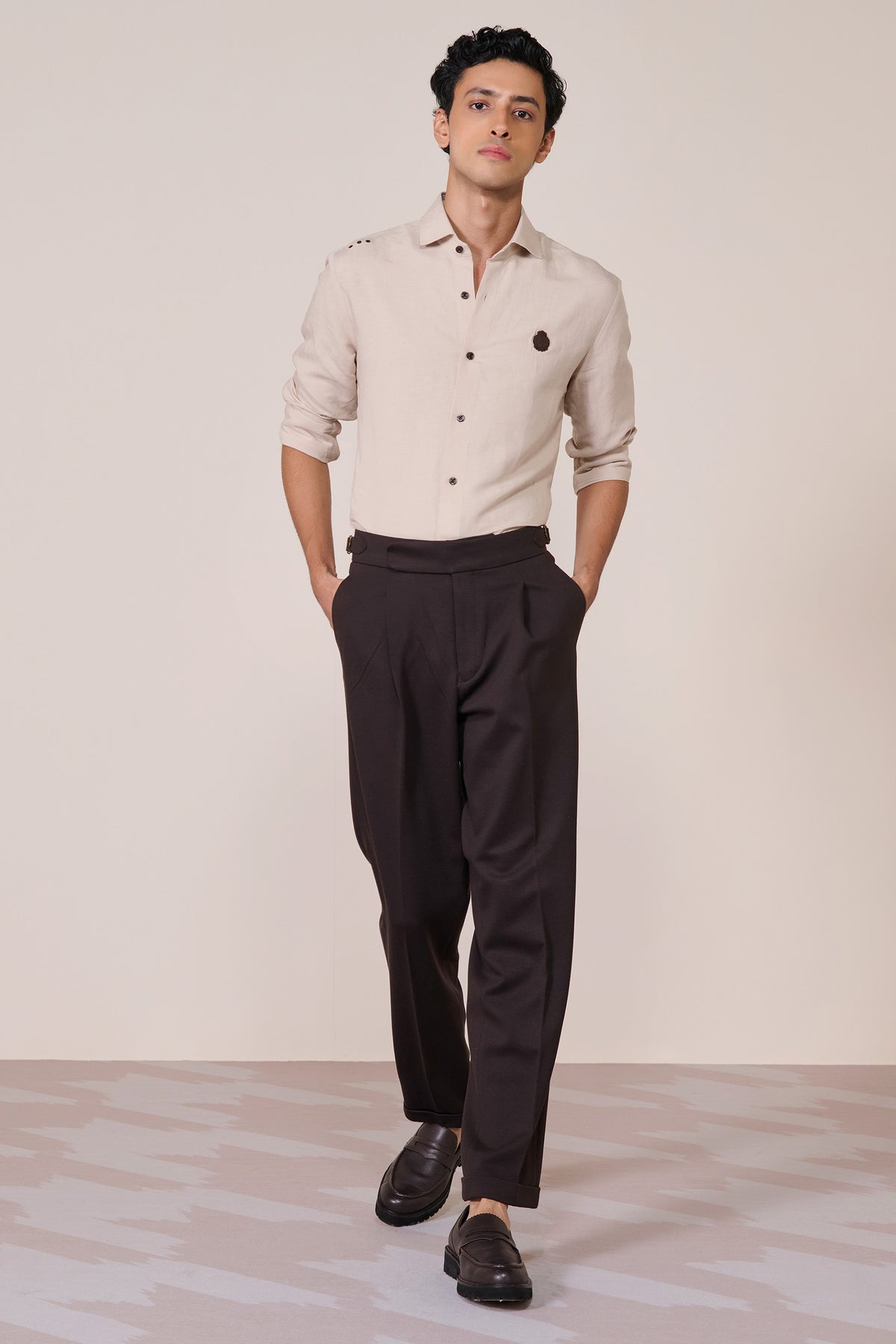 Elevate your everyday round-the-clock look with this must-have classic linen shirt showcasing a faux leather crest
