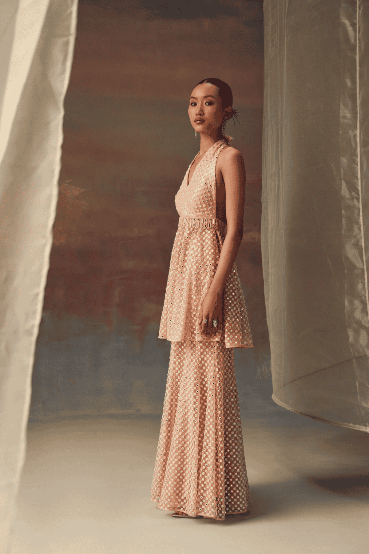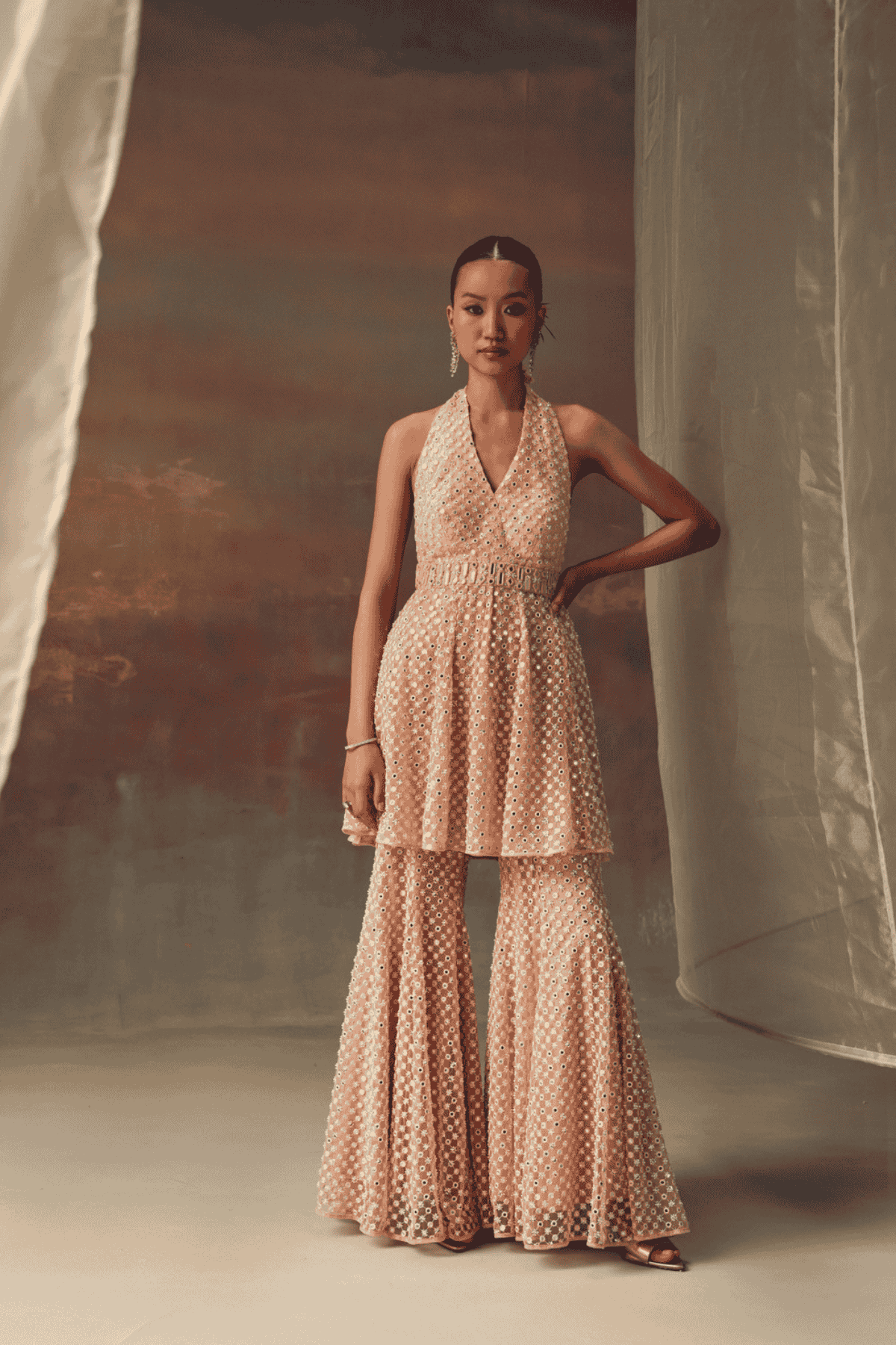 Short halter neck tunic with mirrorwork highlighting on the waist
