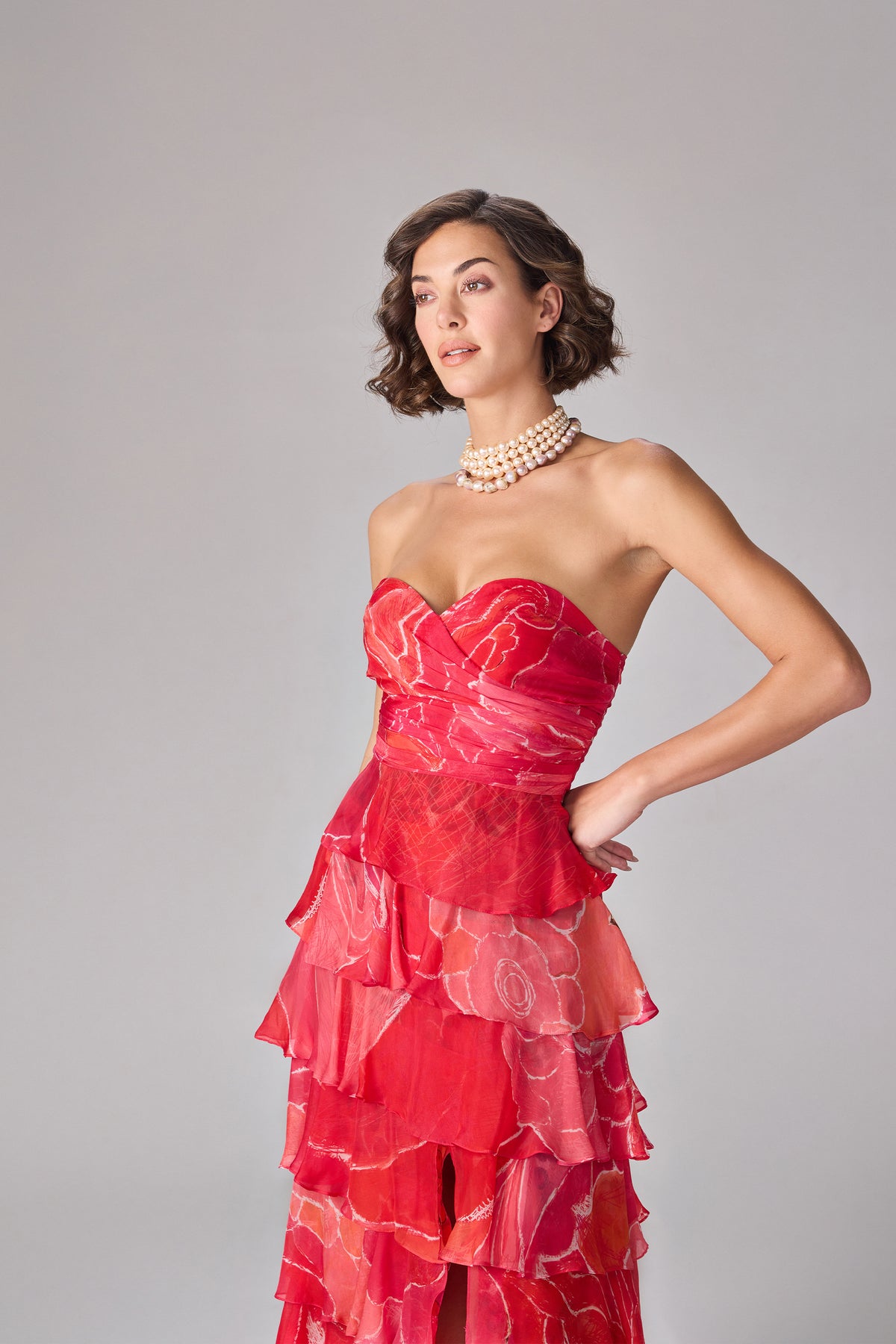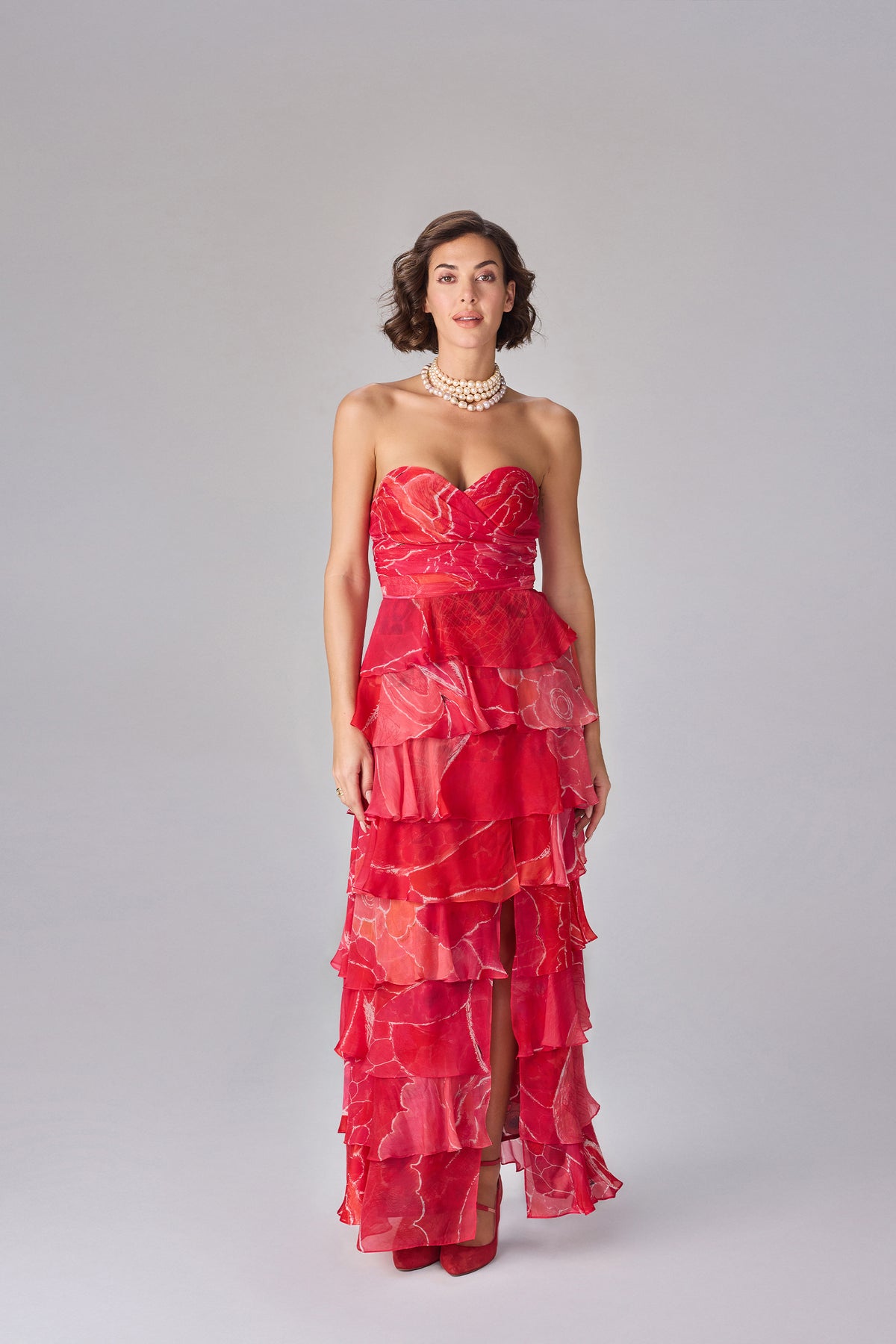 Abstract floral print, sweetheart neckline, seven tier maxi dress with surplice bustier