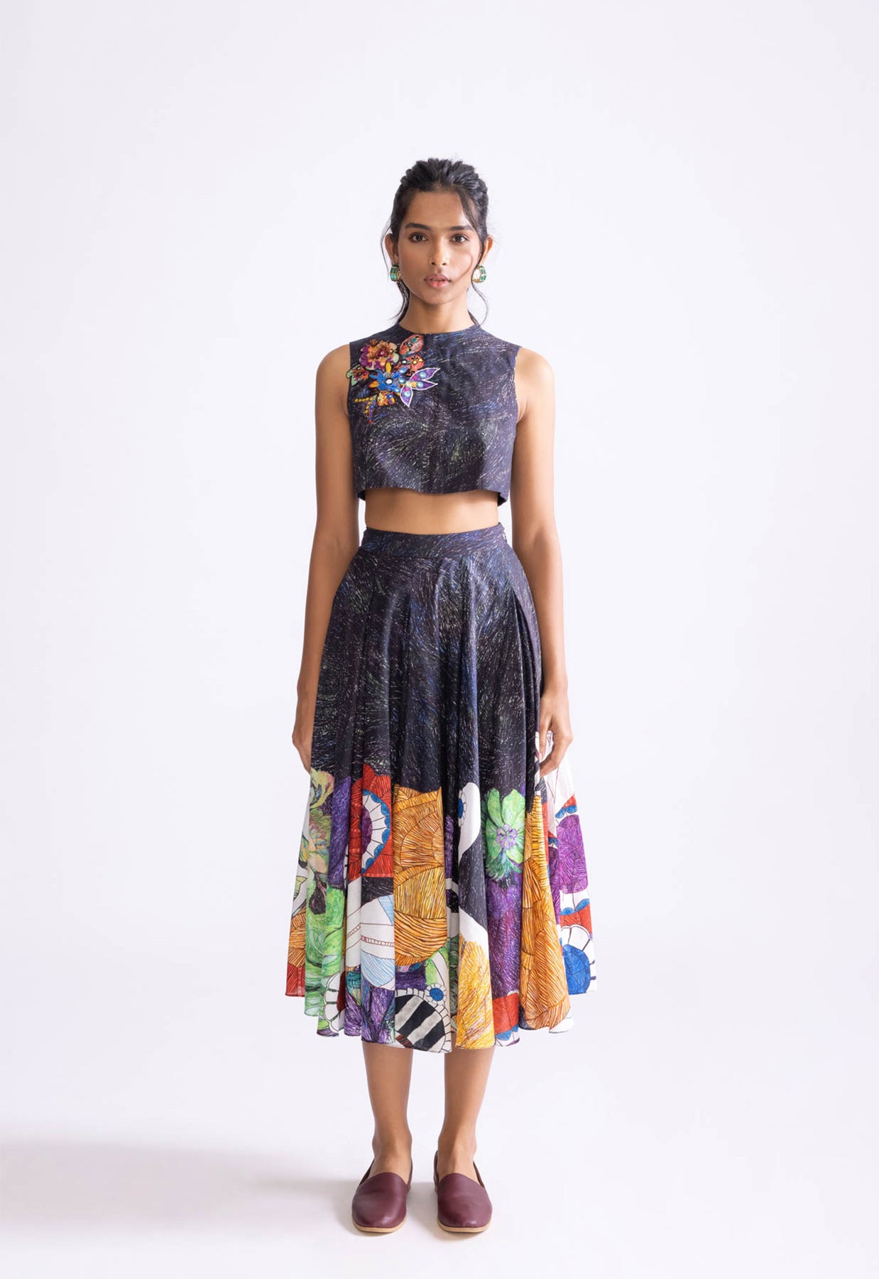 Wave print sleeveless boxy blouse with intricate hand embroidered thread, mirror and tassel floral motifs