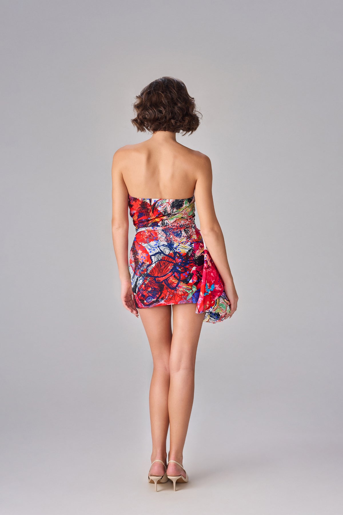 Abstract floral print, sweetheart neckline mini dress wth side ruching and side drapery