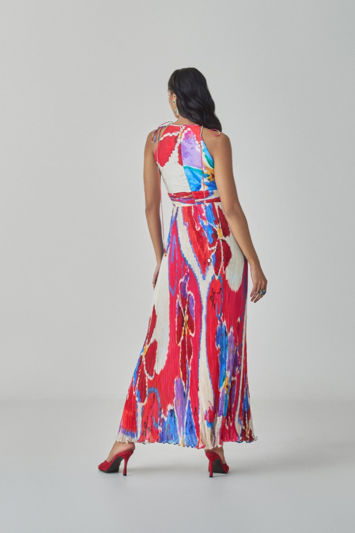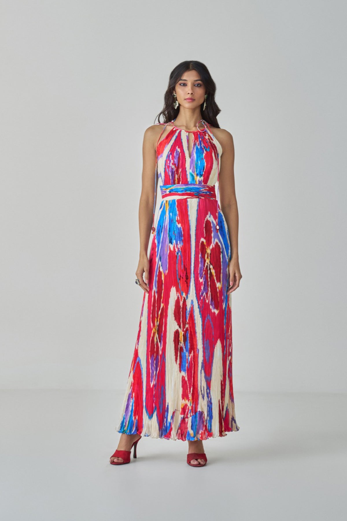 Ikat inspired print hand micro pleat halter neck maxi dress with customizable keyhole detailing