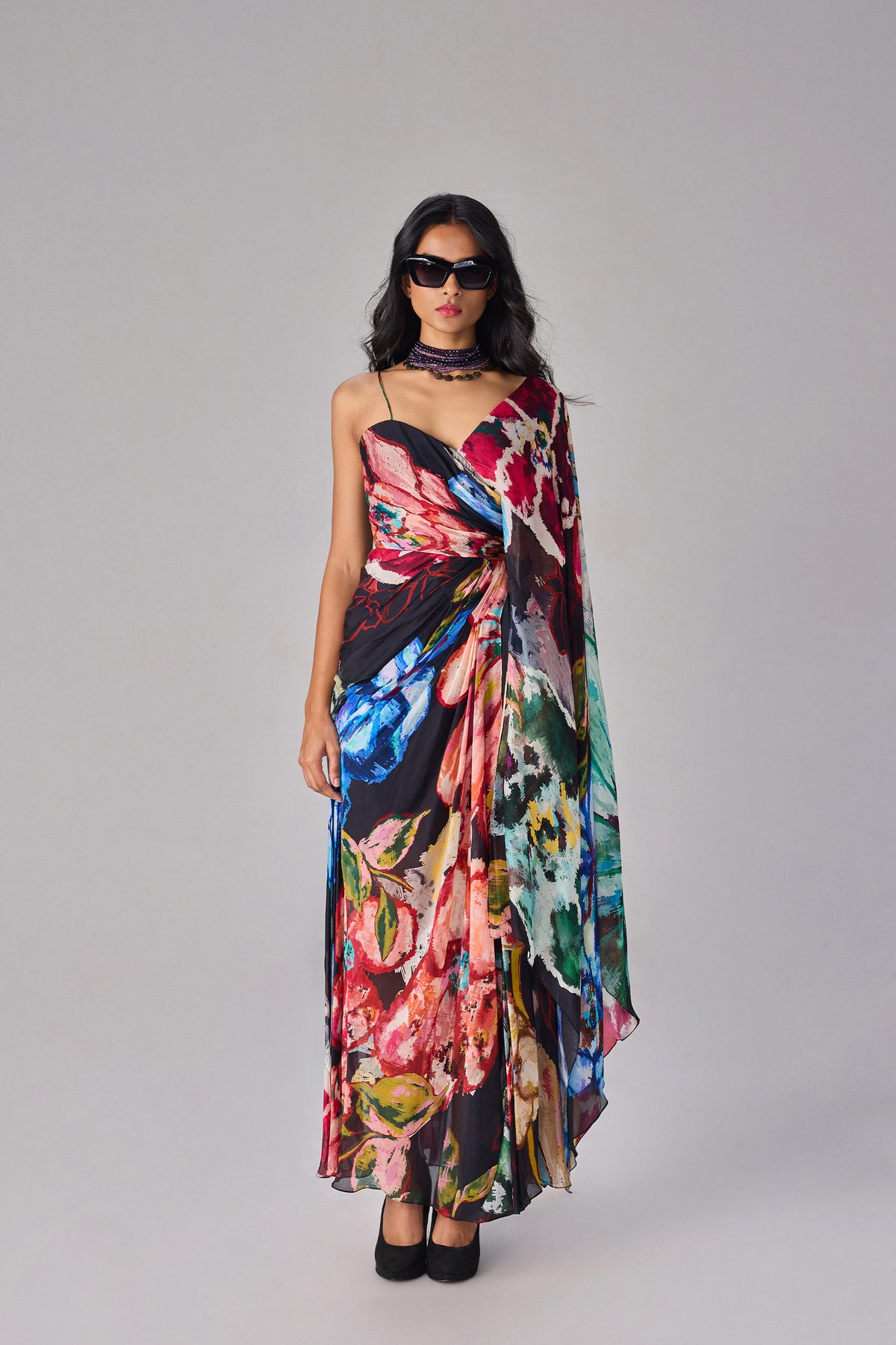 Floral print, asymmetric dress with a pleated bodice, contrast noodle strap and draped shoulder detailing