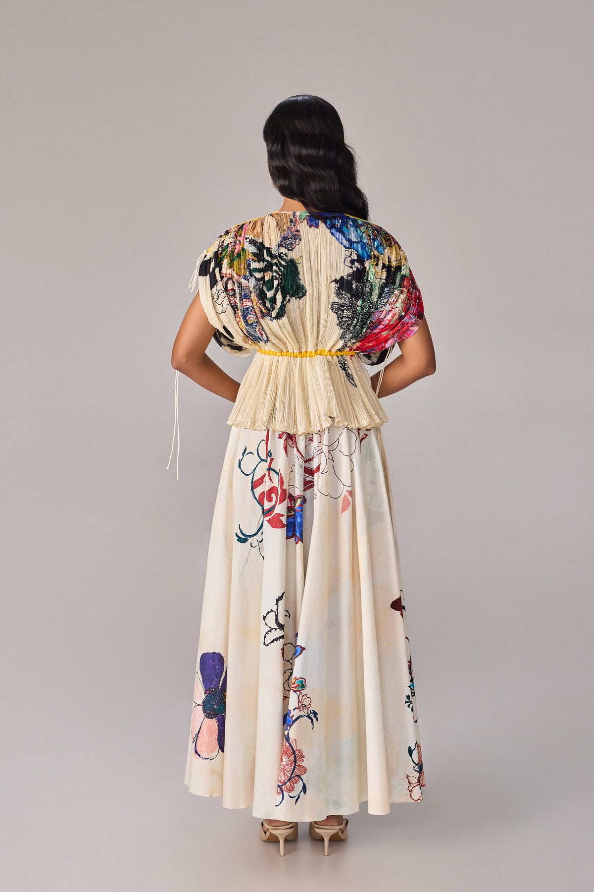 Floral and abstract print, hand micro pleat kaftan style blouse with adjustable drawstring waist and sleeves, and front zip closure