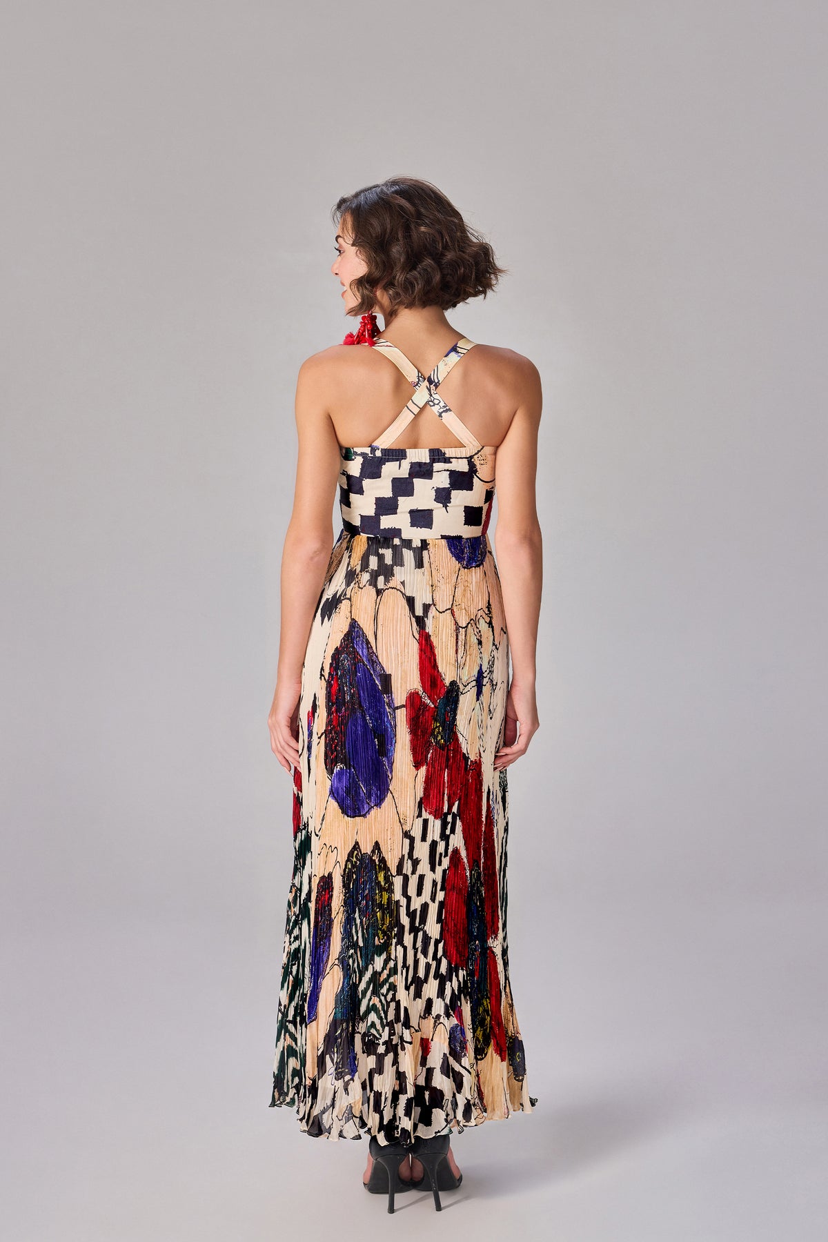 Floral and asbtract print, part hand micro pleat maxi dress with satin bustier and sweetheart neckline