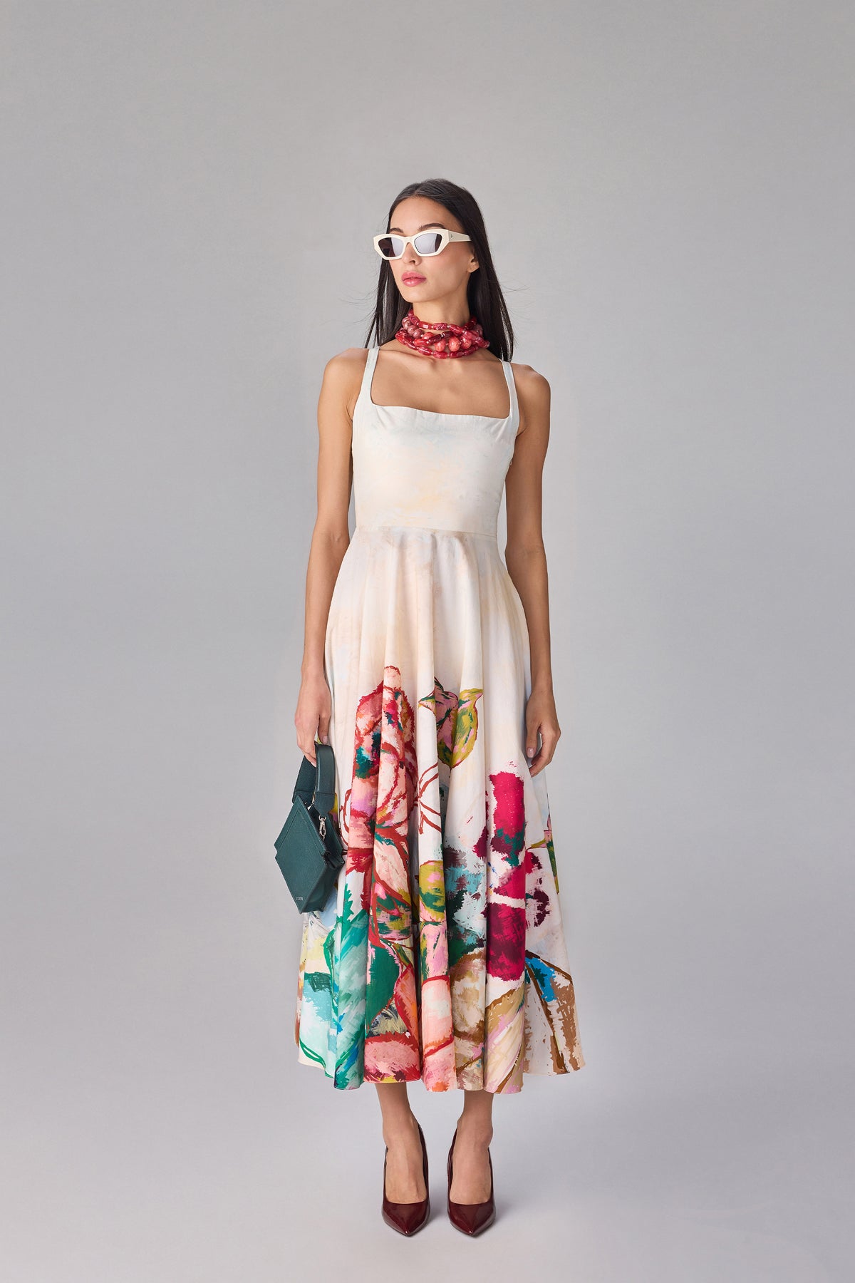 Square neck midi dress with abstract floral print placement and fitted bodice