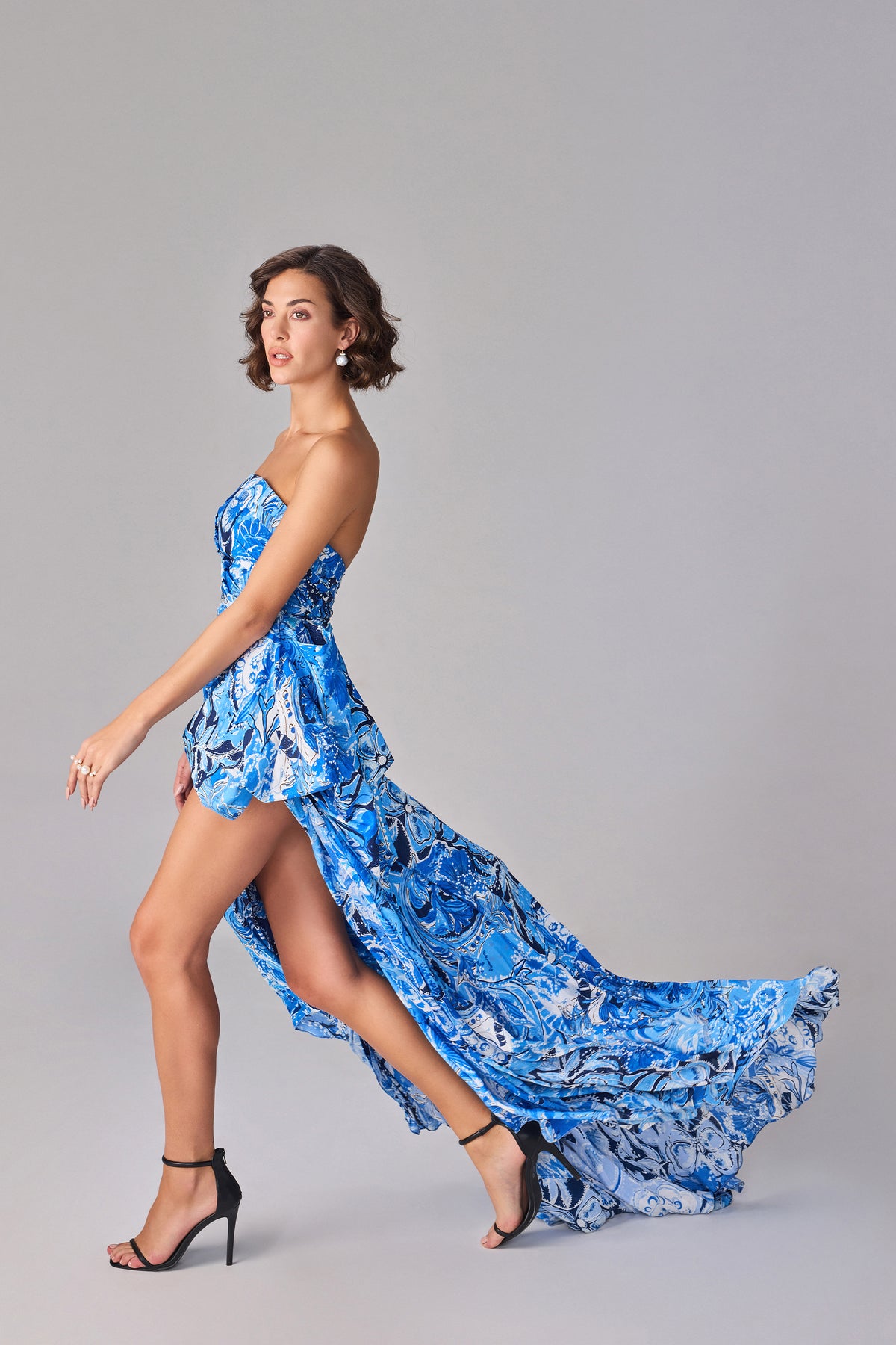Abstract floral print strapless asymmetric dress with side drapery, customizable side slit and trail
