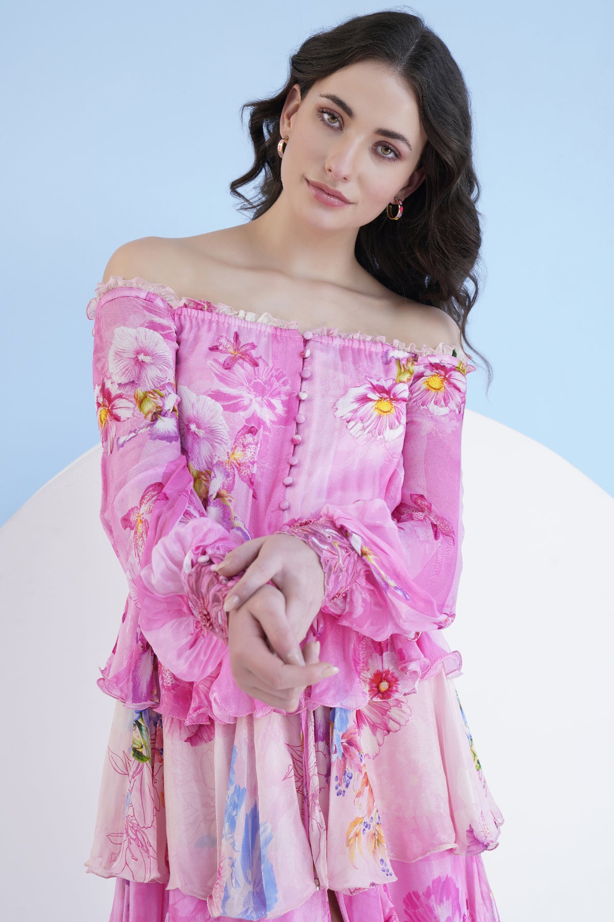 Pastoral mist printed off shoulder tiered dress in chiffon featuring puff sleeves and hand embroidered cuffs