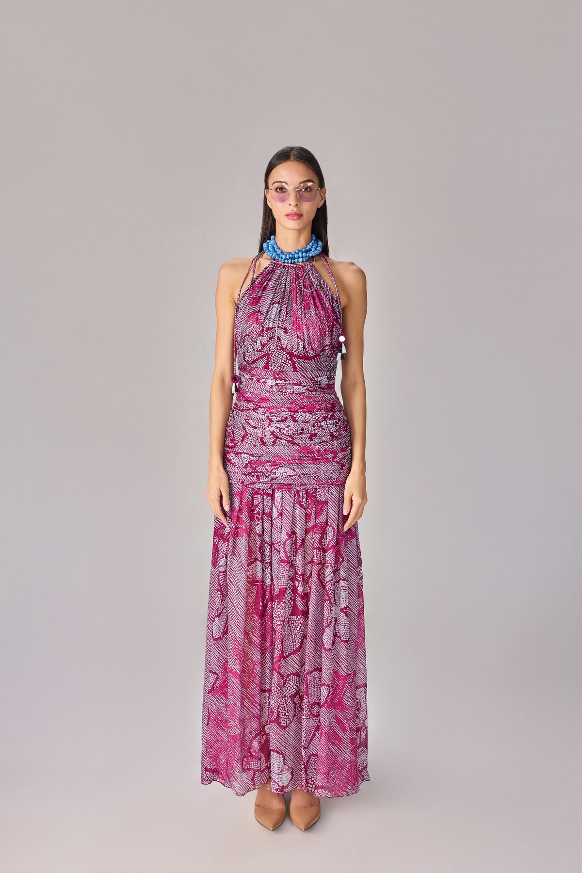 Bandhani and floral print, halter neck maxi dess with hand micro pleat bodice and waist, customizable side slit and hand embroidered mirrored tassle tie ups