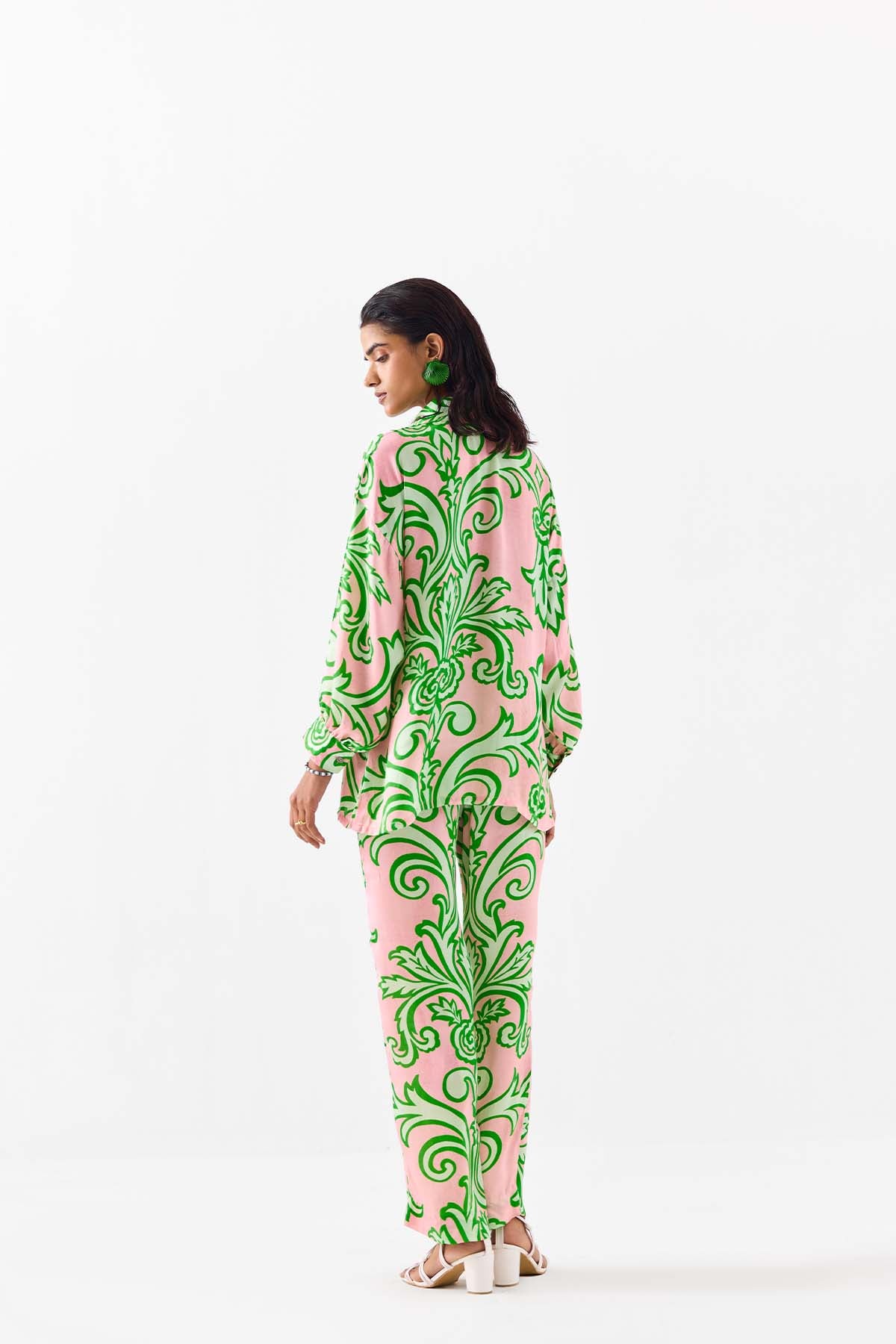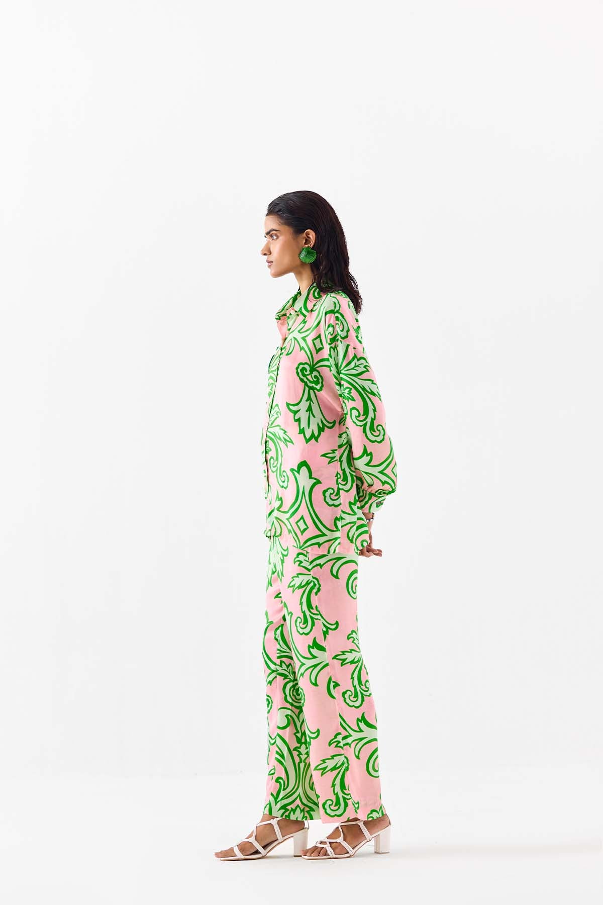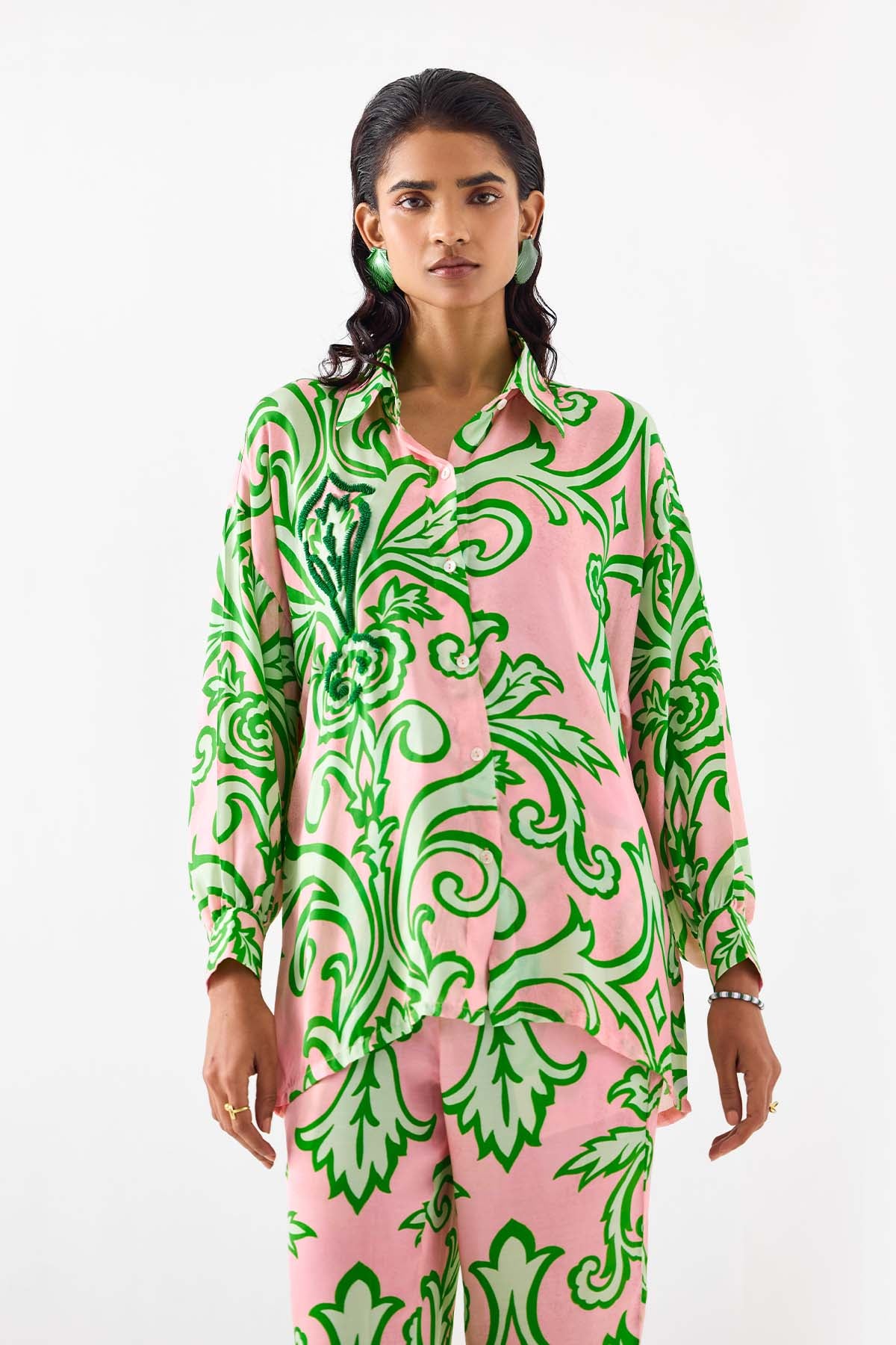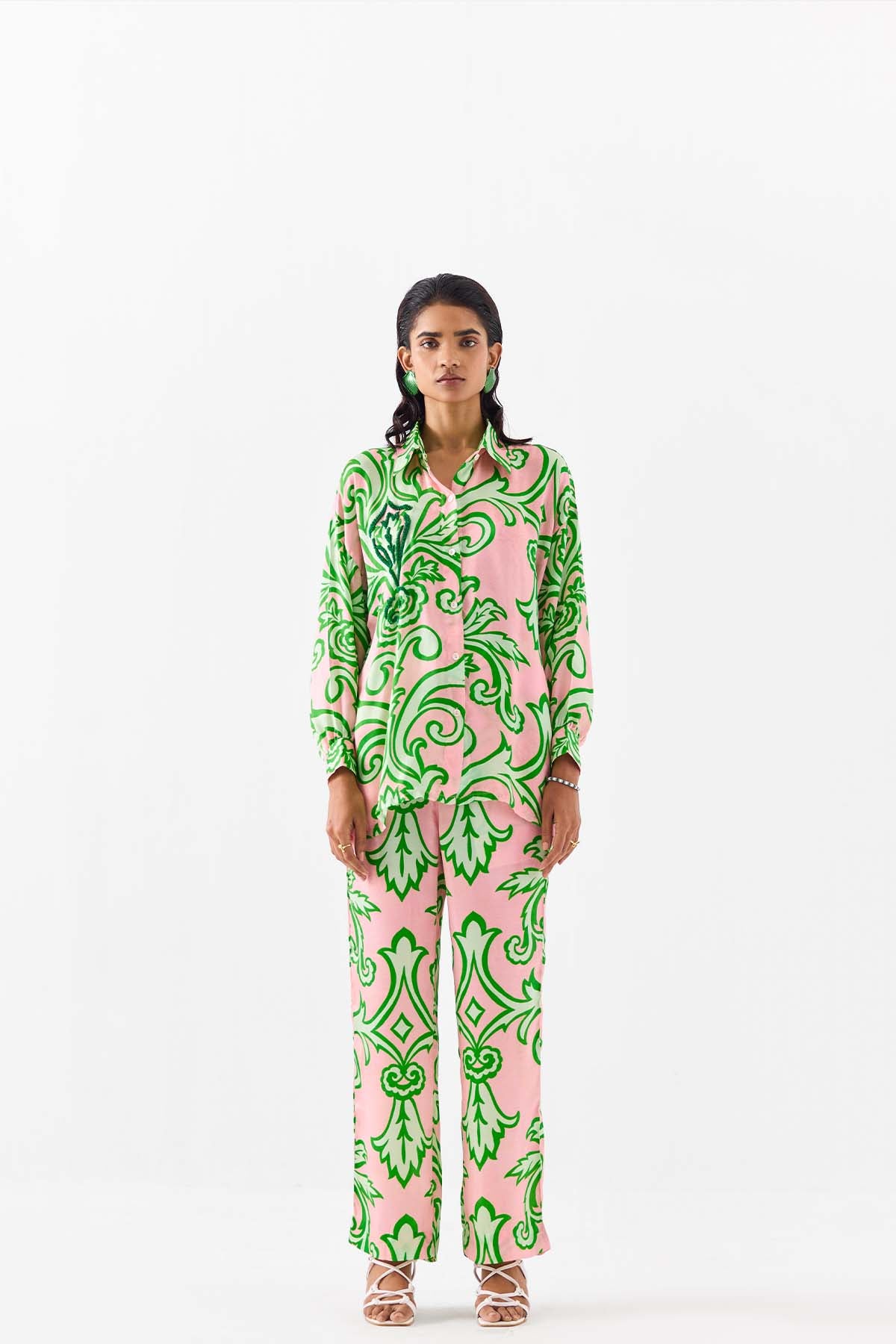 The la paz shirt & pants co-ord crafted from our stunning vegan silk fabrication , trans-seasonal, is a statement piece. The co-ord, made in our baby pink damask print, has a relaxed fit. With full sleeves , the piece has front shell buttons and hand embroidered sequin patches. Featuring a summery look, it is paired with our mojito pants with a waistband and pockets. Wear it with heels for an elegant look.