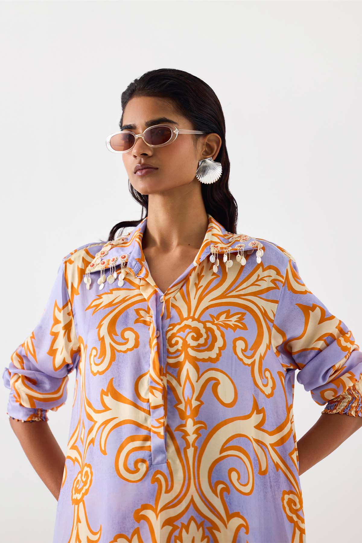 The mojito asymmetric shirt & skirt co-ord crafted from our stunning vegan silk fabrication , trans-seasonal, is a statement piece. The co-ord, made in our lilac damask print, has a relaxed fit. With full sleeves with ruching , the piece has front shell buttons and an embroidered collar. Featuring a summery look, it is paired with our mojito knot skirt with a drapey look. Wear it with heels for an elegant look.