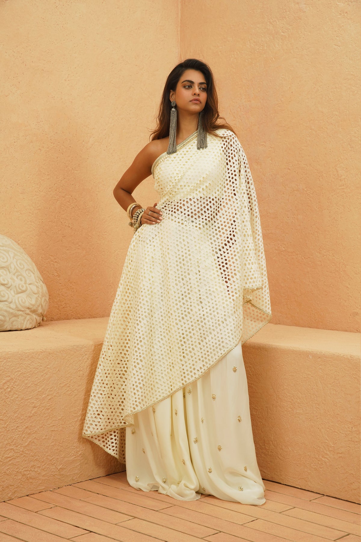 An elegant one-shoulder drape top featuring intricate cutwork detailing, creating a delicate yet bold statement. Paired with flowy embroidered pants, this ensemble exudes effortless grace with a modern take on traditional craftsmanship..