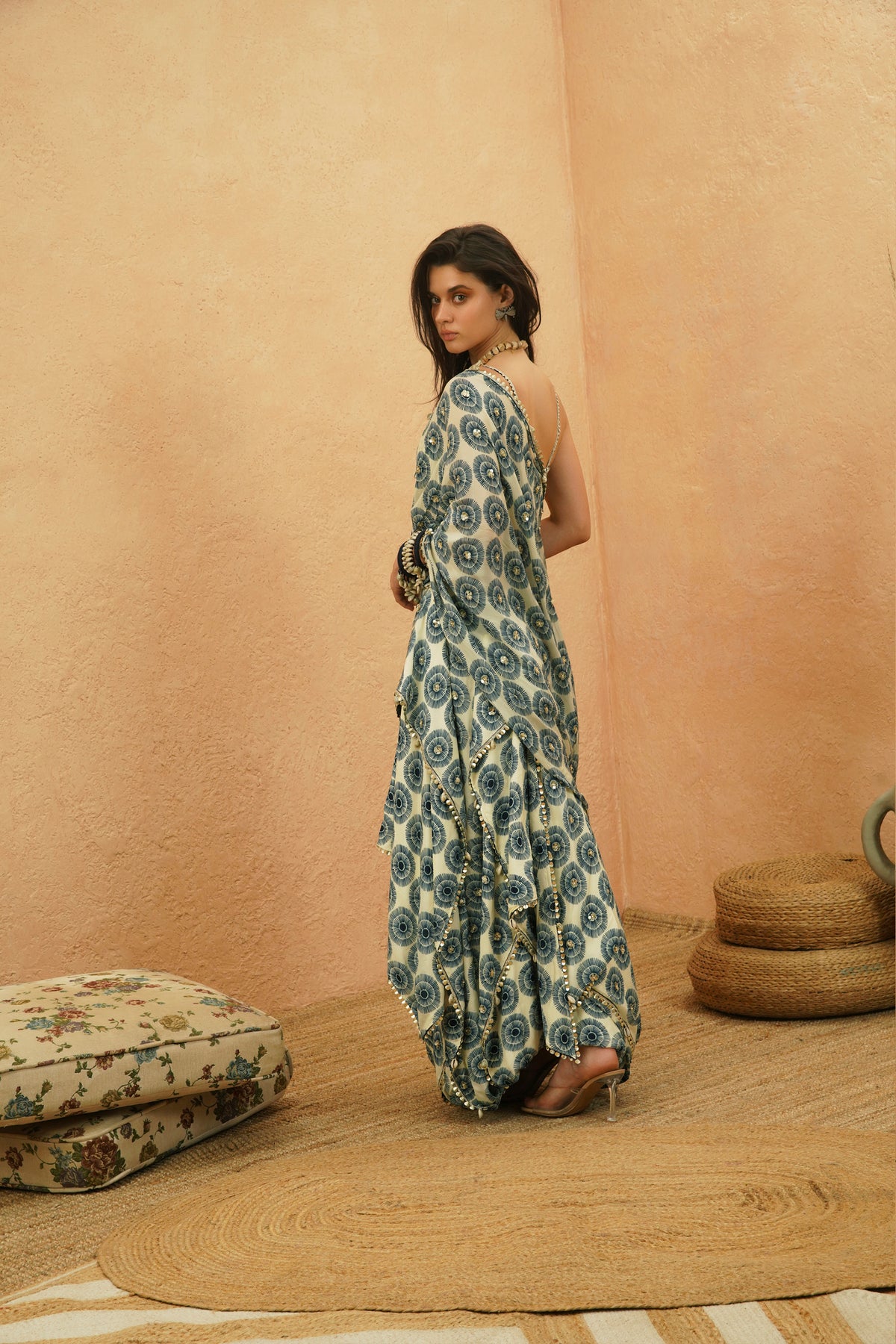 This contemporary drape saree features a protea floral print in muted indigo tones, creating a timeless yet modern aesthetic. Paired with a structured metallic bustier, the look blends traditional elegance with edgy sophistication. The ruffled drape adds fluidity, while shell and metallic accessories enhance its bohemian appeal..