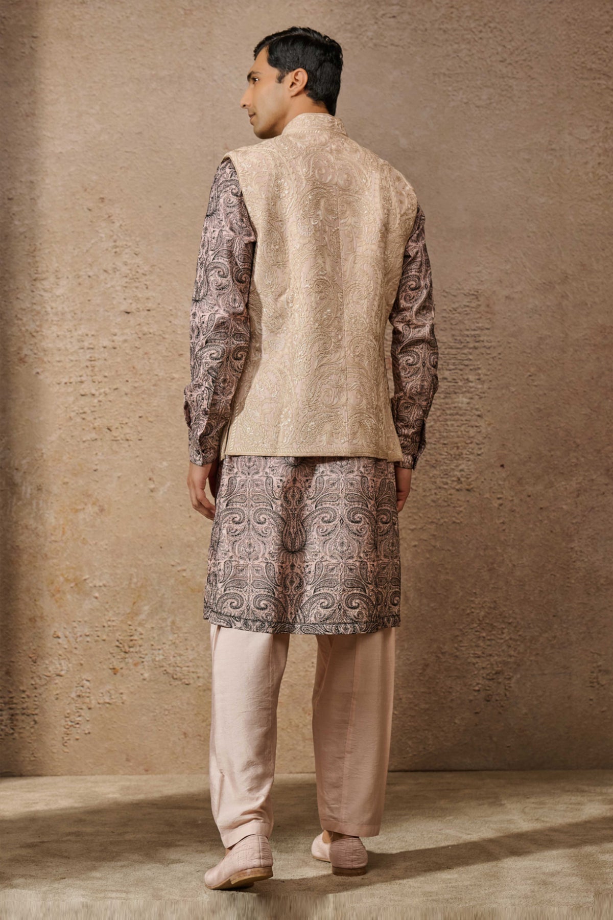 A paisley embroidered waistcoat, featuring tonal dori and aari embroidery. Waistcoat paired with a self texturted kurta and salwar.