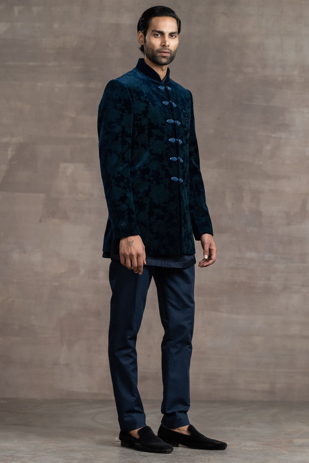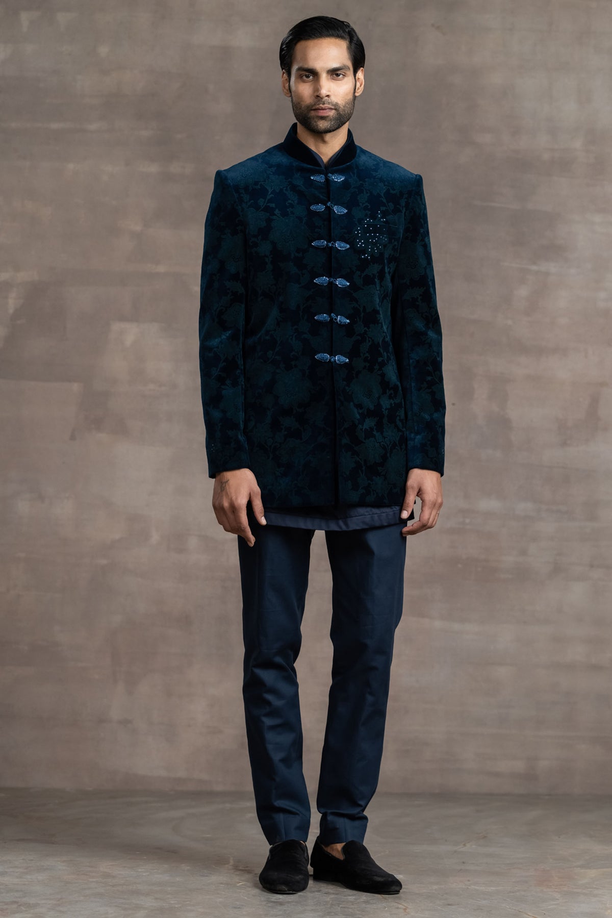 Blue etched sherwani with swarovski crystal detailing, frogging buttons paired with a kurta and trouser