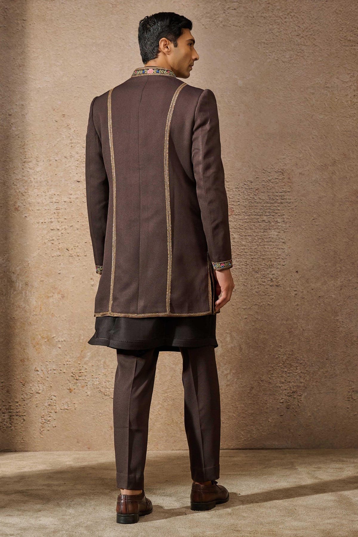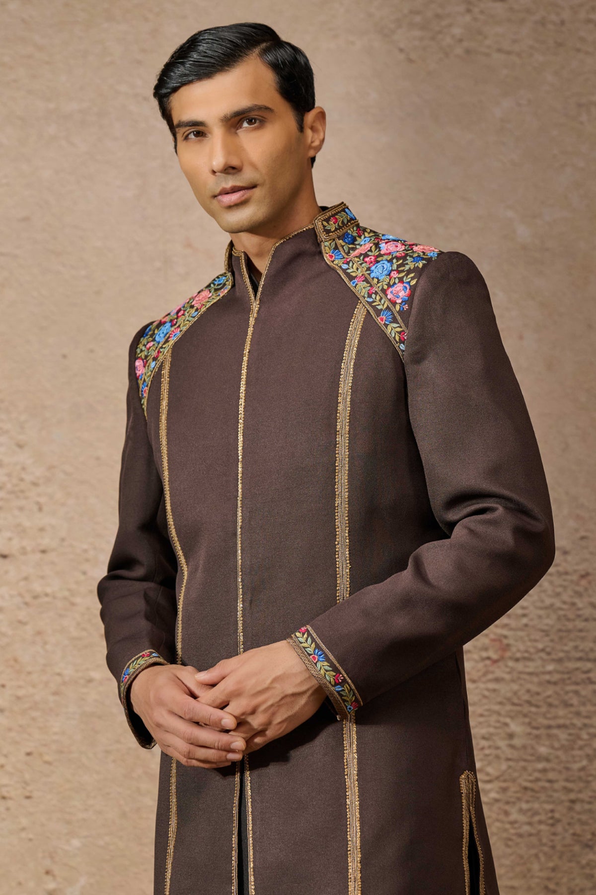 A wool crepe paneled short sherwani, featuring handcrafted floral motifs, embroidered with multicoloured threads and intricate french knots, paired with an antique hand embroidered jawa.