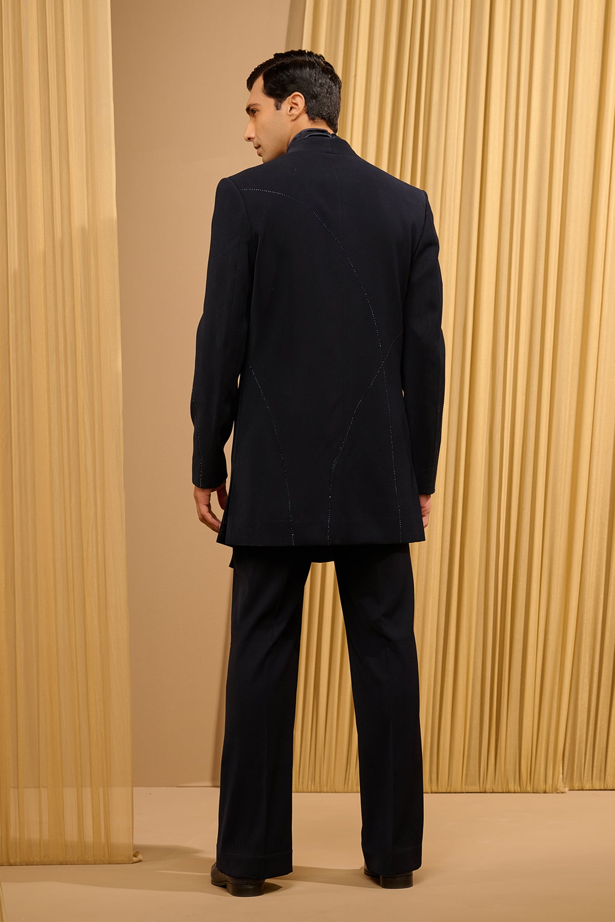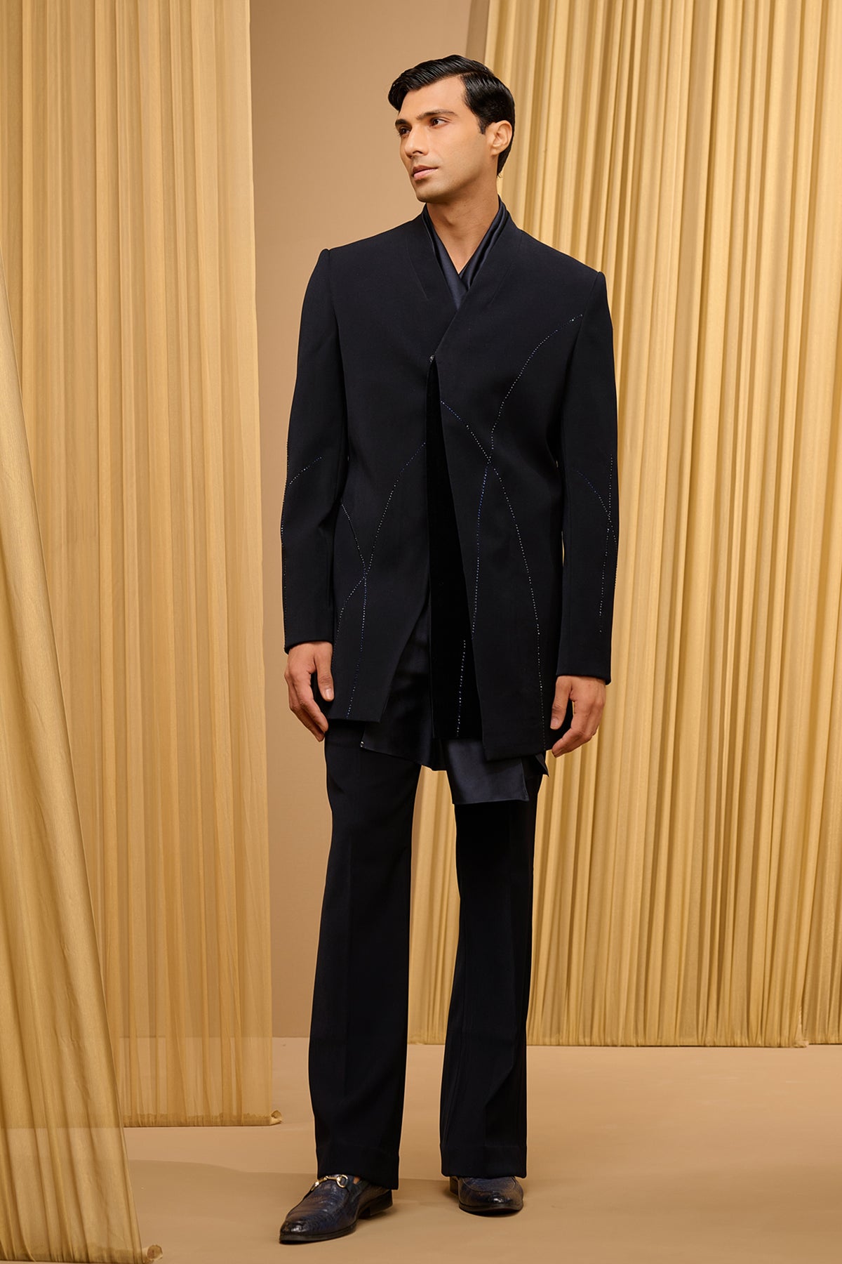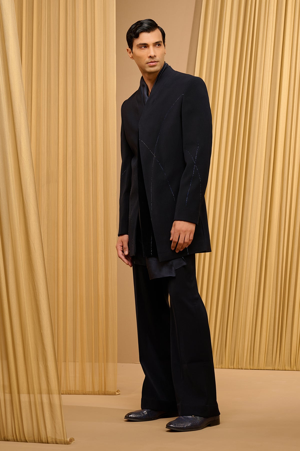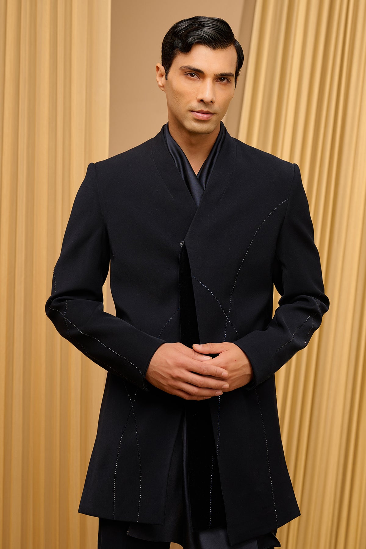 A contemporary short sherwani, featuring asymmetrical dual panels, accentuated with tonal diamonds, paired with a drape classic kurta and classic flared trousers.