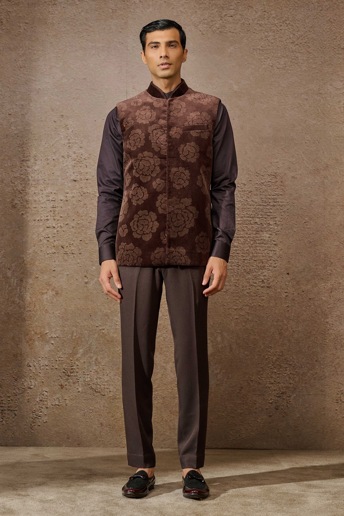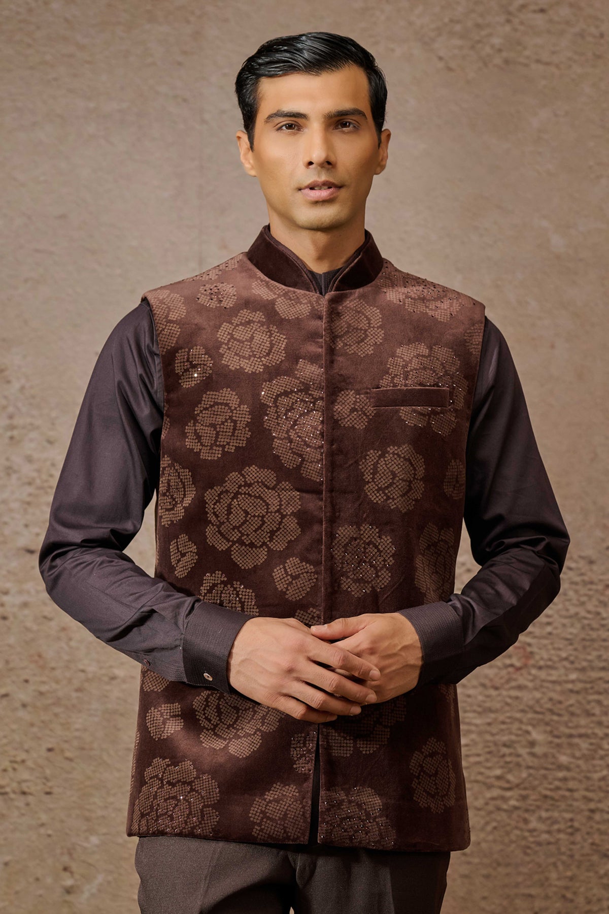 A classic waistcoat in cotton velvet, featuring etching technique over pixeled floral patterns. Waistcoat is paired with a draped kurta and classic trouser.