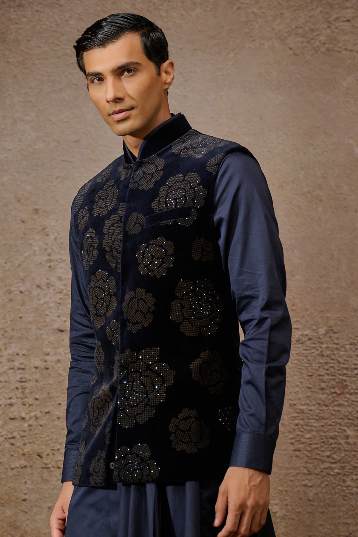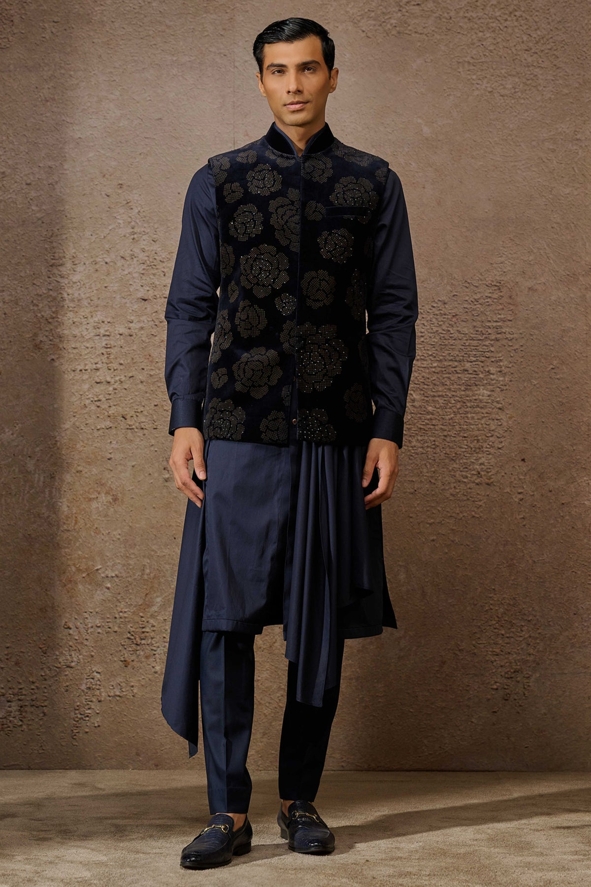A classic waistcoat in cotton velvet, featuring etching technique over pixeled floral patterns. Waistcoat is paired with a draped kurta and classic trouser.