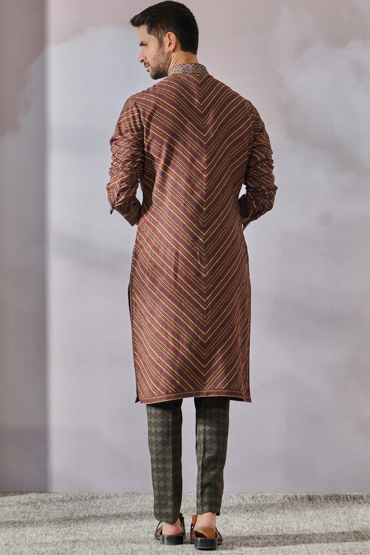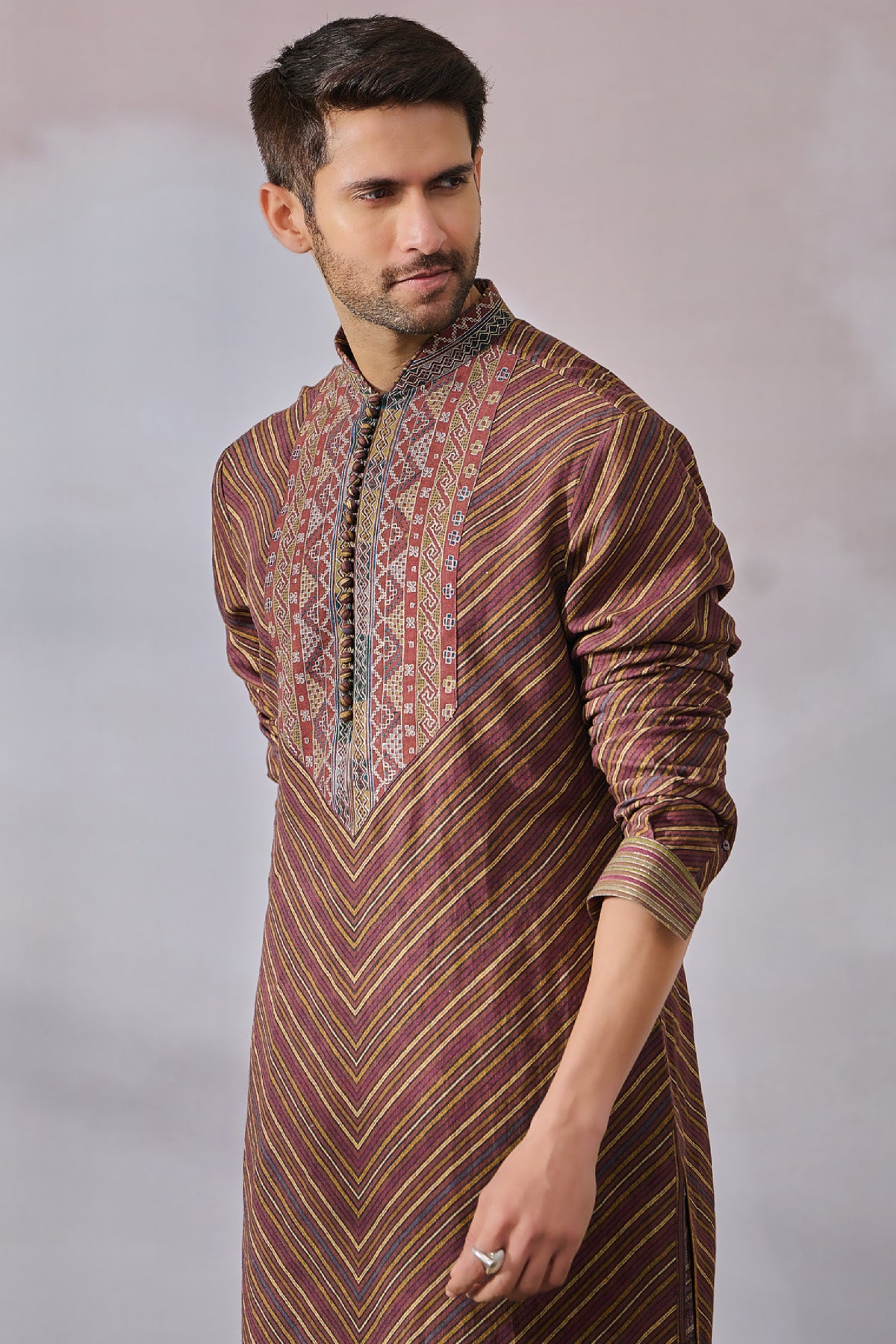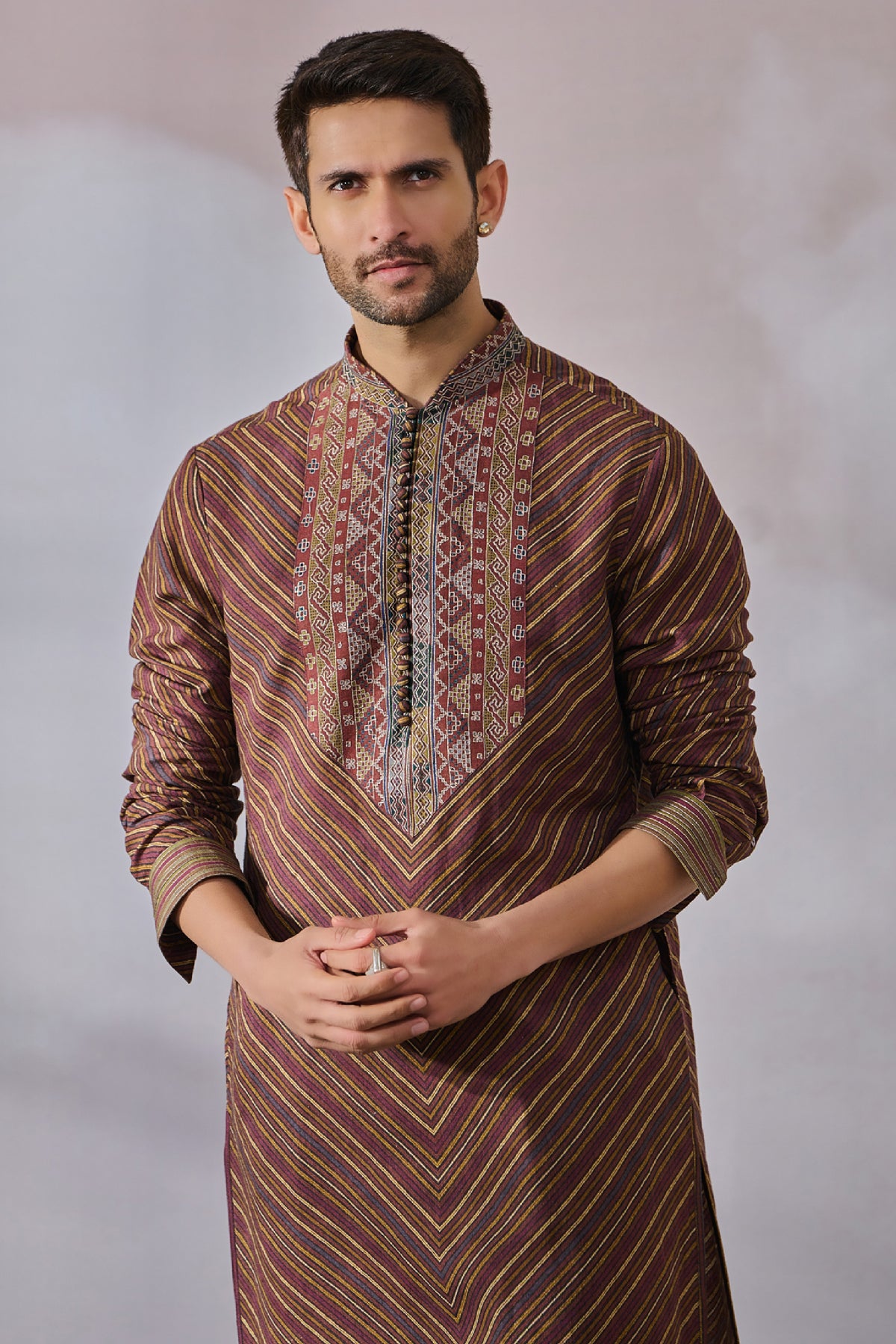 Printed kurta highlighted with thread work embroidery and is paired with trousers.