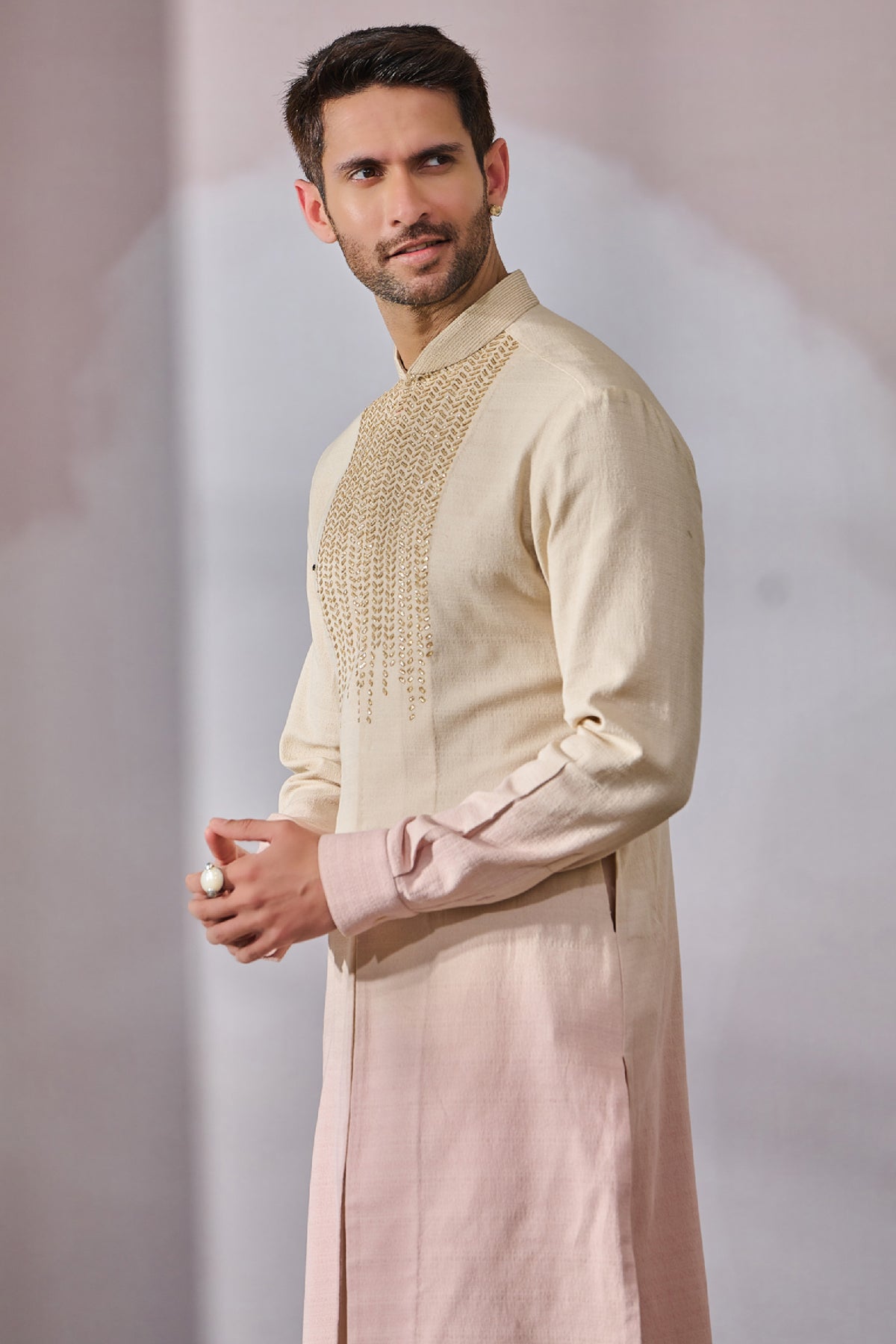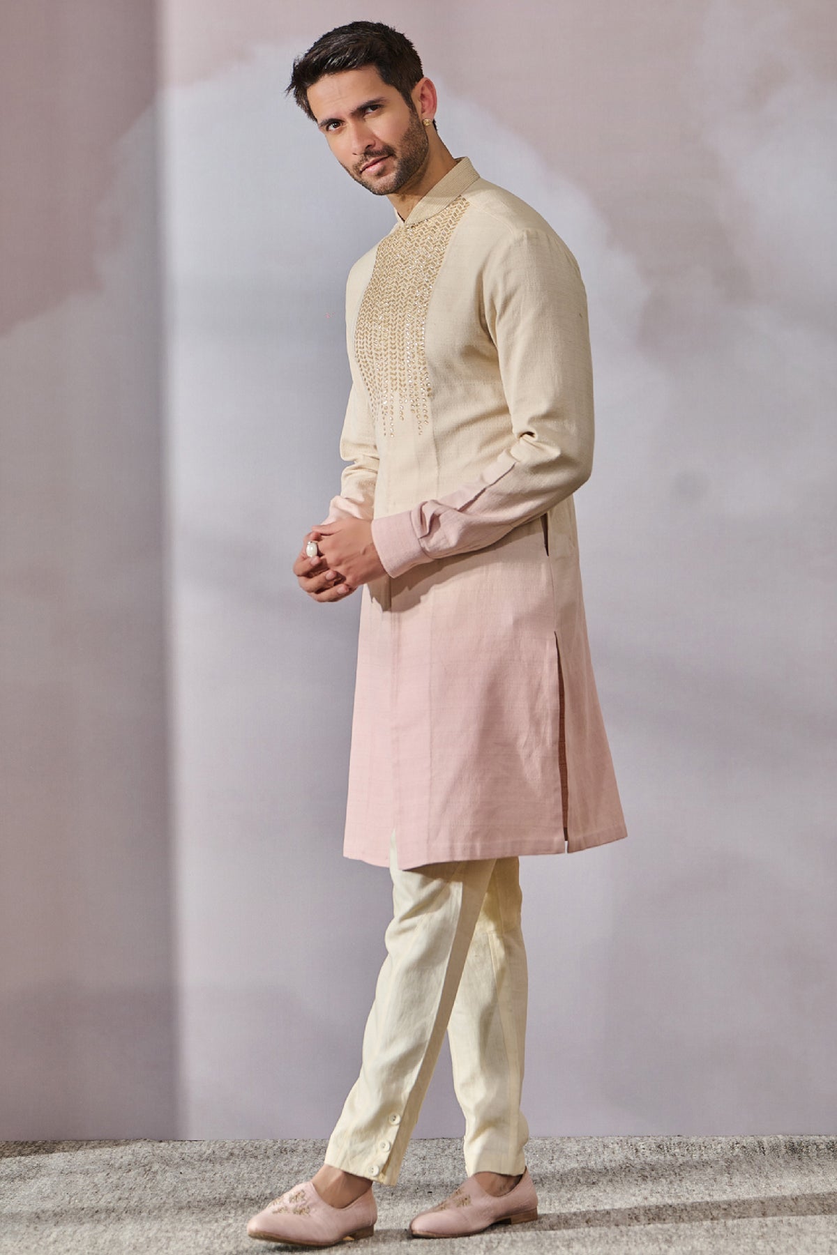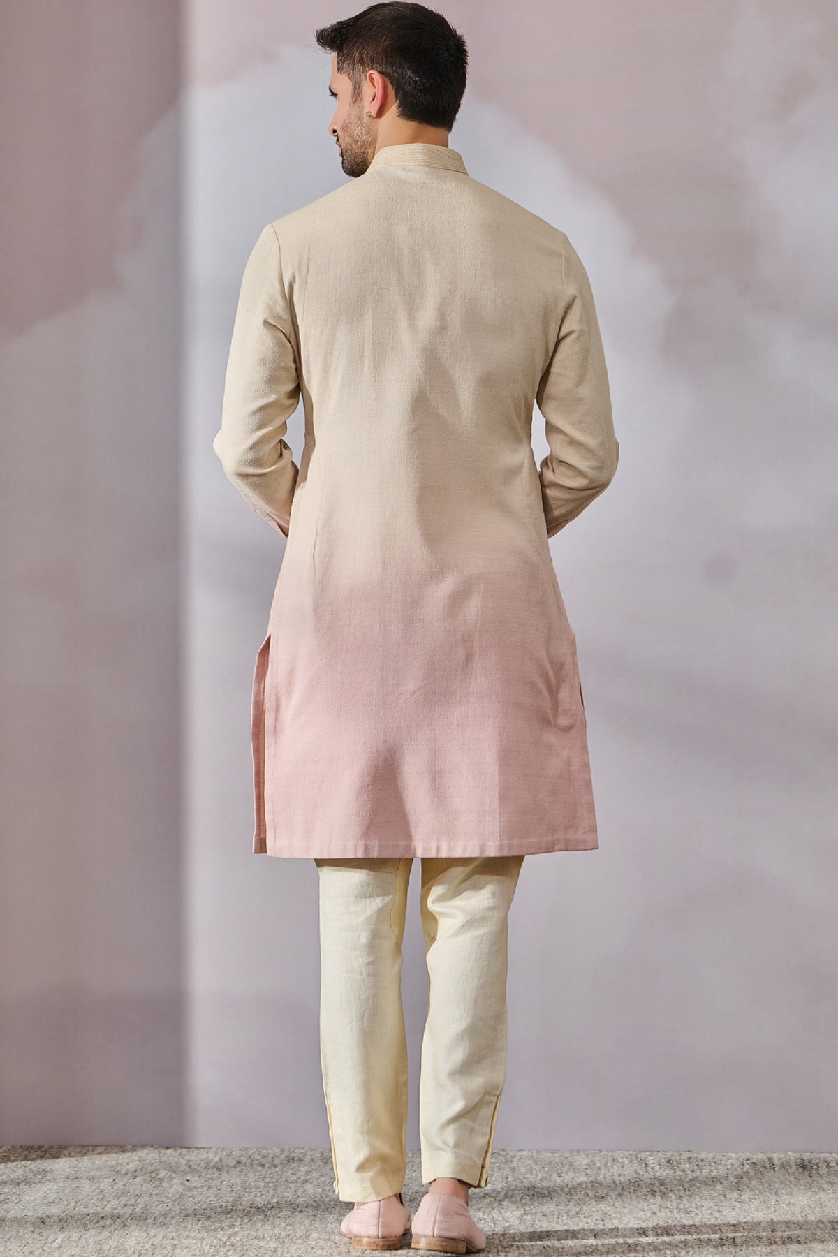 Classic ombre kurta with a hand embroidered abstract yoke and is paired with trousers.