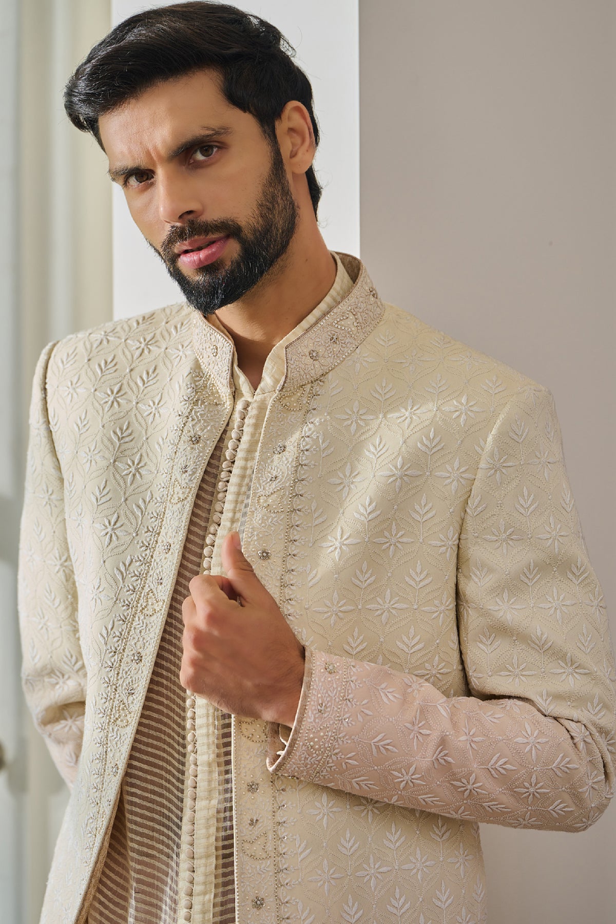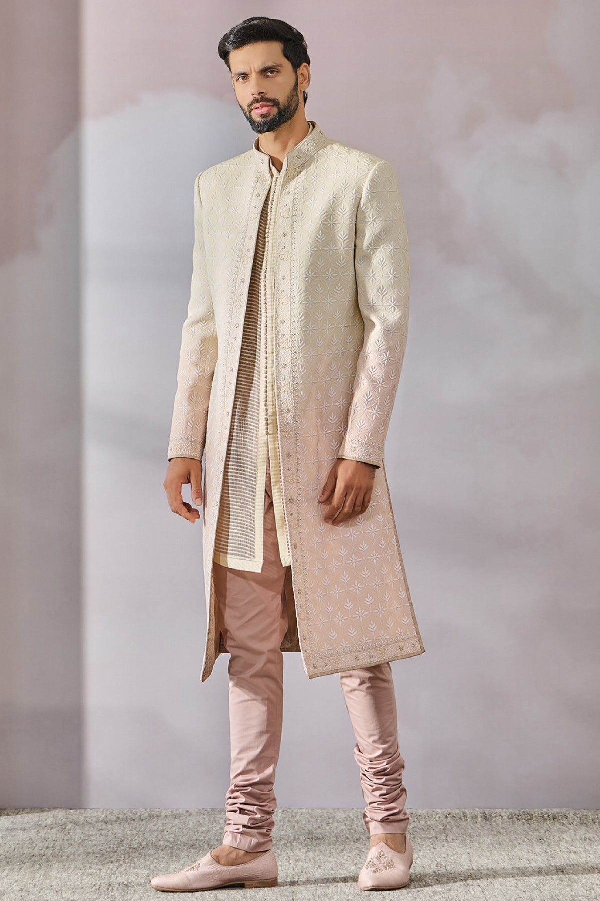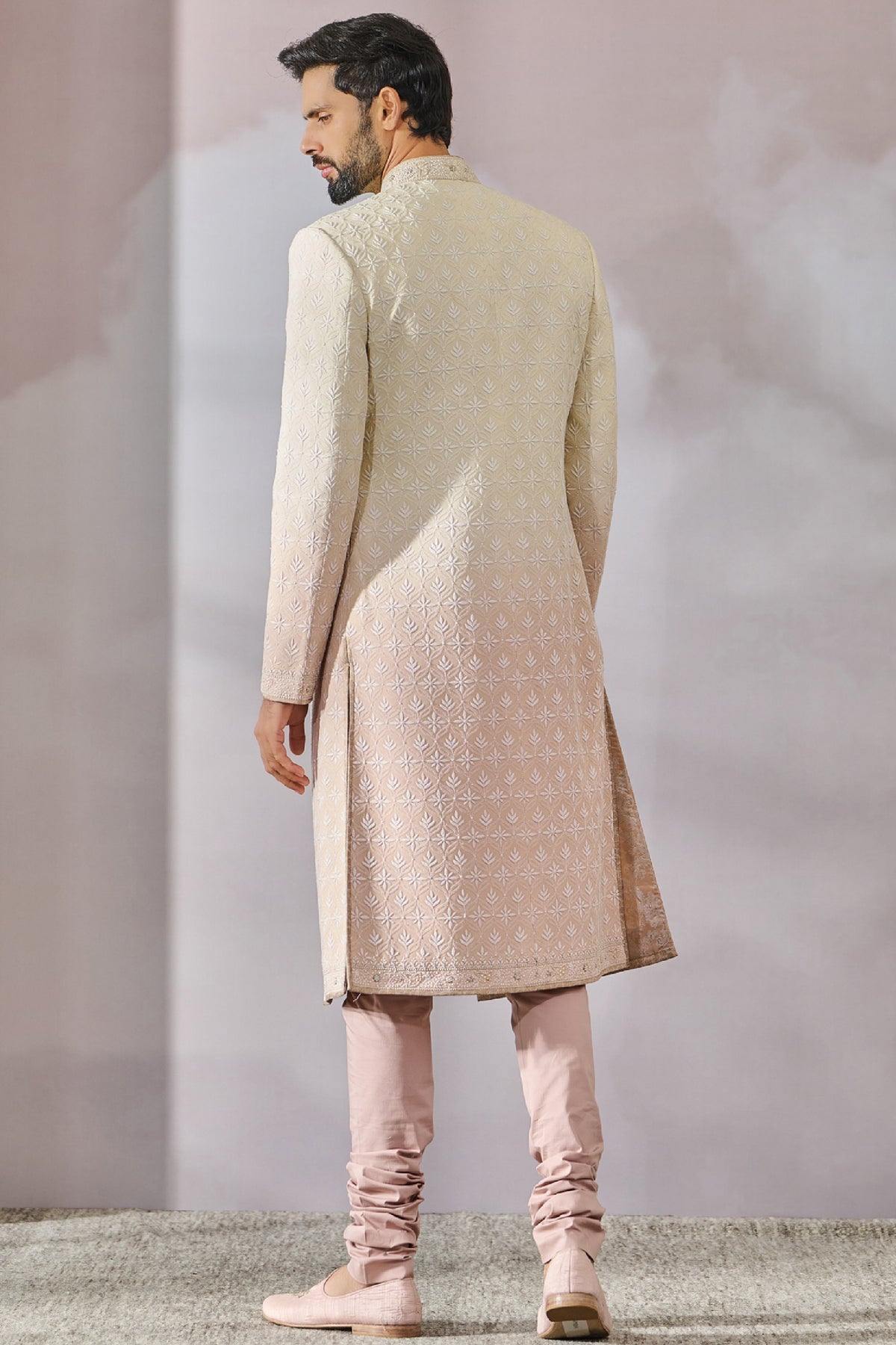 Ombre colour treated sherwani with thread work embroidery and is paired with a kurta and churidar.
