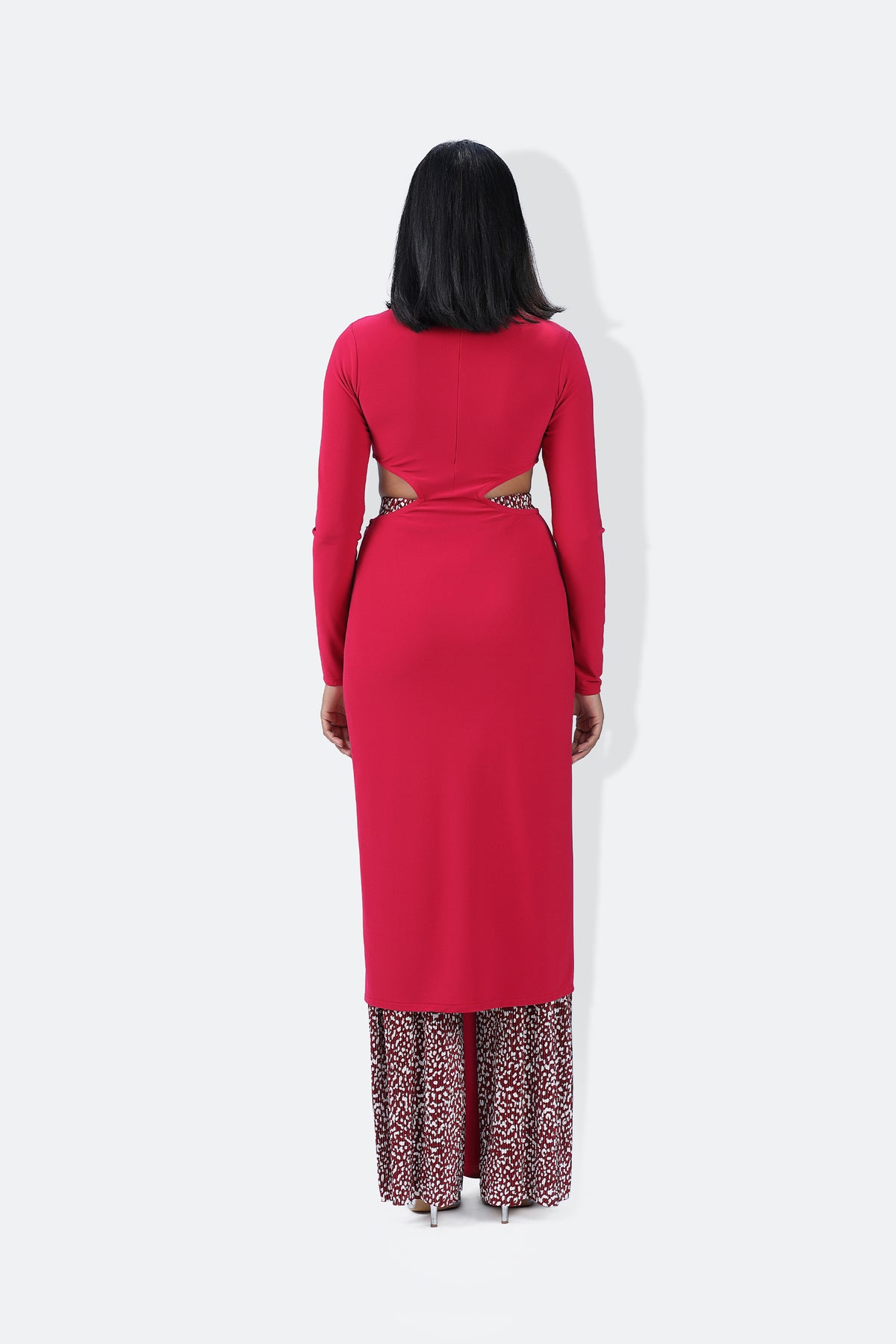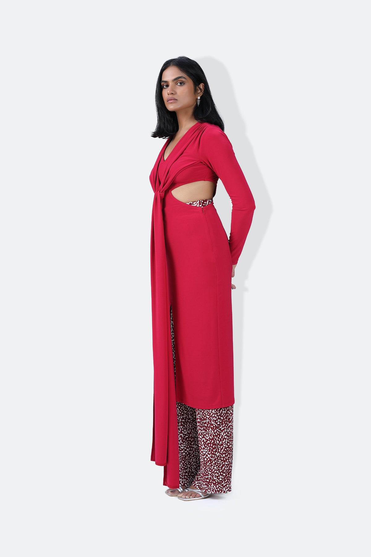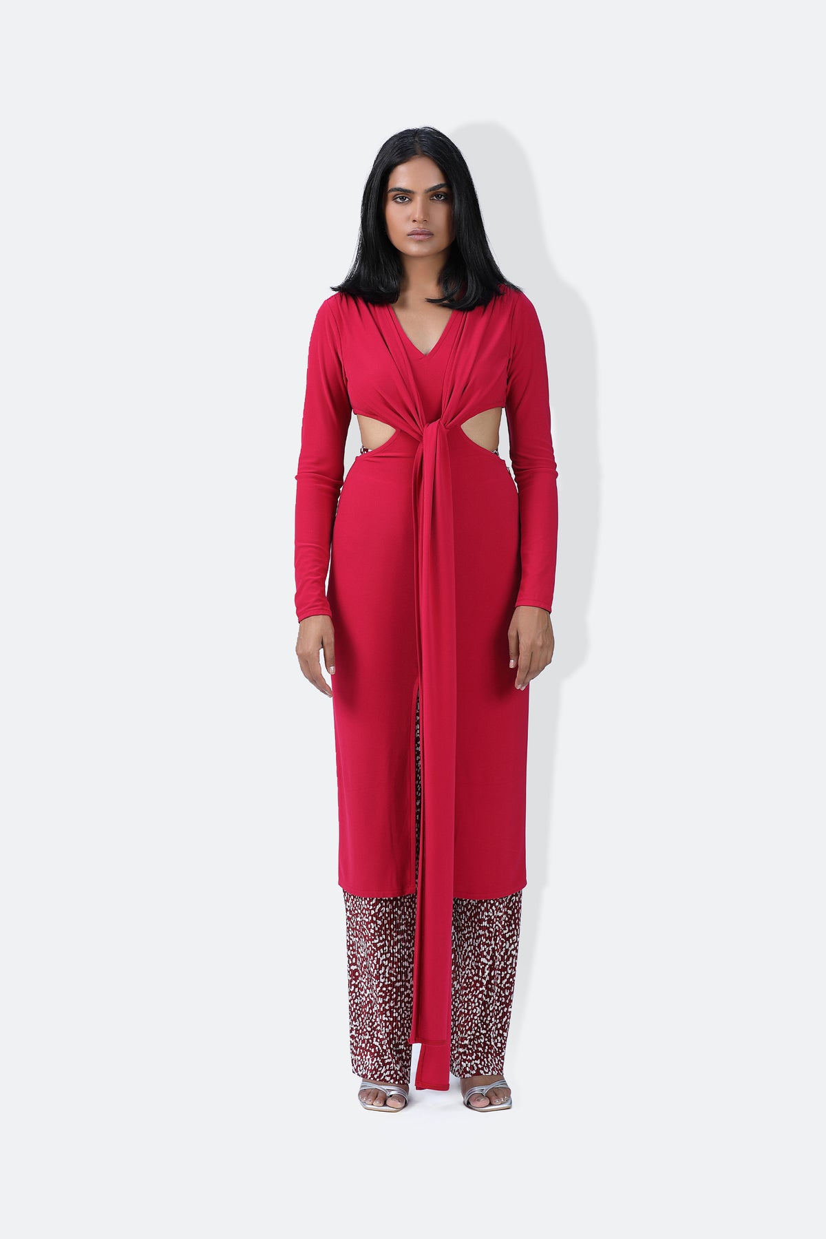 The donna dress is constructed with a very minimal cutout detail on the sides with a tie up detail in center. It’s a full sleeve ,calf length dress in lycra fabric which is a perfect essential for your wardrobe.
