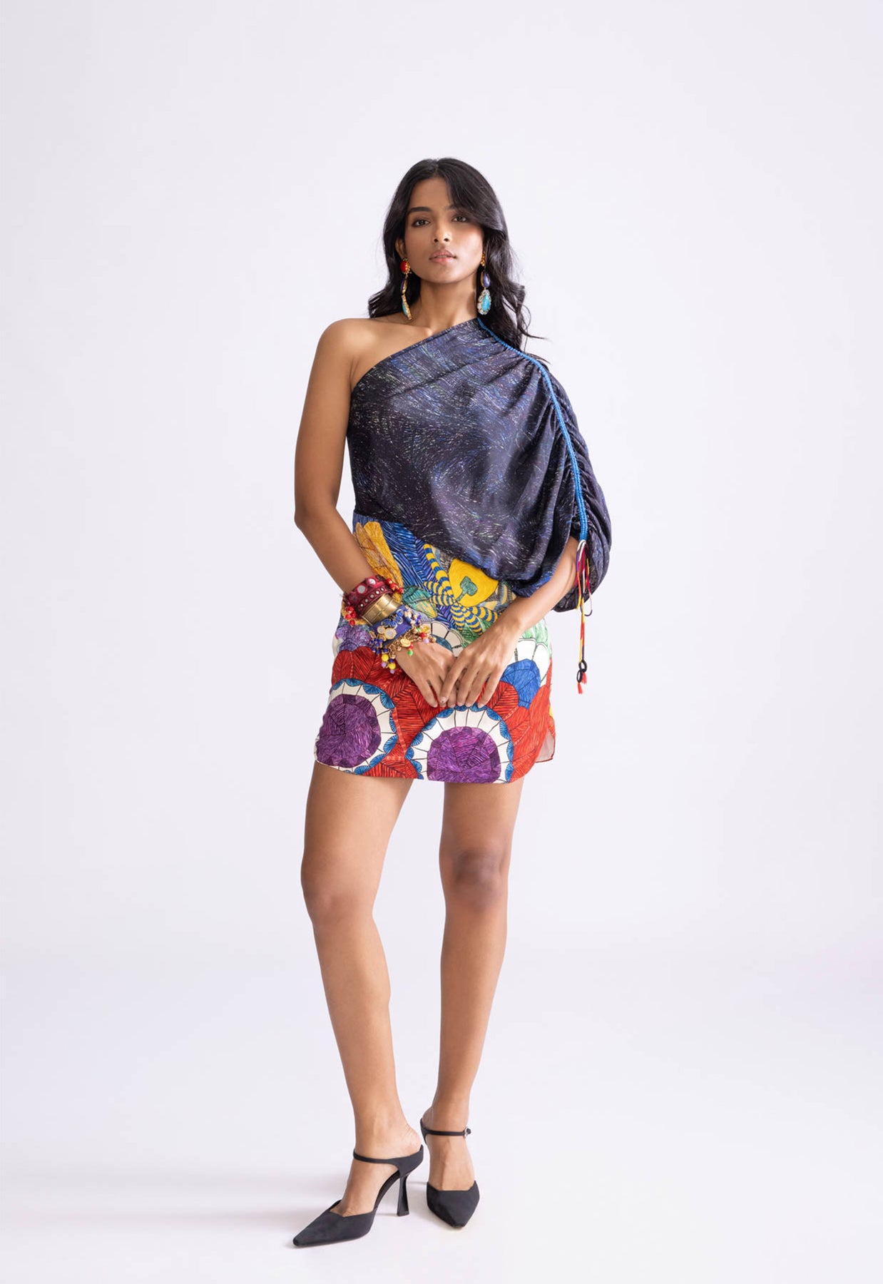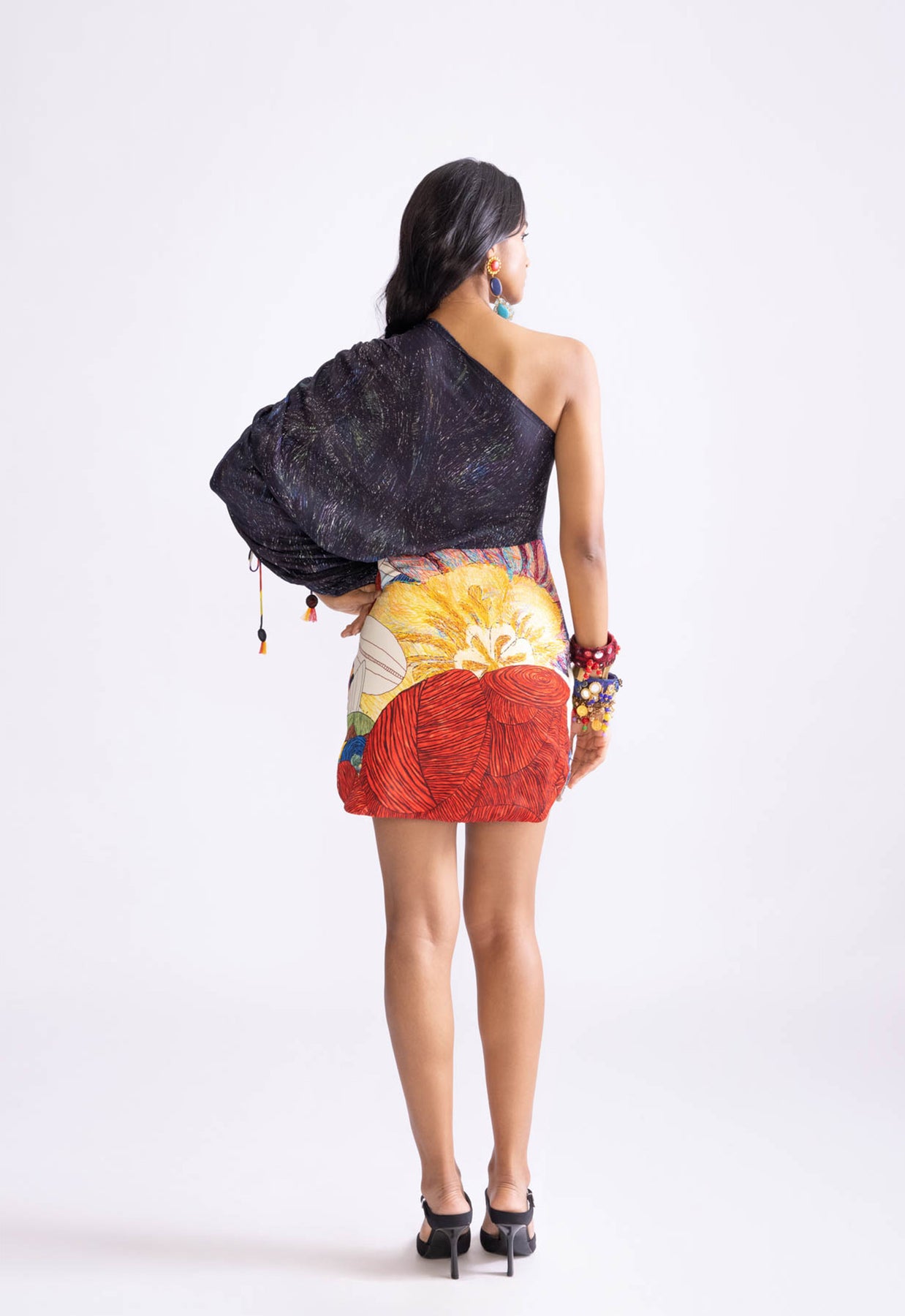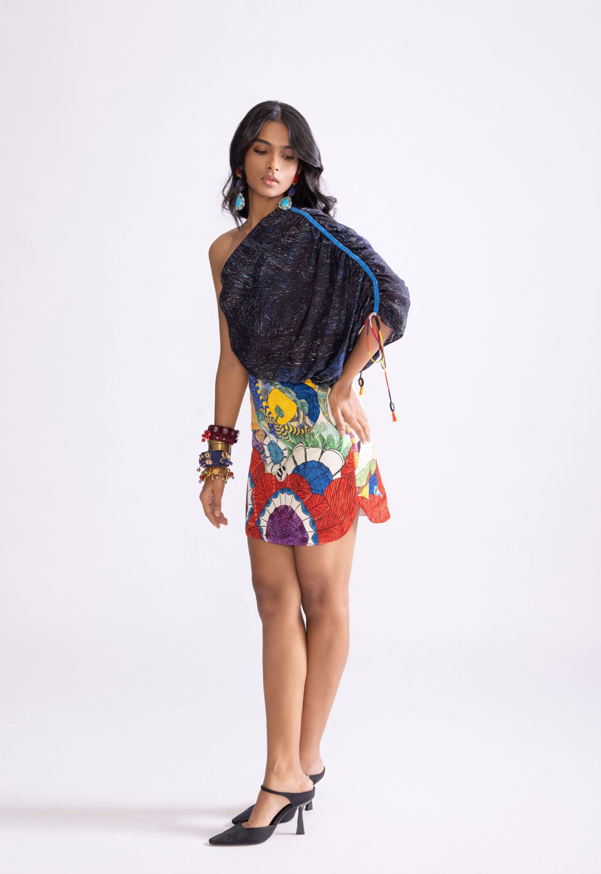 Dual wave and tribal print mini dress with draped bodice and adjustable drawstring kaftan style sleeve