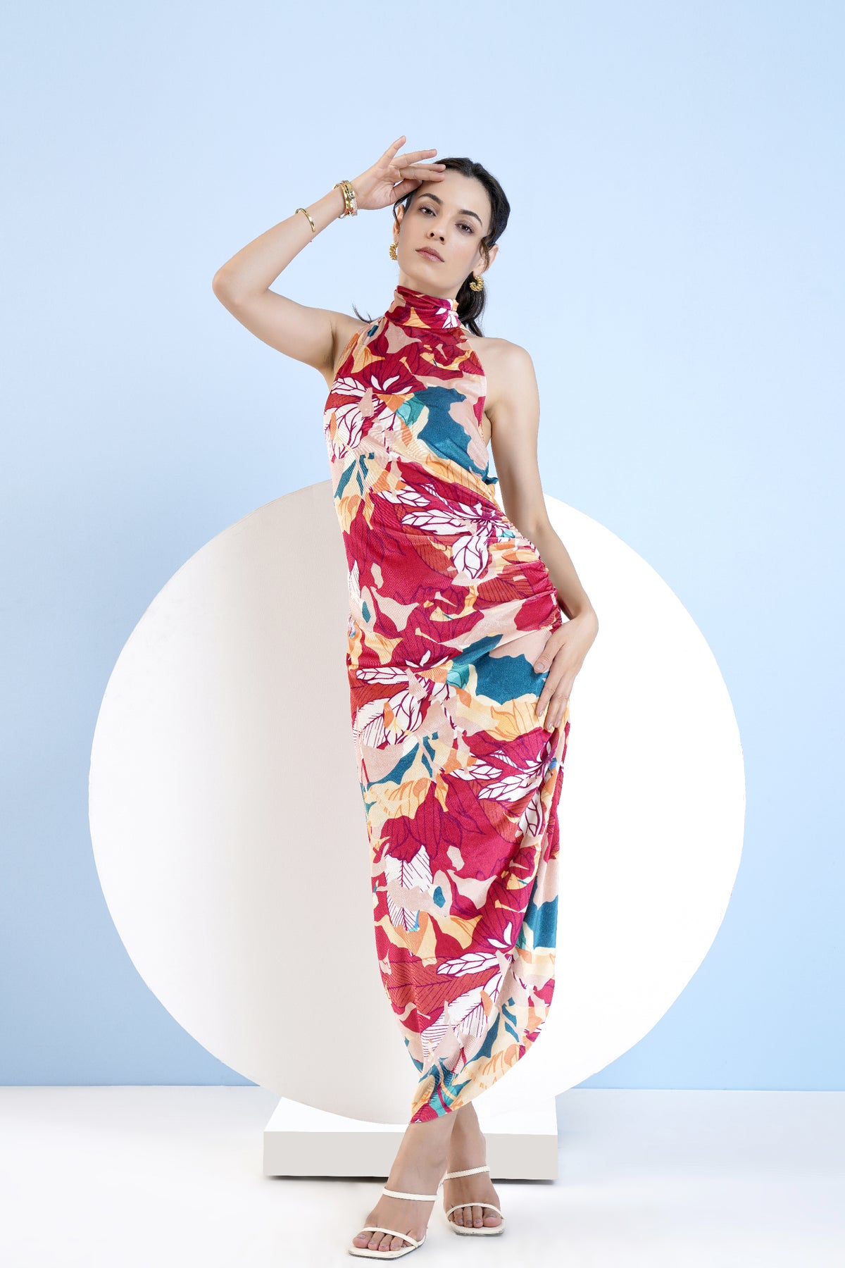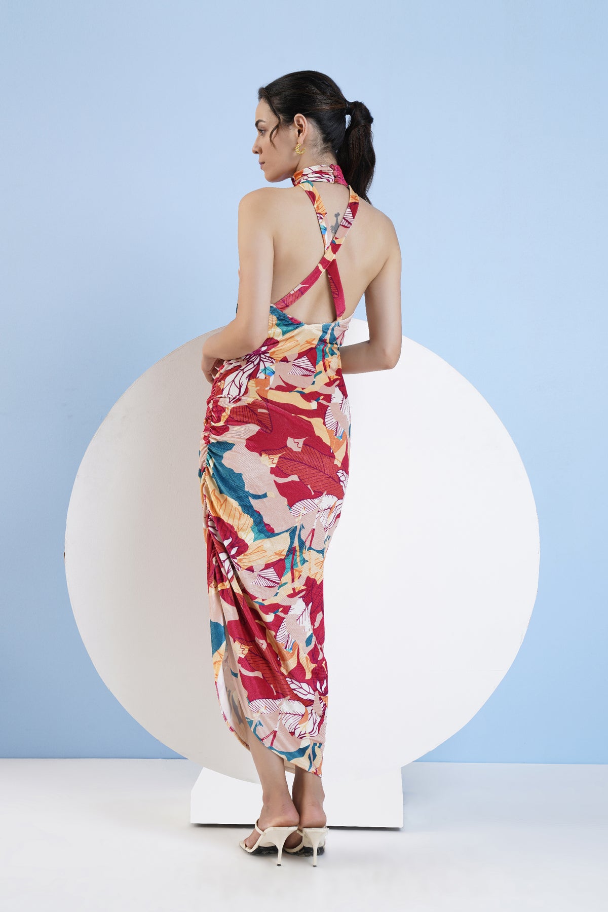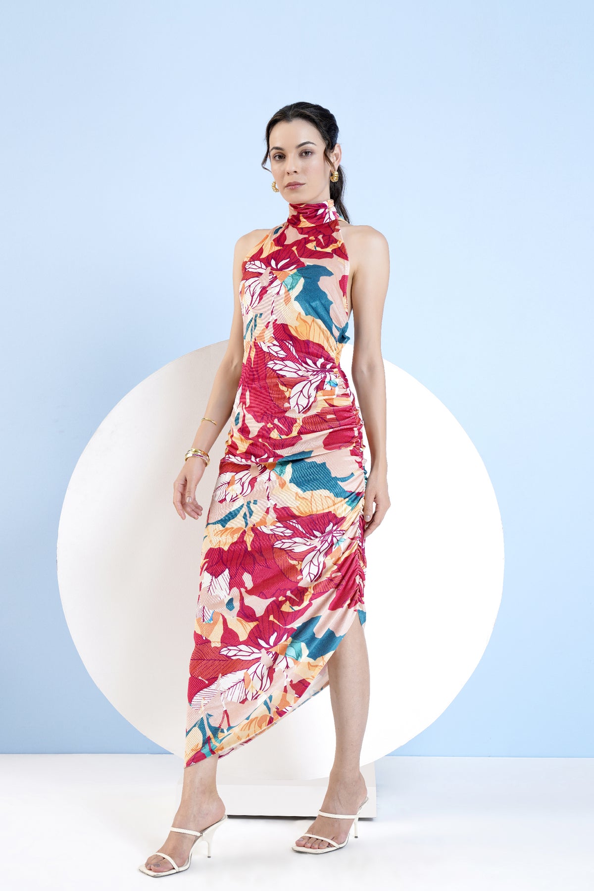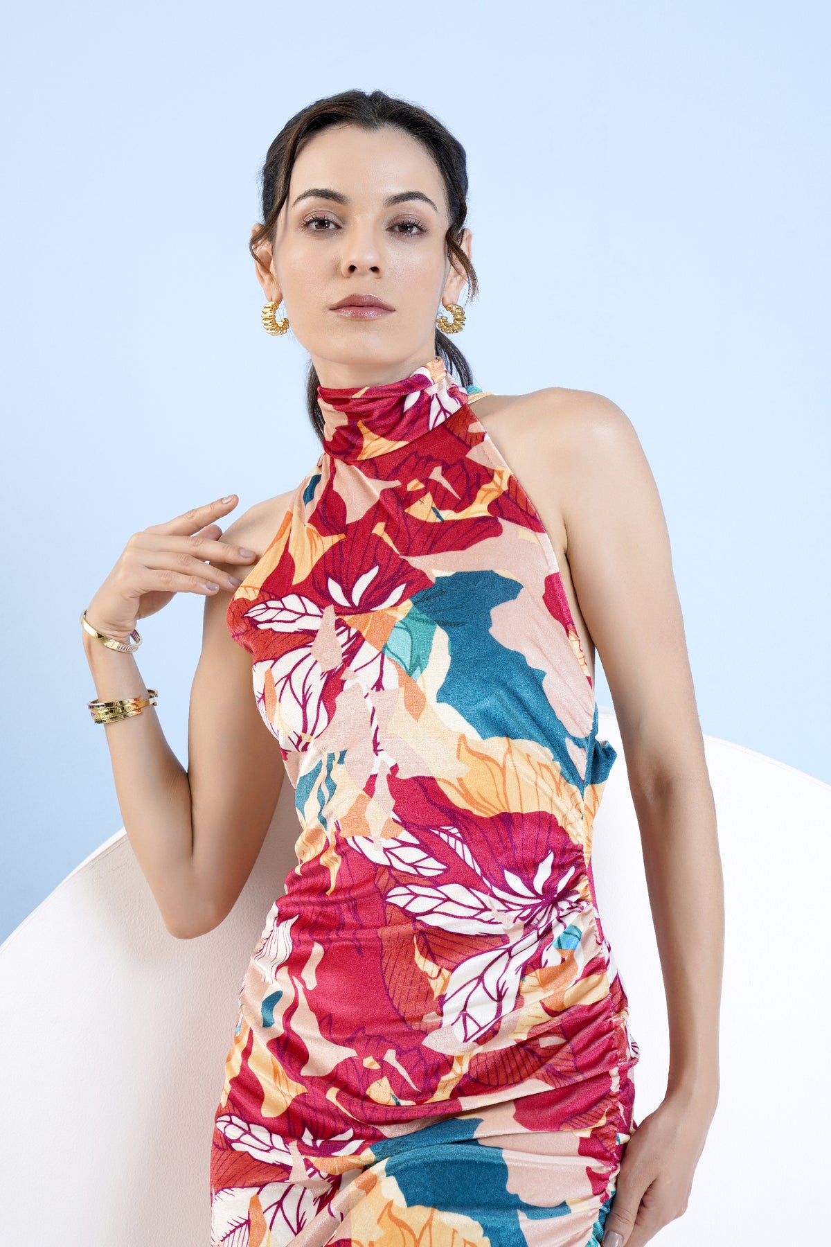 Halter neck fitted dress in velvet featuring high neck and side elasticated gathers