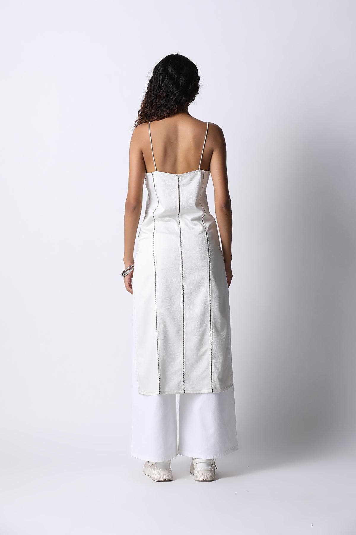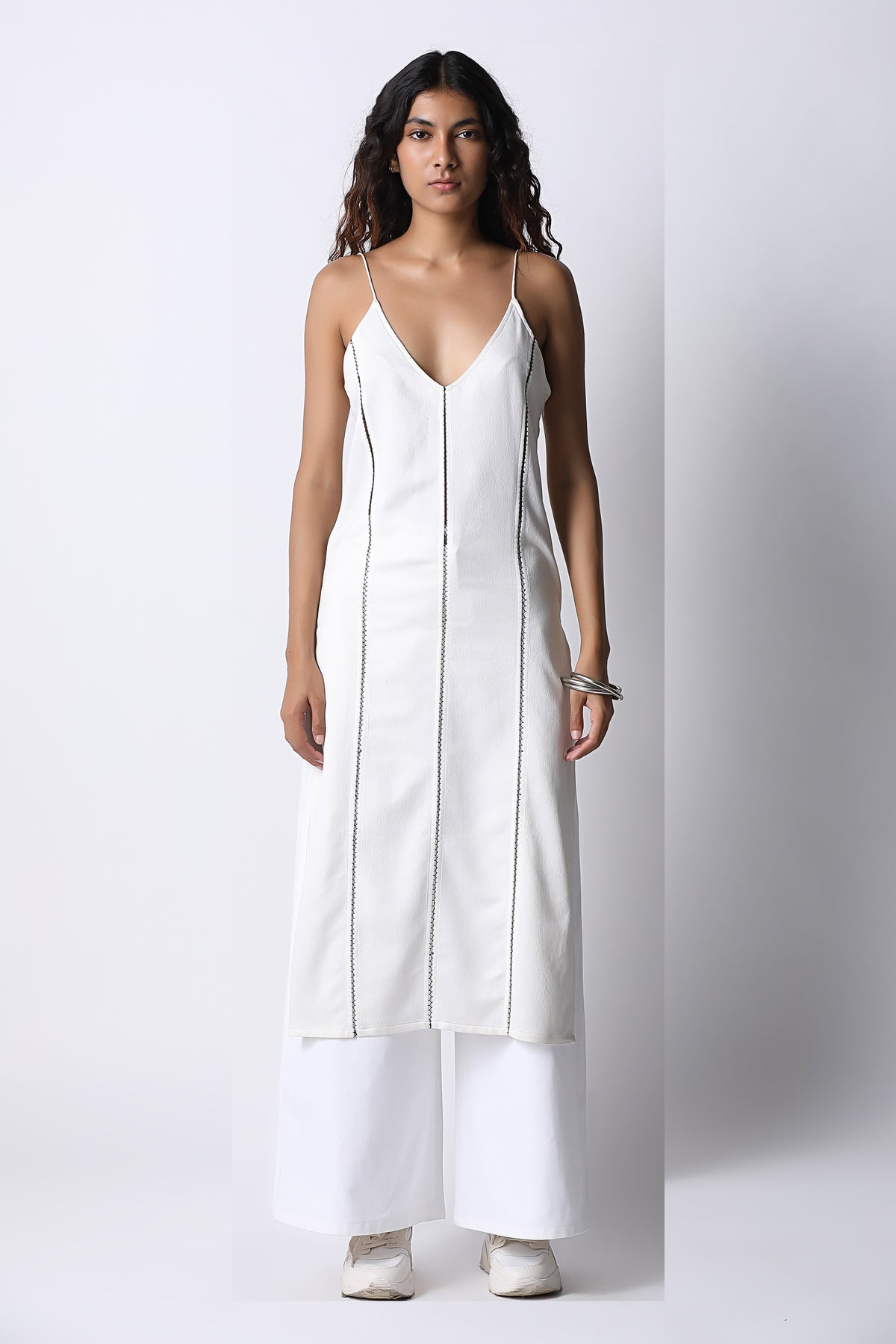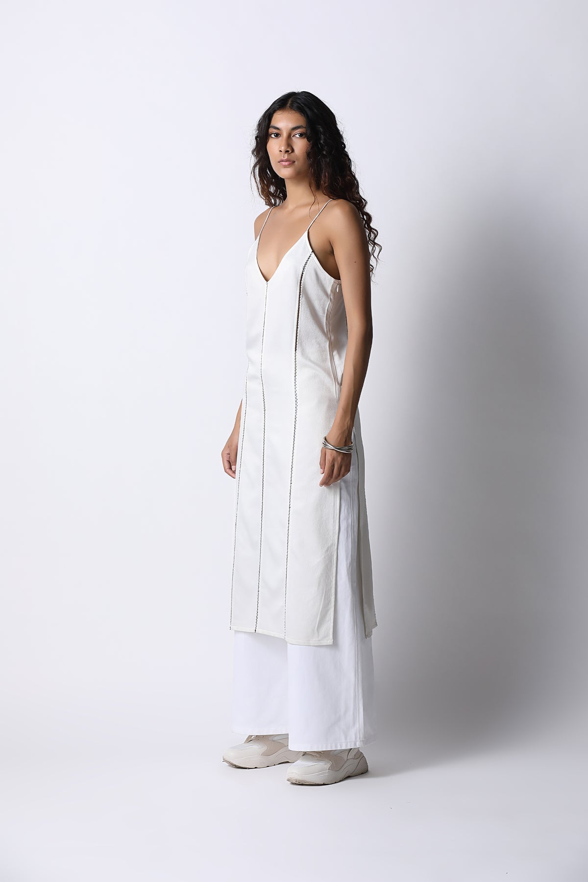 The ease of a classic slip dress, but elevated with panels seamed together with delicate hand embroidery. The jaali slip dress comes with a deep v neckline, dainty straps and slits along the side. Just slip it over pants, jeans or wear as is.
