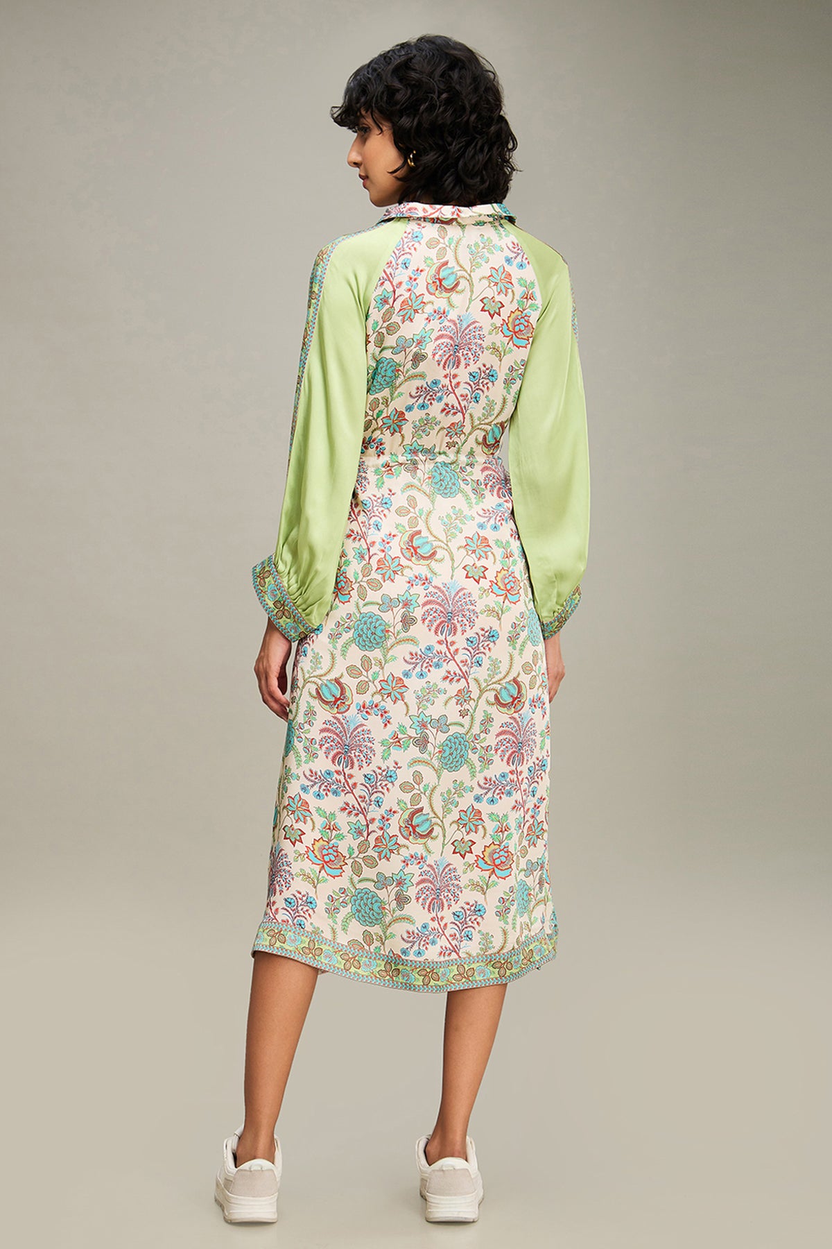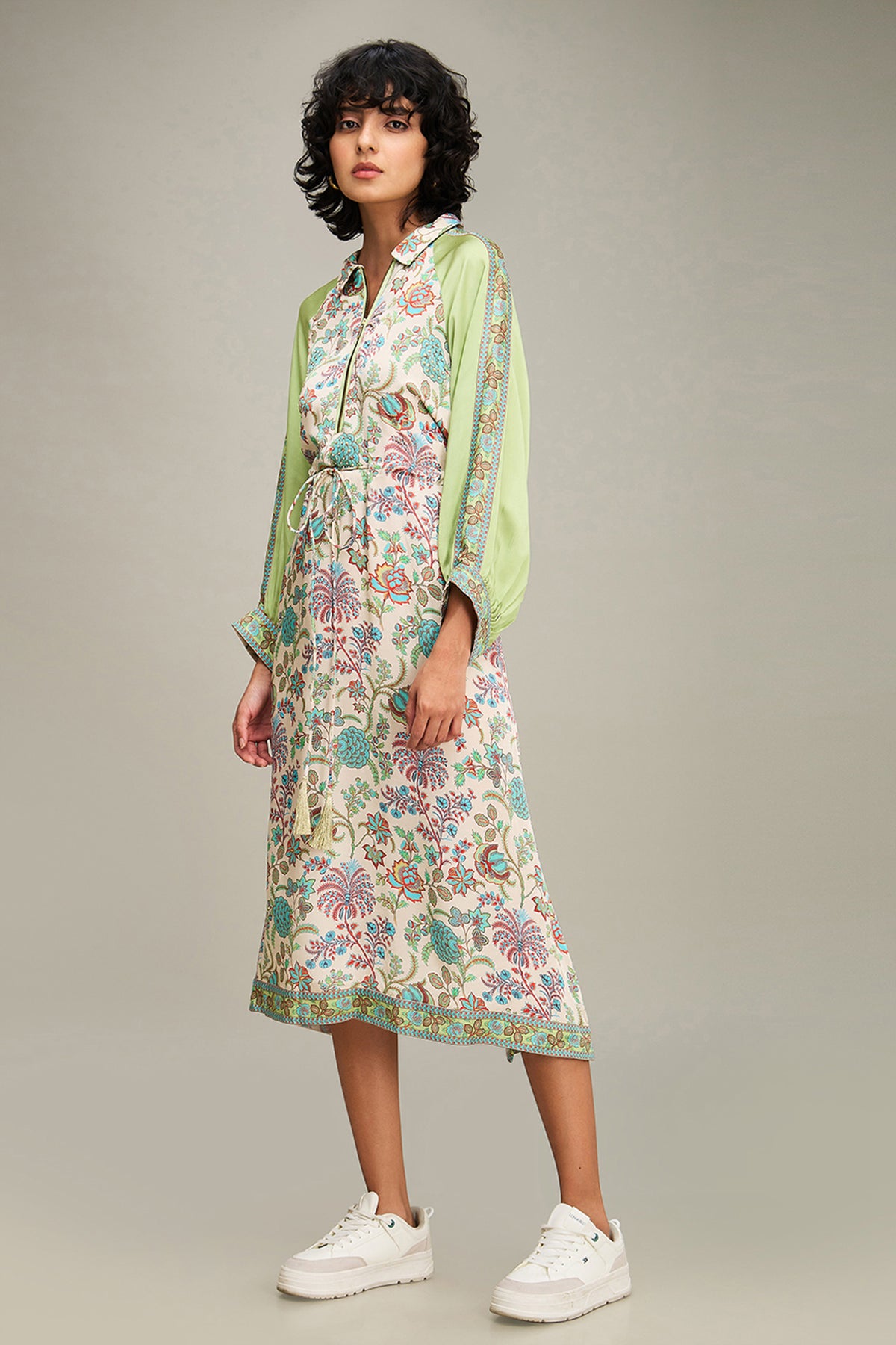 Multicolor embellished a-line flared long dress with waist tie-up in satin.