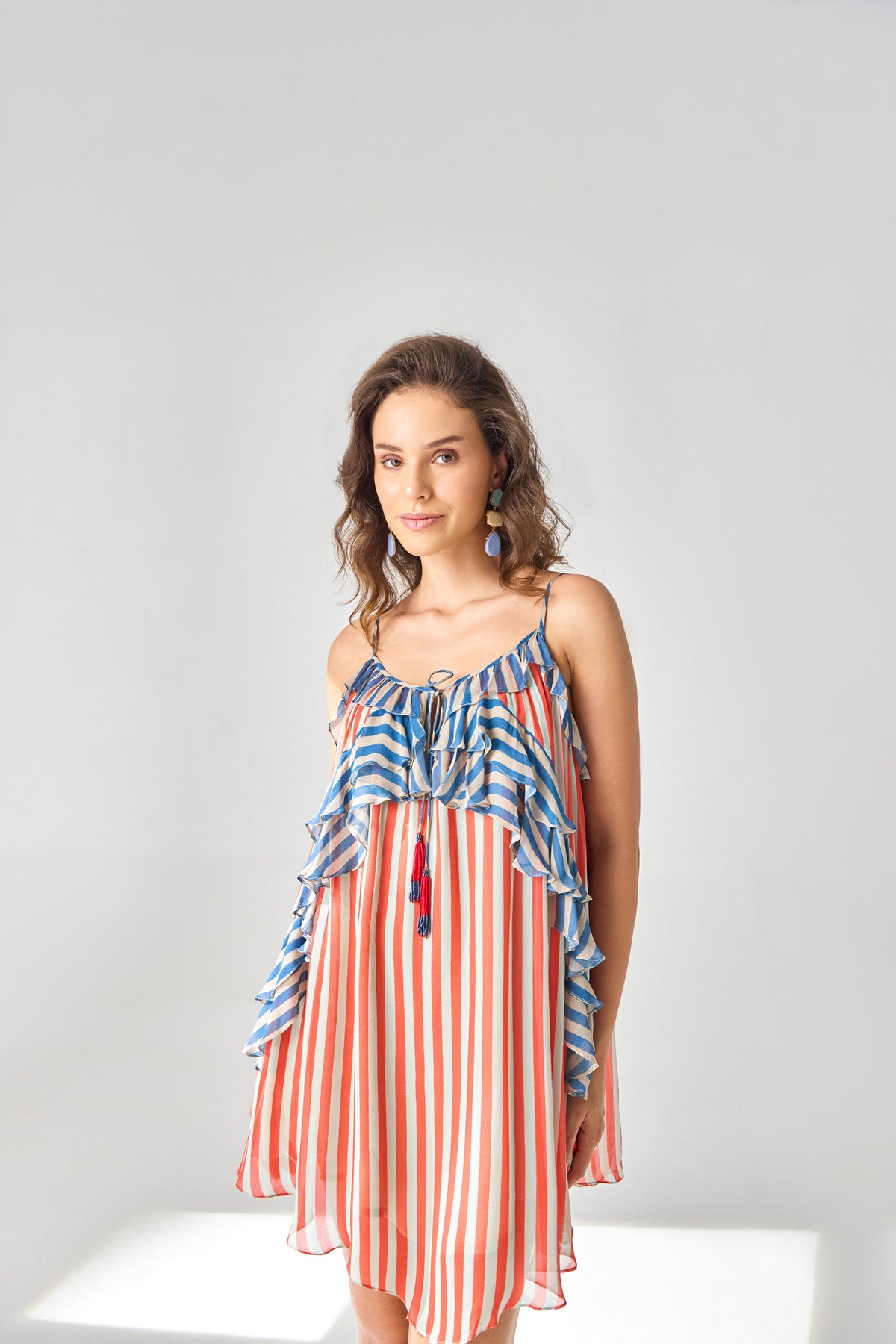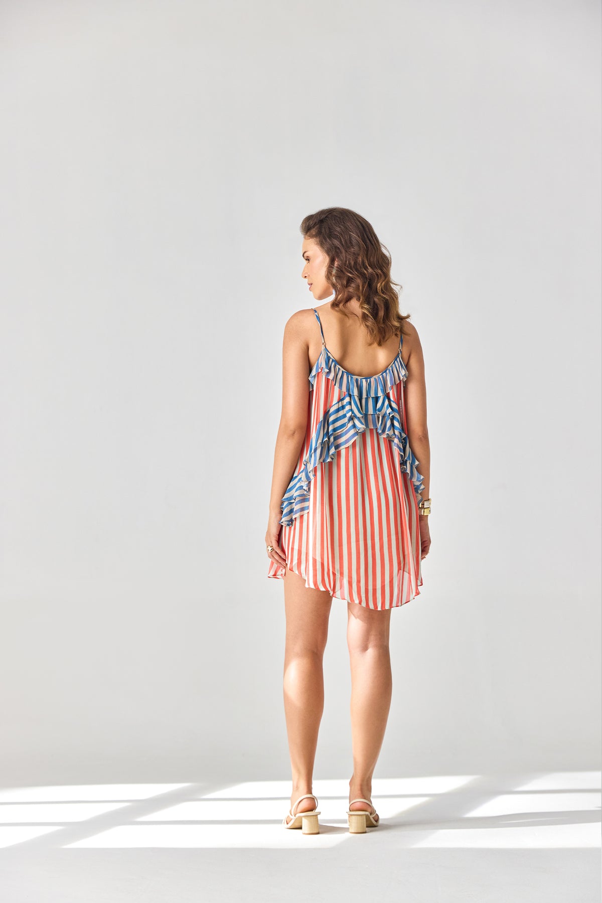 Multi stripe printed asymmetrical ruffle detailing short tunic
